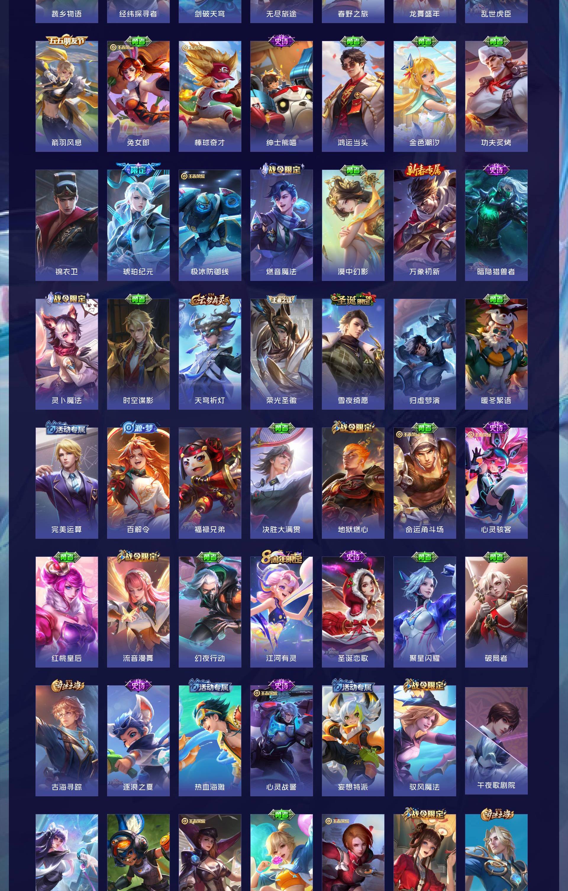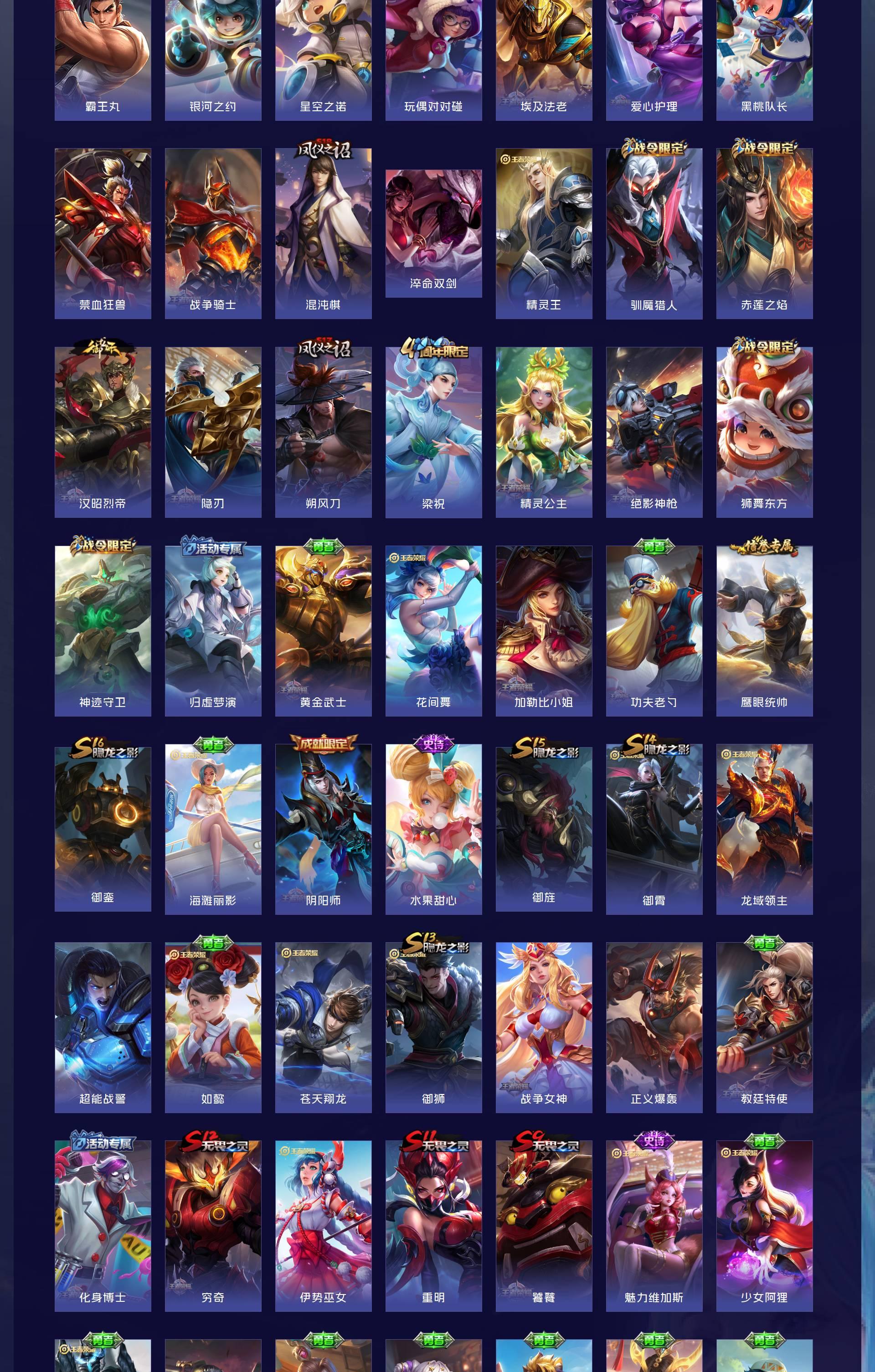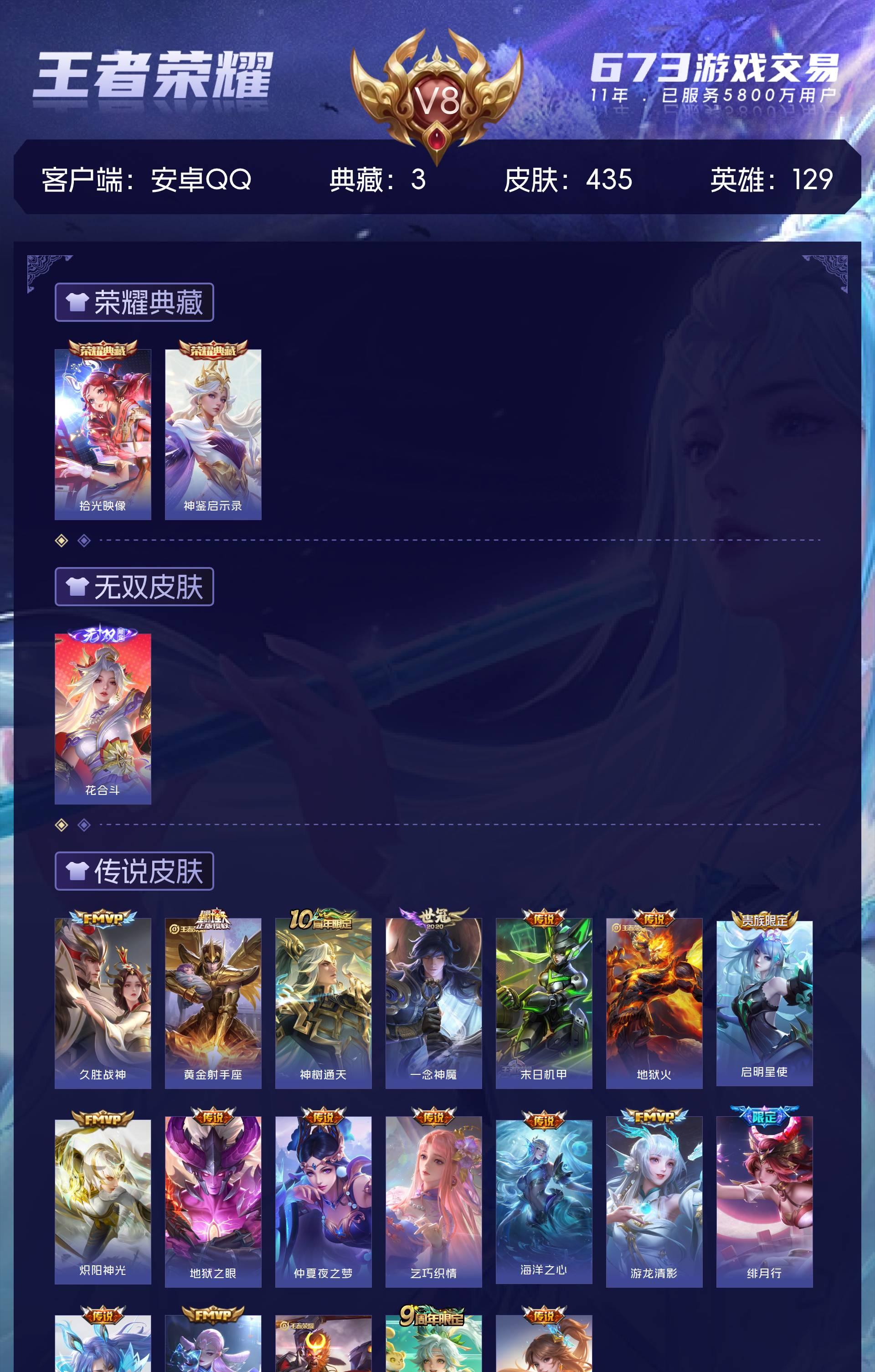 V8 皮肤435 英雄129 至尊星耀 荣耀典藏3 无双皮肤1 传说19 其他皮肤419