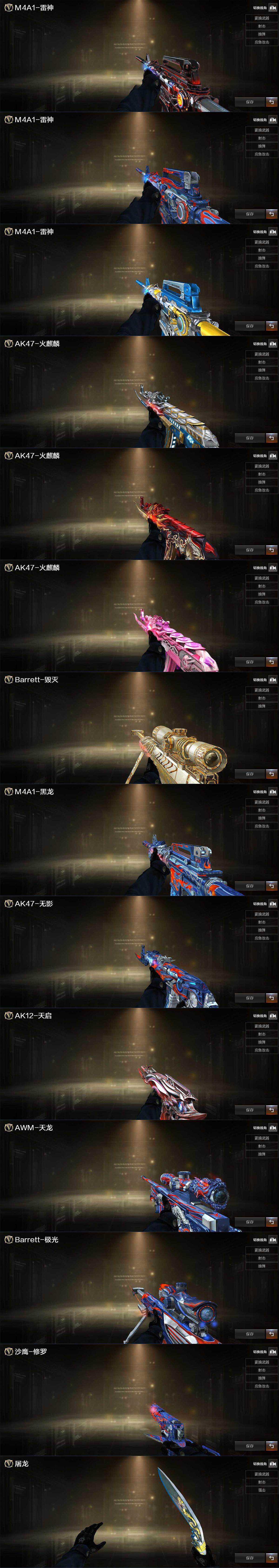 【热门武器】:QBZ03-金色蔷薇,HK417-朱雀,M200-幻神,死亡之眼,炼狱-迷你小钢,M4A1-黑骑士*3,汤姆逊-烈龙*5,RPK-盘龙,沙鹰-修罗*10