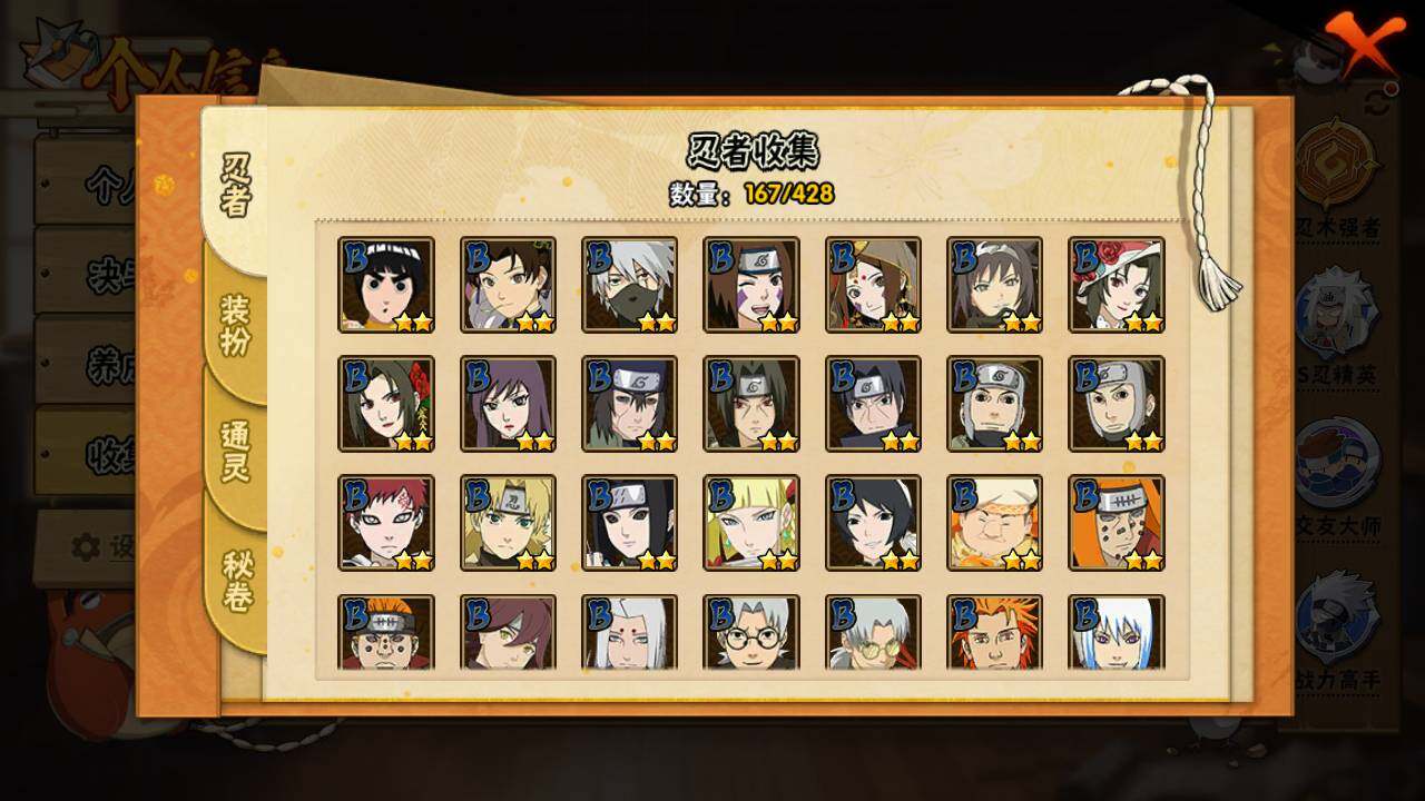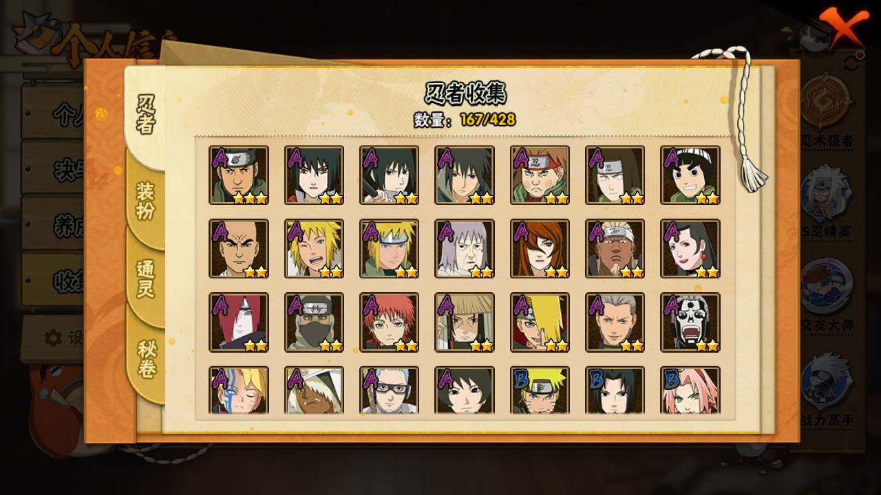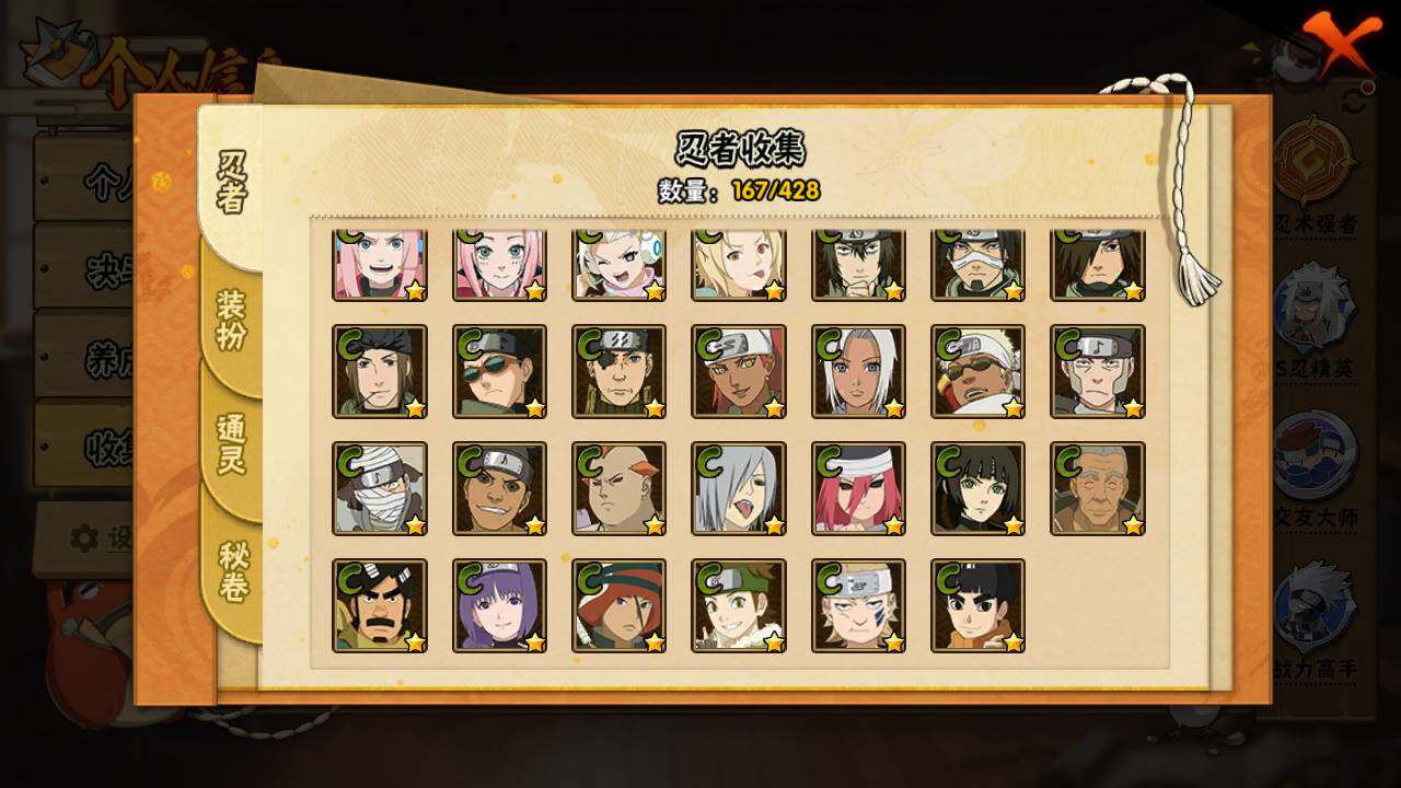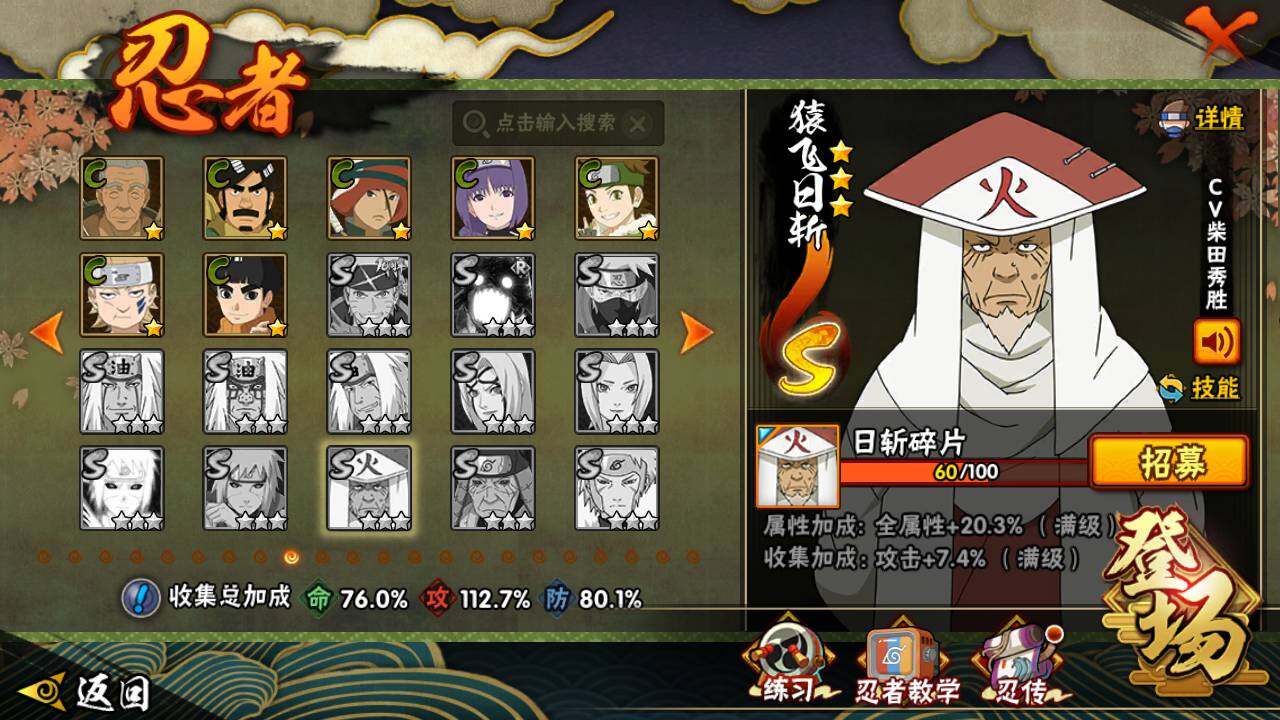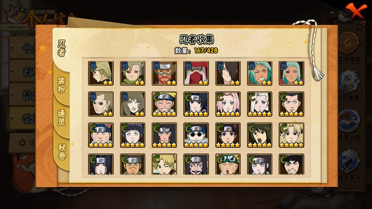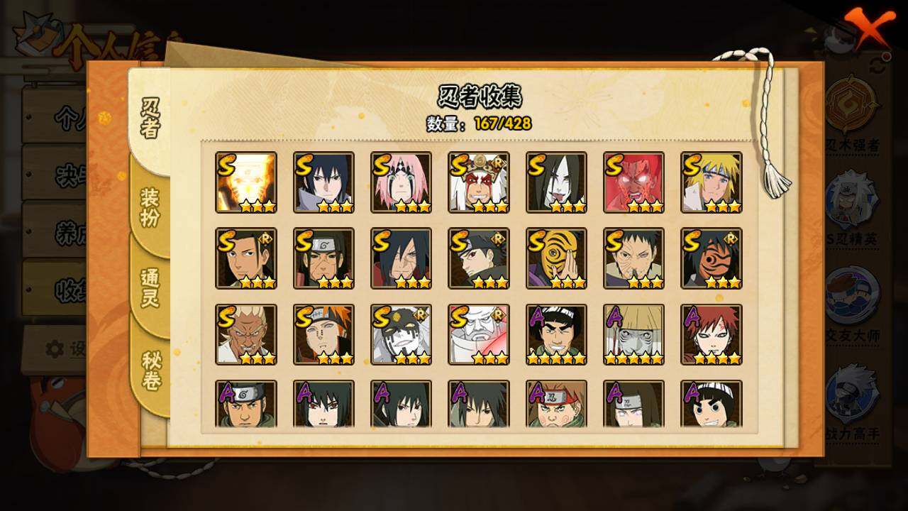 【S级忍者】:千手柱间「秽土转生」(3星),宇智波斑「秽土转生·解」(3星),春野樱「忍界大战」(3星),宇智波带土「忍界大战」(3星),艾「忍界大战」(3星),宇智波止水「须佐能乎」(3星),千手柱间「木叶创立」(3星),自来也「舞之豪杰」(3星)