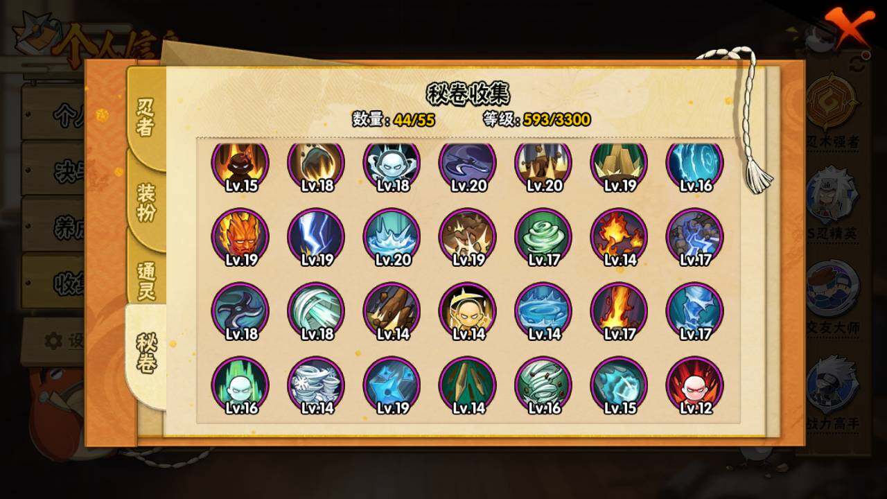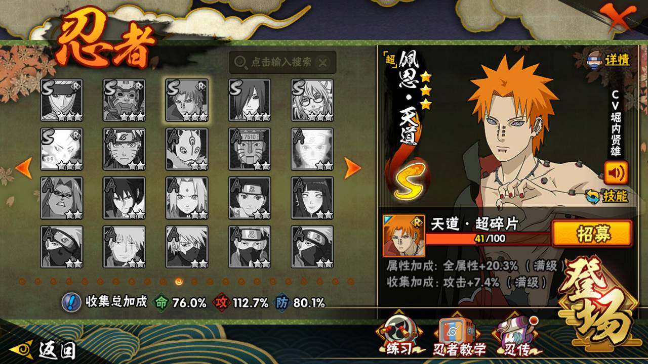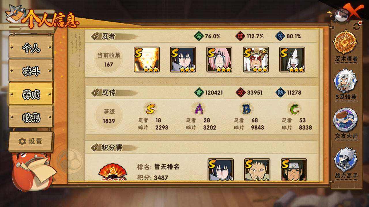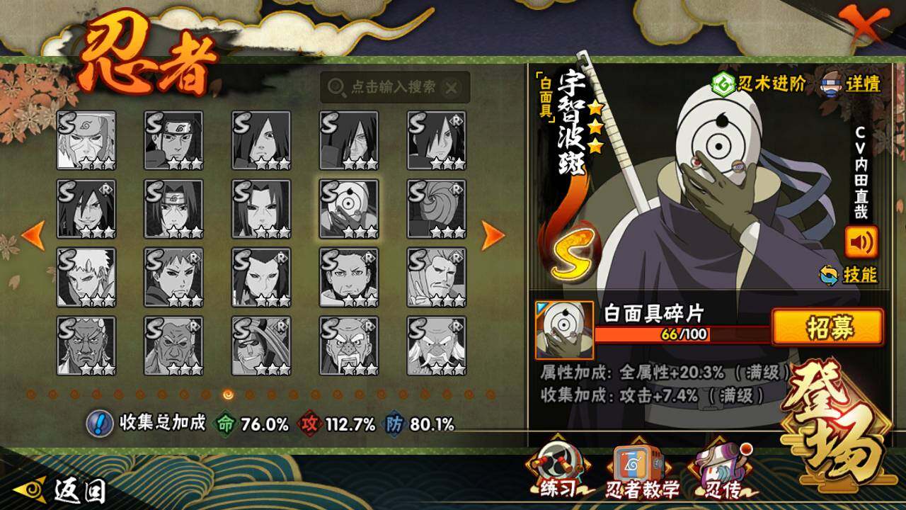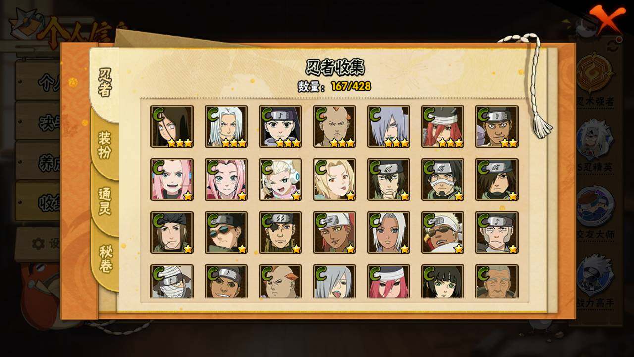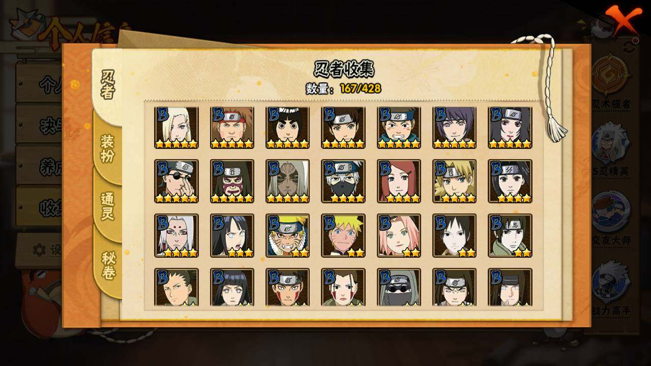 【S级忍者】:千手柱间「秽土转生」(3星),宇智波斑「秽土转生·解」(3星),春野樱「忍界大战」(3星),宇智波带土「忍界大战」(3星),艾「忍界大战」(3星),宇智波止水「须佐能乎」(3星),千手柱间「木叶创立」(3星),自来也「舞之豪杰」(3星)