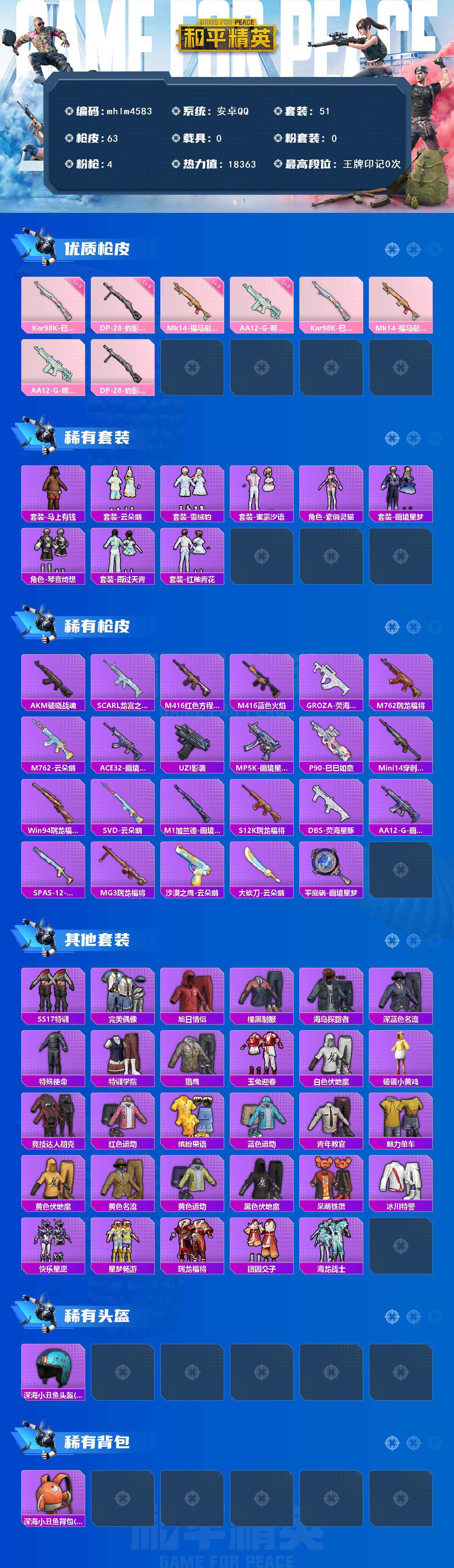 【mhlm4583】安卓 手Q-0粉装-4特效枪-0载具-0粉色飞行器-18363热力值-1王牌印记-51套装-63枪皮