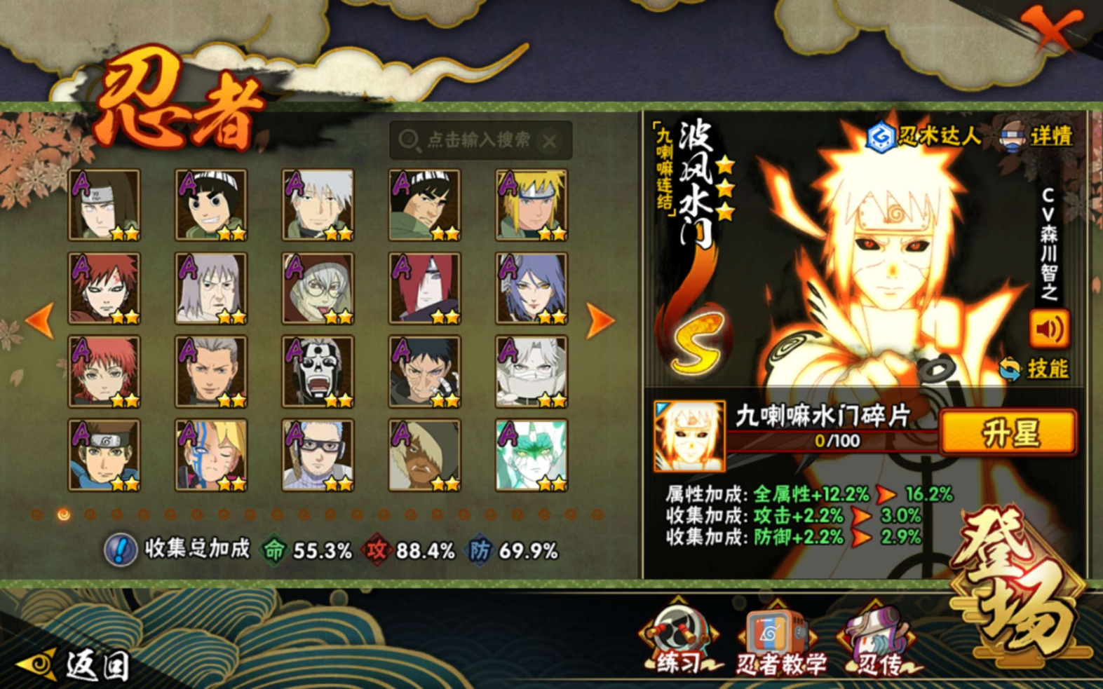 【S级忍者】宇智波斑「秽土转生·解」(3星),宇智波佐助「永恒万花筒」(3星),波风水门「九喇嘛连结」(3星),波风水门「秽土转生」(3星),自来也「舞之豪杰」(3星),宇智波鼬「须佐能乎」(3星),漩涡鸣人·宇智波佐助(3星),佩恩「天道」(3星),宇智波斑「五影会谈」(3星),波风水门(3星
