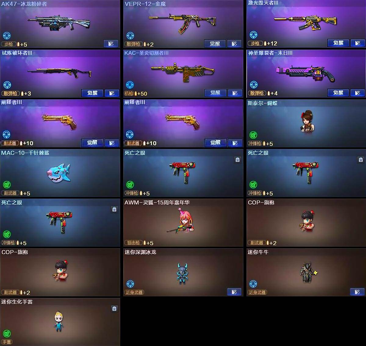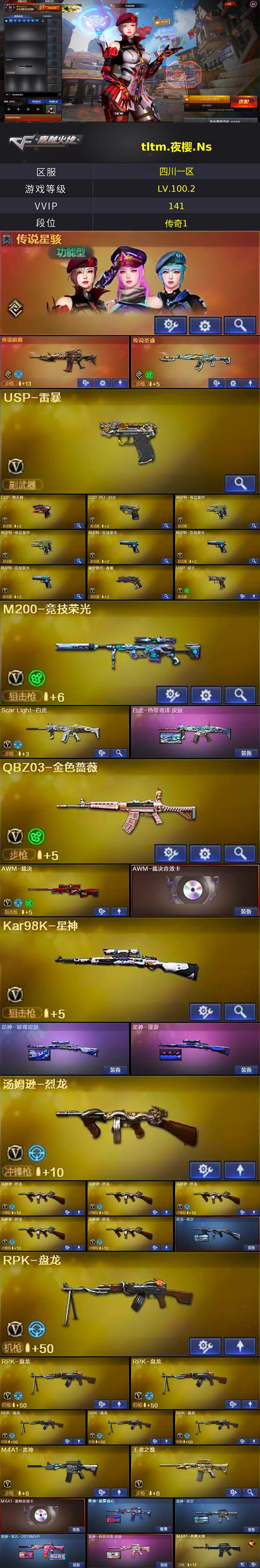 【热门武器】:传说暗裔,传说圣谕,QBZ03-金色蔷薇,Scar Light-白虎,HK417-朱雀,M4A1-青龙,M200-竞技荣光,死亡之眼*3,Kar98K-星神,M4A1-黑骑士,汤姆逊-烈龙*6,RPK-盘龙*6,加特林-炼狱,斯泰尔-蝴蝶,USP-雷暴,COP-堕天神,COP 357-幻