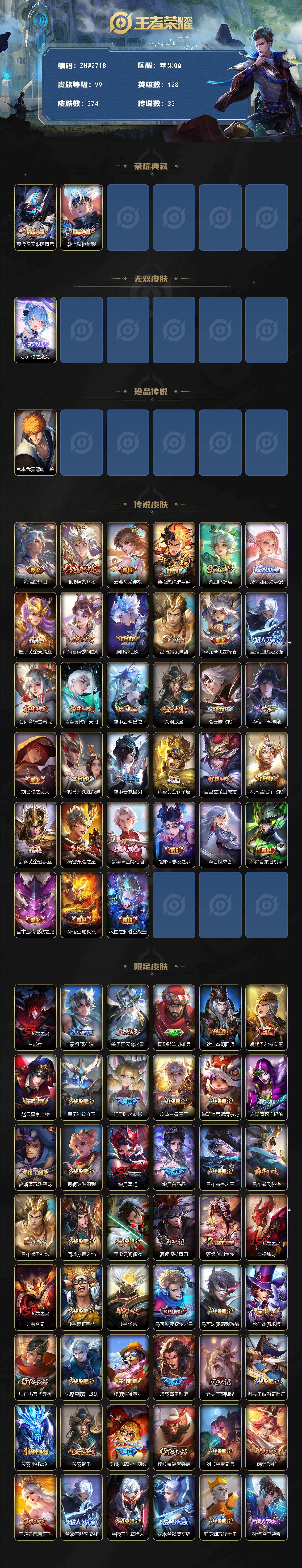 苹果Q-V9-永恒钻石III段位-128英雄-374皮肤-2典藏皮肤-1无双-1珍品传说-33传说-3星元-111史诗