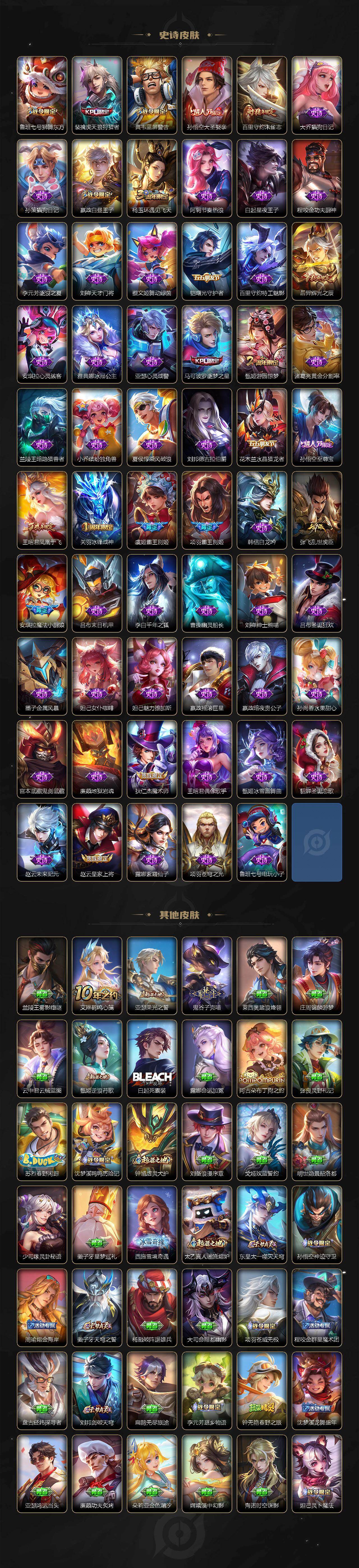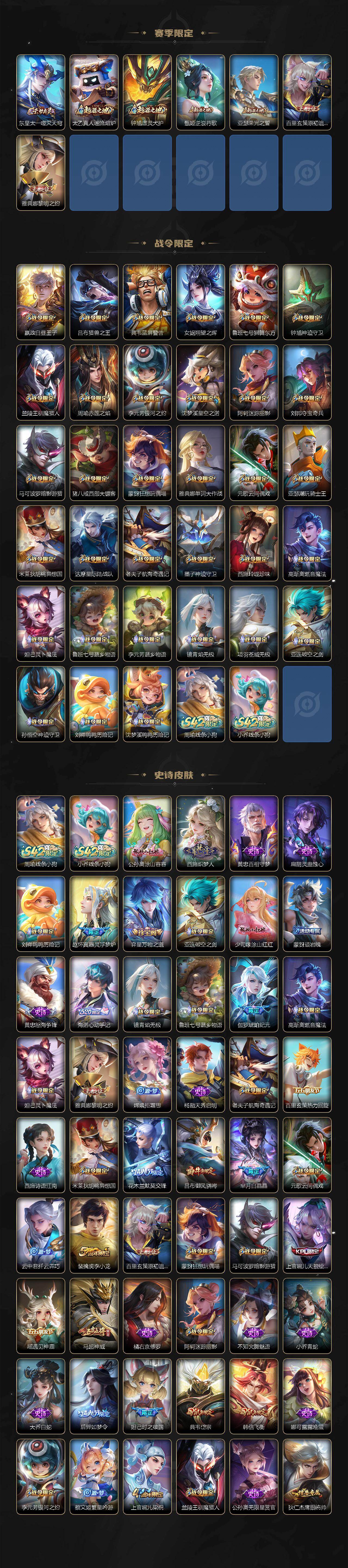 【传说皮肤】:韩信踏浪归,澜愿照九州拓,云缨幻光神枪,裴擒虎祥瑞亨通,桑启鸣野蒿,朵莉亚心动手记,墨子黄金天蝎座,孙尚香乘龙问璇玑,澜逐花归海,吕布遇见神鼓,李元芳飞鸢探春,兰陵王默契交锋,公孙离祈雪灵祝,诸葛亮时雨天司,虞姬启明星使,关羽武圣,曜云
