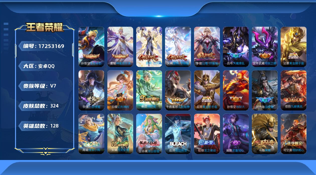 449-[17253169]贵族7-324皮-2典藏-12传说-10全皮-星传说幽冥火-幽冥之眼安卓手Q131区324皮2典藏12传说0无双V7 营地ID451725053非凡王者【荣耀典藏】:神鉴启示录,全息碎影【优质限定皮肤】:山海·炽霜斩,神威,天魔缭乱【传说皮肤】:黄金狮子座,黄金射手座,久胜战神,鸣野蒿,山海·炽霜斩,一念神魔,天魔缭乱,地狱火,地狱之眼,愿照·山河定,幻光神枪,愿照·千秋盛【史诗皮肤】:百晓客,猫狗日记,幽灵船长,九幽镇关,灵蛊蚀心,万灵启世,万物之道,涂山容容,未来