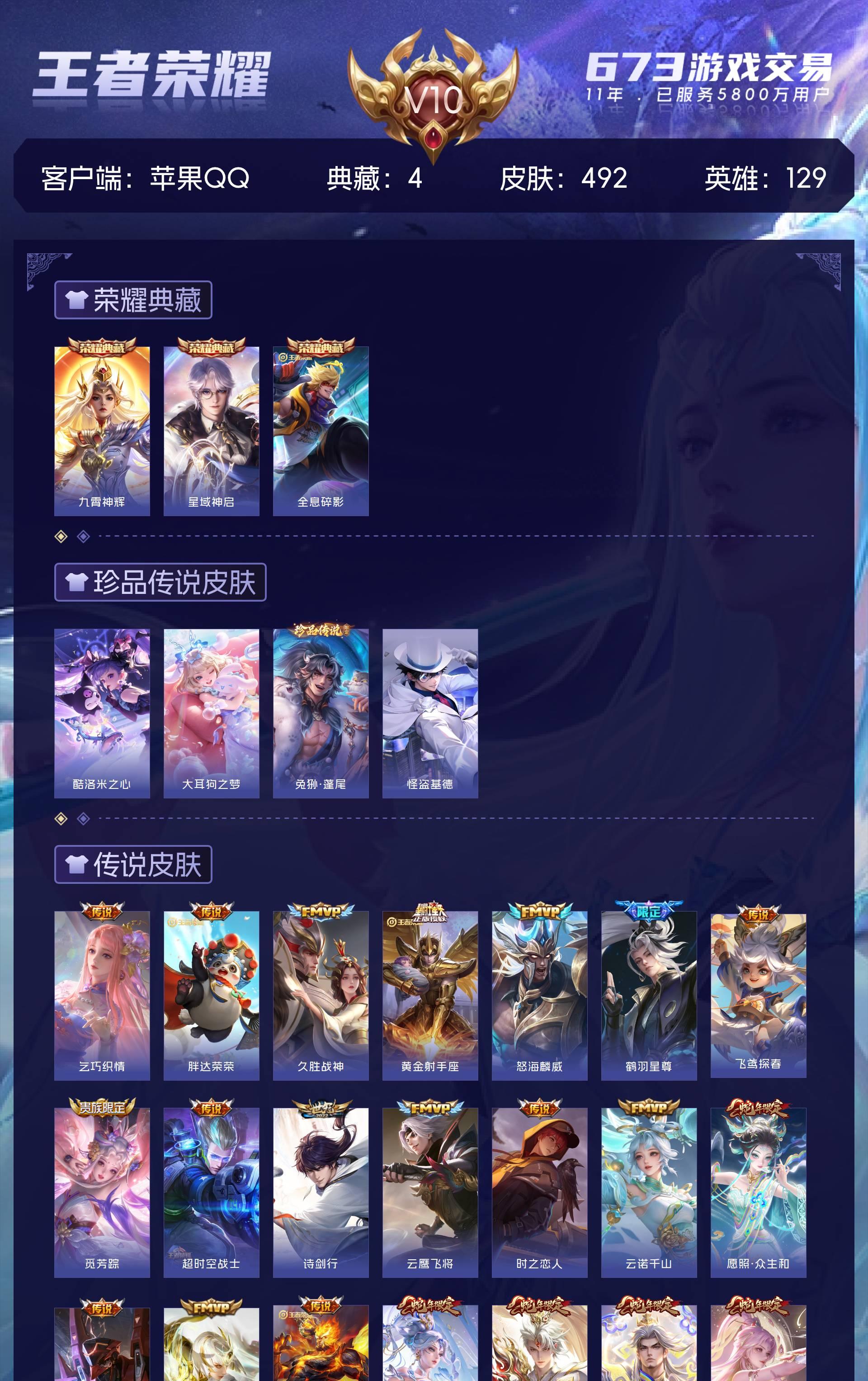 苹果QQ/至尊星耀/492皮肤/129英雄/3典藏/0珍品无双/0无双/4珍品传说/51传说/156