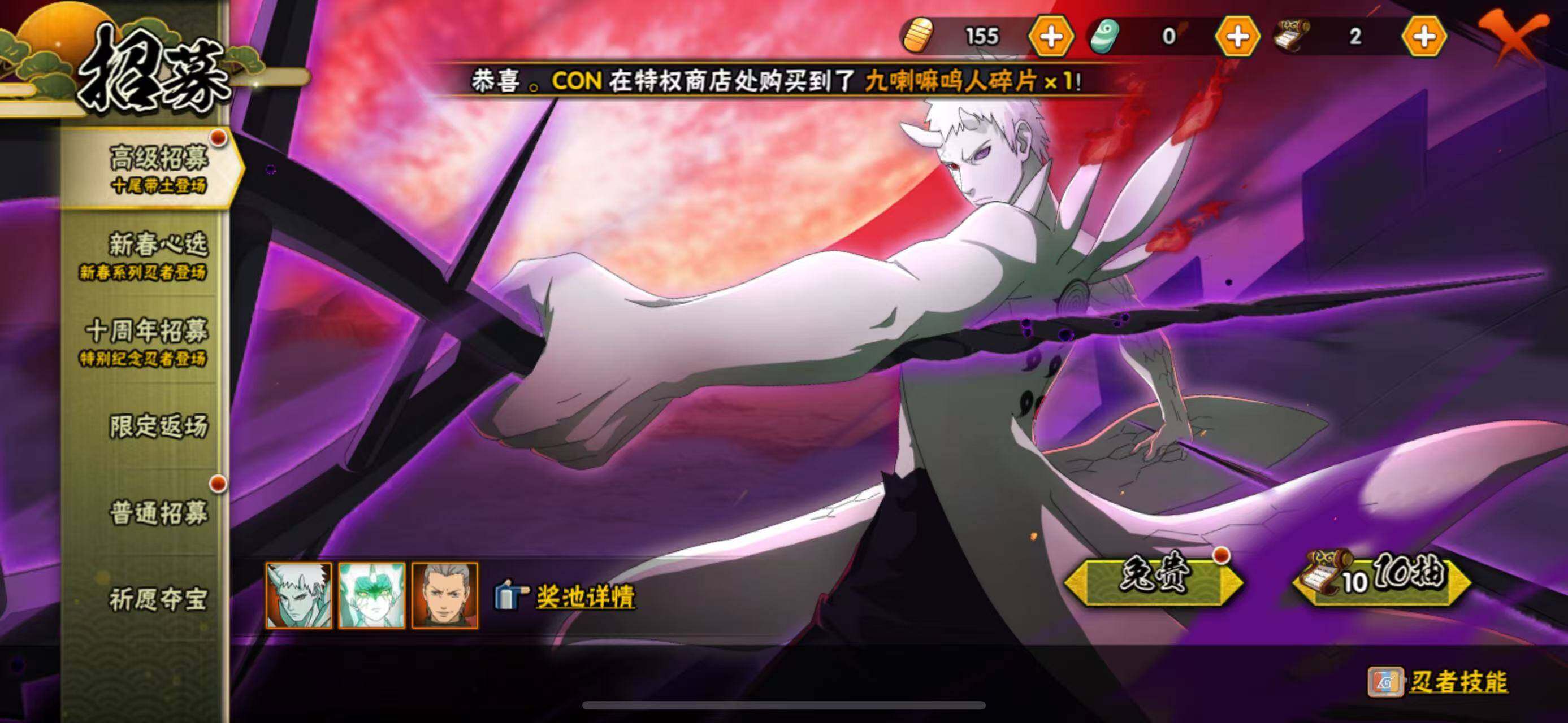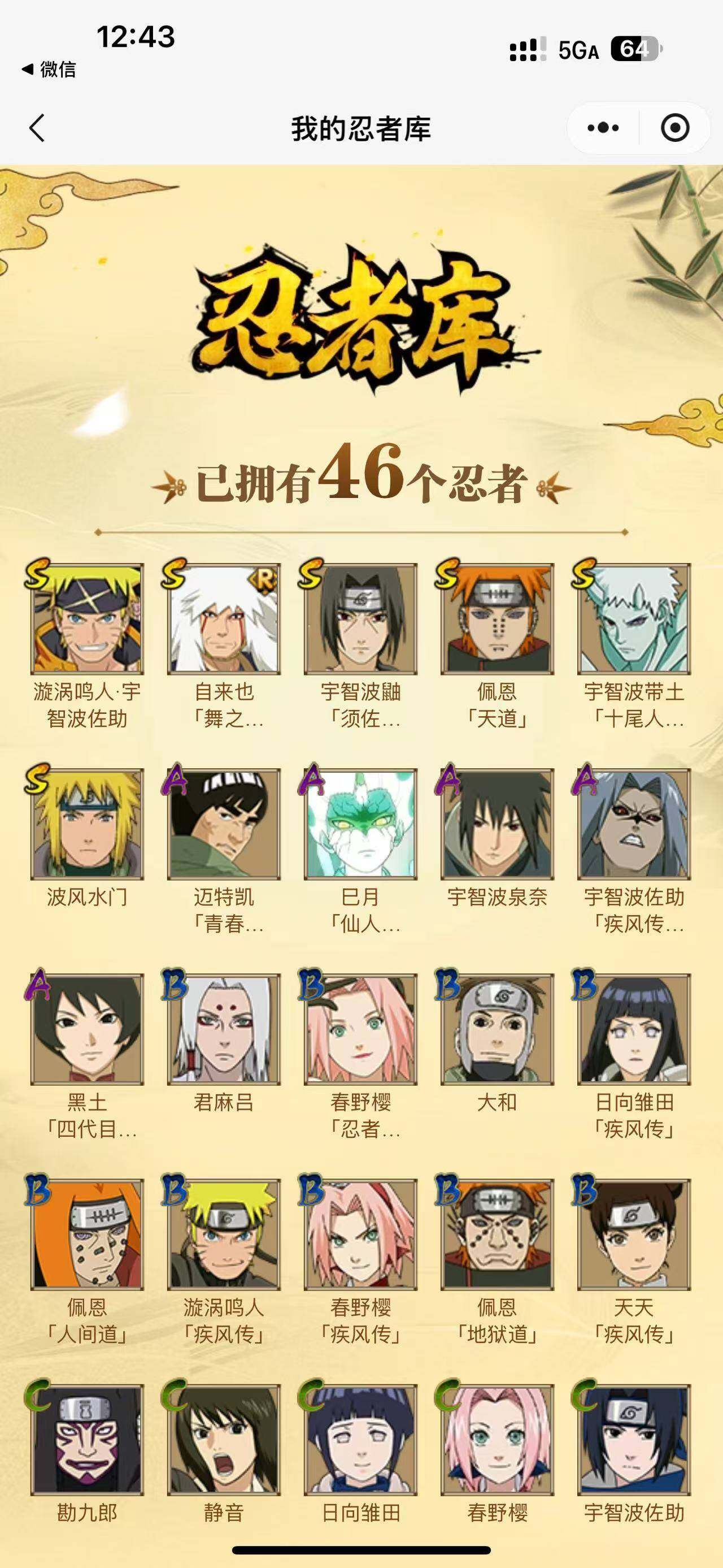 【A级忍者】:宇智波佐助「疾风传咒印」(2星),黑土「博人传」(2星),宇智波泉奈(2星),巳月「仙人模式」(2星),迈特凯「青春爆炸」(2星)