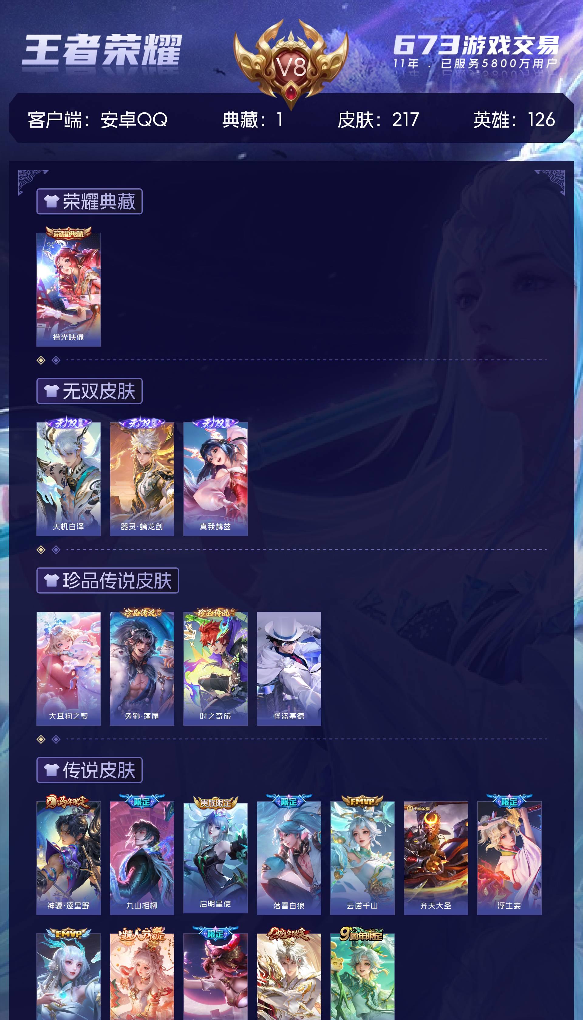 安卓QQ/至尊星耀/217皮肤/126英雄/1典藏/0珍品无双/3无双/4珍品传说/11传说/69史