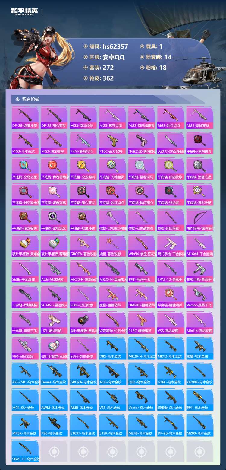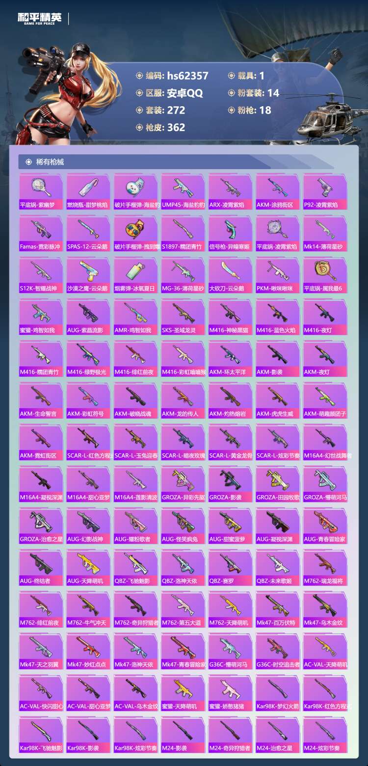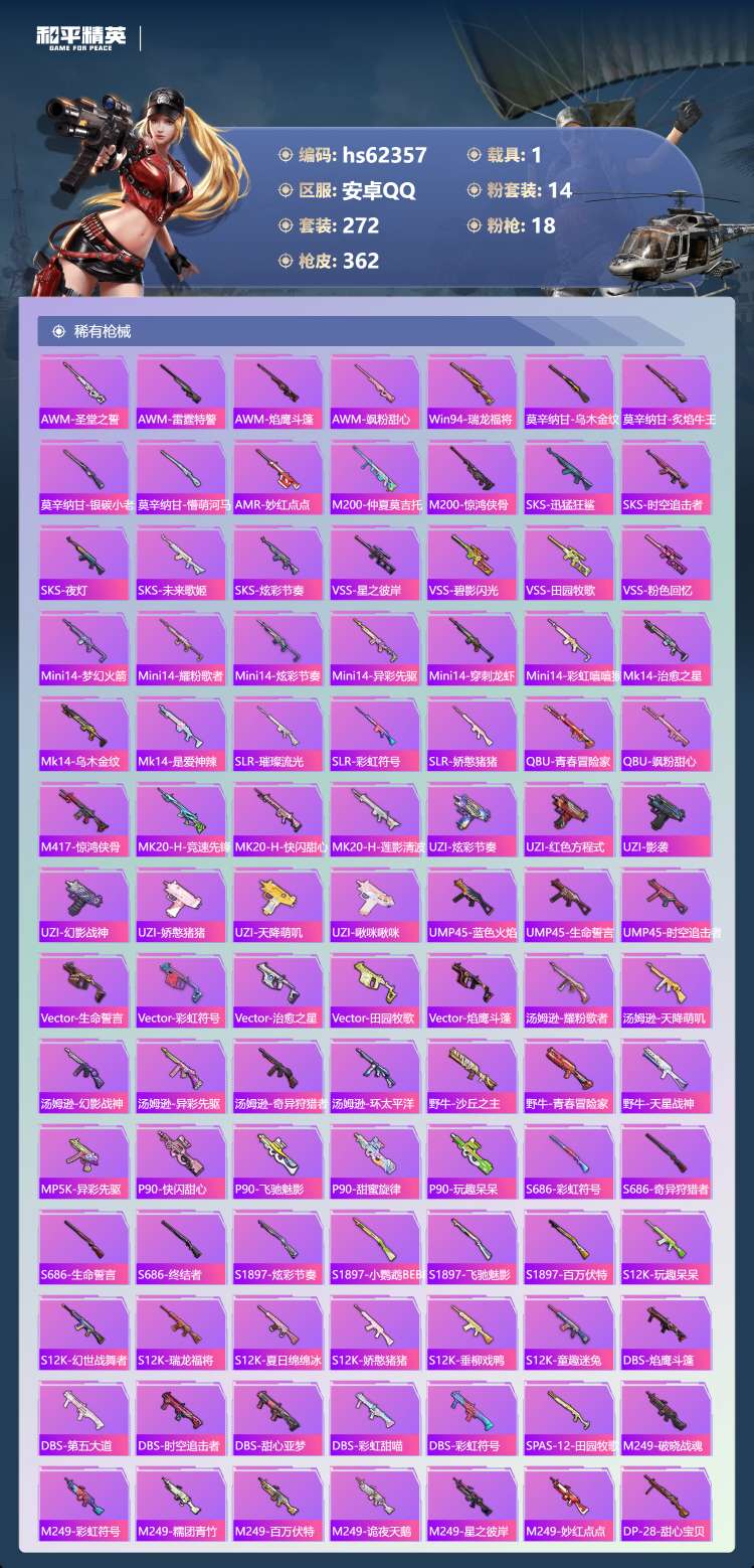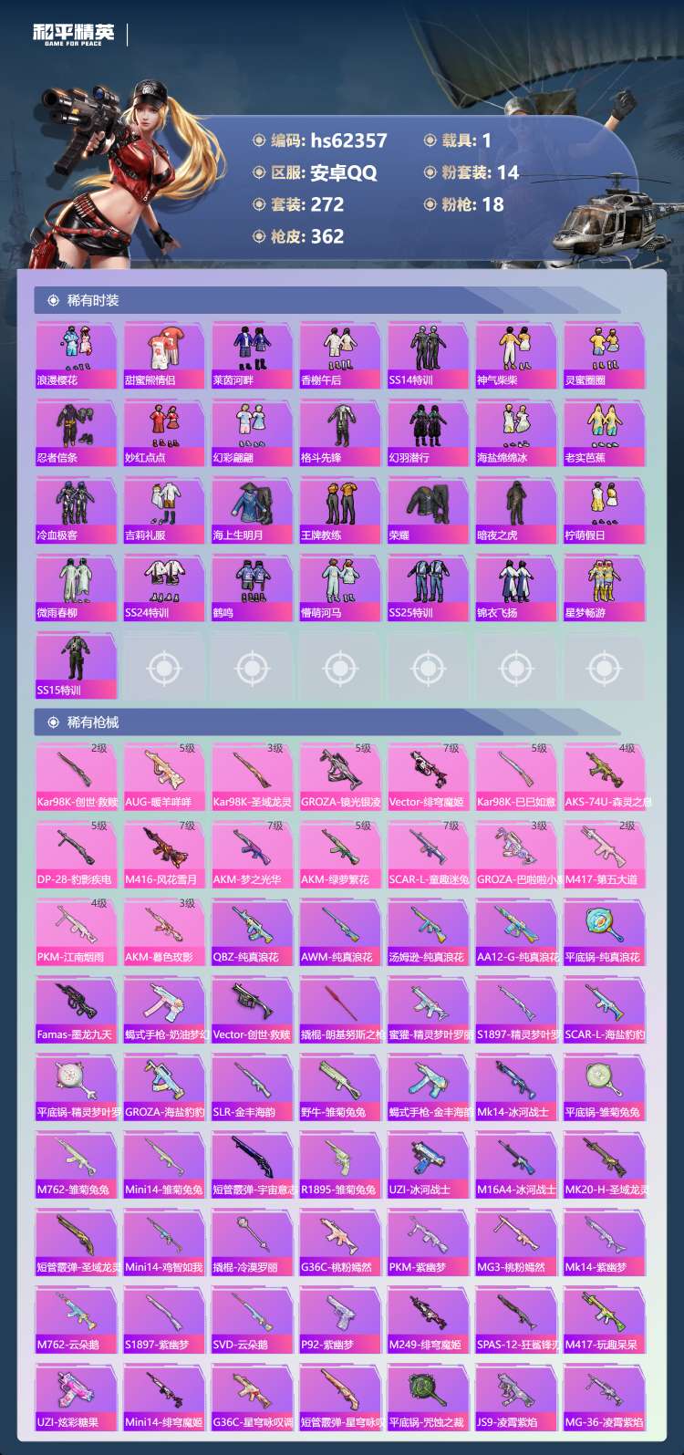 hs62357 安卓手Q-18王牌印记-1红装-14粉装-18特效枪-1载具-124779热力值-2