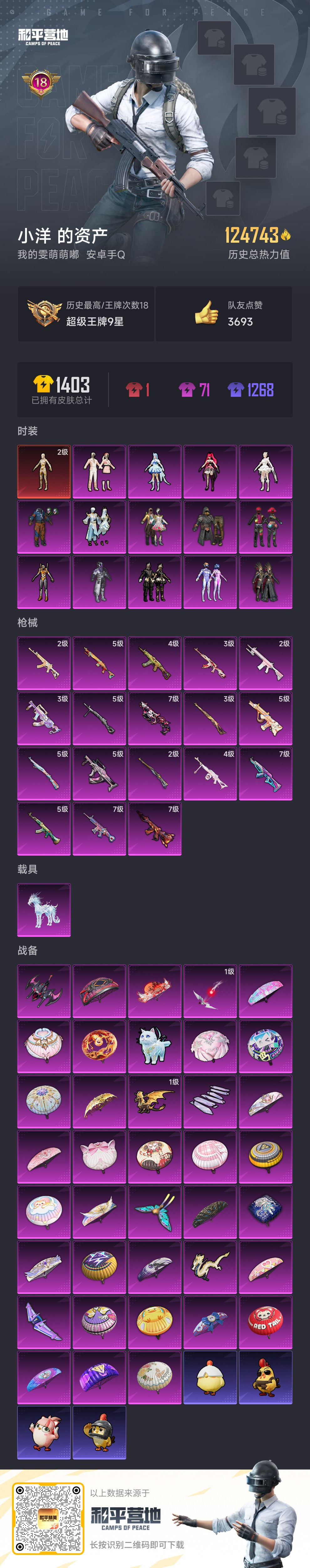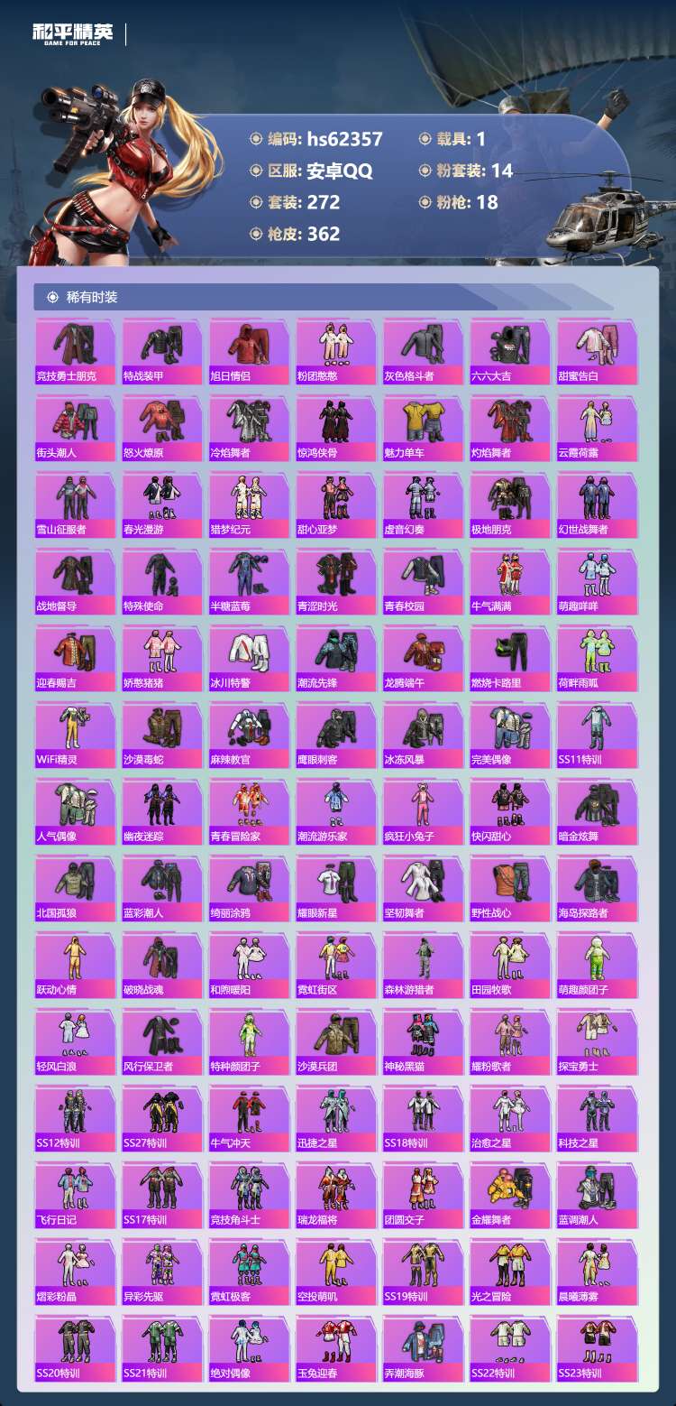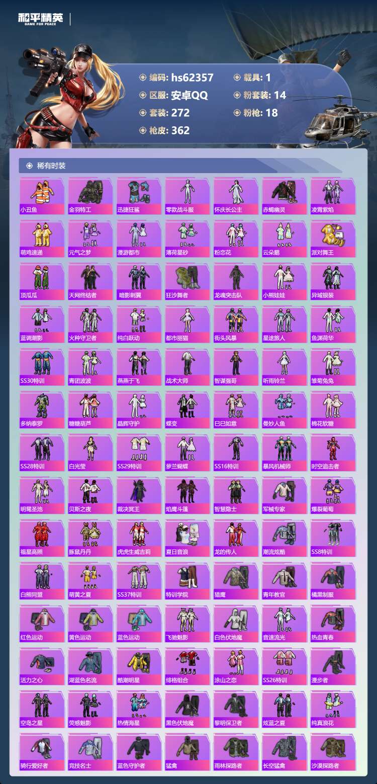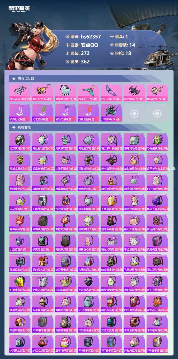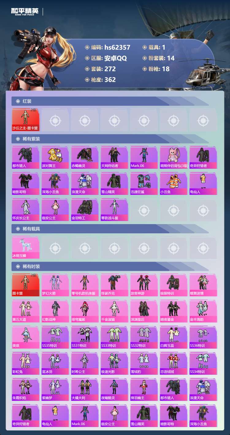 hs62357 安卓手Q-18王牌印记-1红装-14粉装-18特效枪-1载具-124779热力值-2