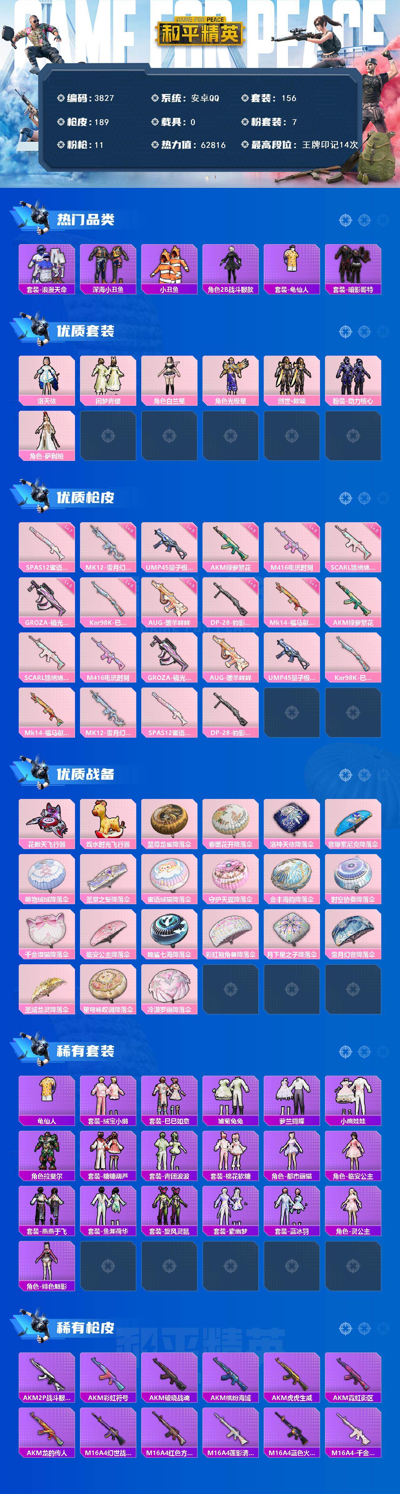 满级地铁 安卓 手Q-7粉装-11特效枪-0载具-3粉色飞行器-62816热力值-14王牌印记-156套装-189枪皮