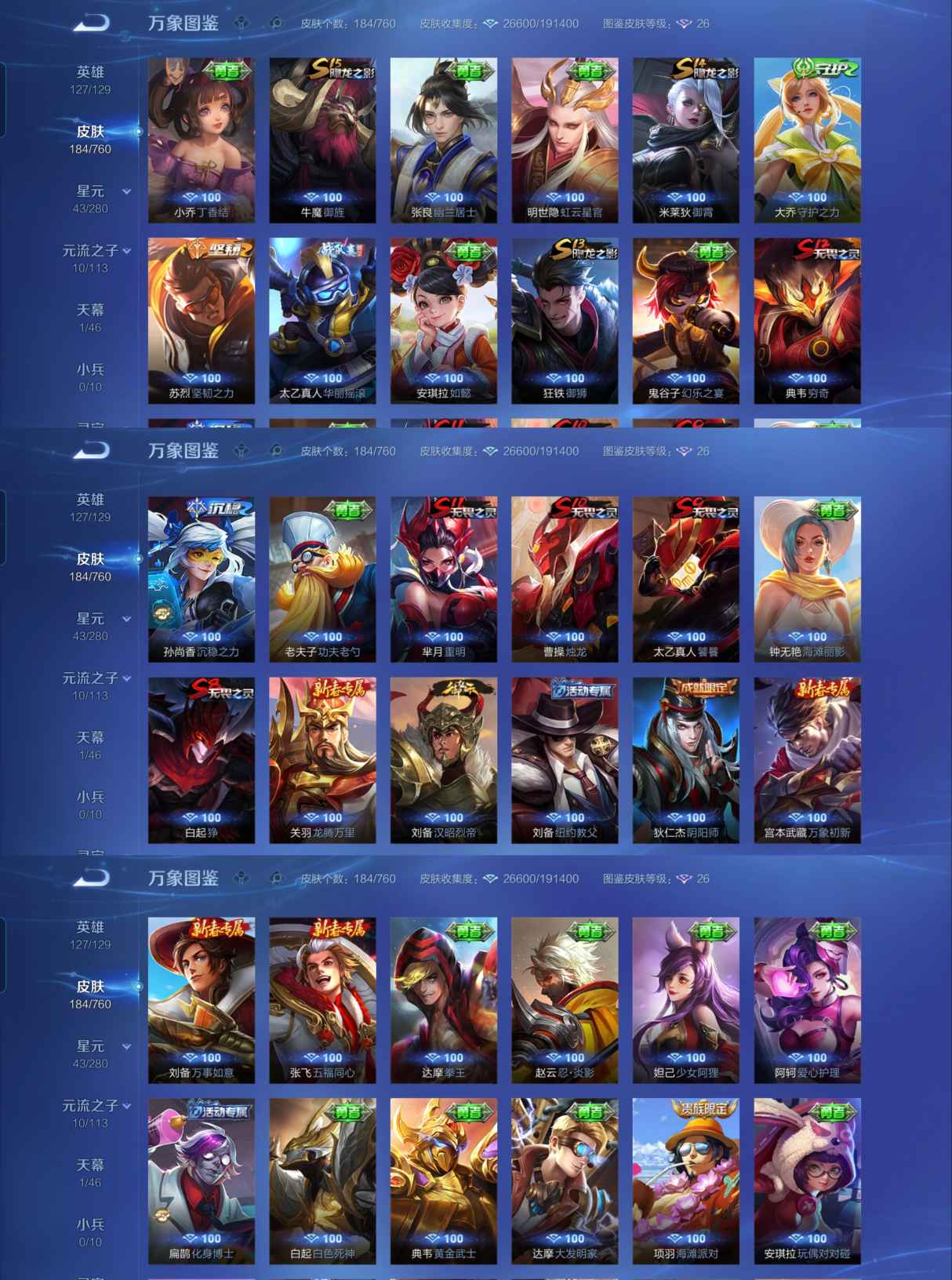 【史诗皮肤】 星界战将 电玩小子 线条小狗 九幽镇关 江河有灵 荣光圣徽 死神来了 万灵启世 顽趣 魅语 幽灵船长 功夫厨神 女仆咖啡 魅力维加斯 魔术师 鹰眼统帅 圣诞恋歌 鬼剑武藏 白龙吟 水晶猎龙者 暗隐猎兽者 航海奇遇记 千年之狐 逐浪之夏 地狱岩魂 德古拉伯爵 绅士熊喵 天才