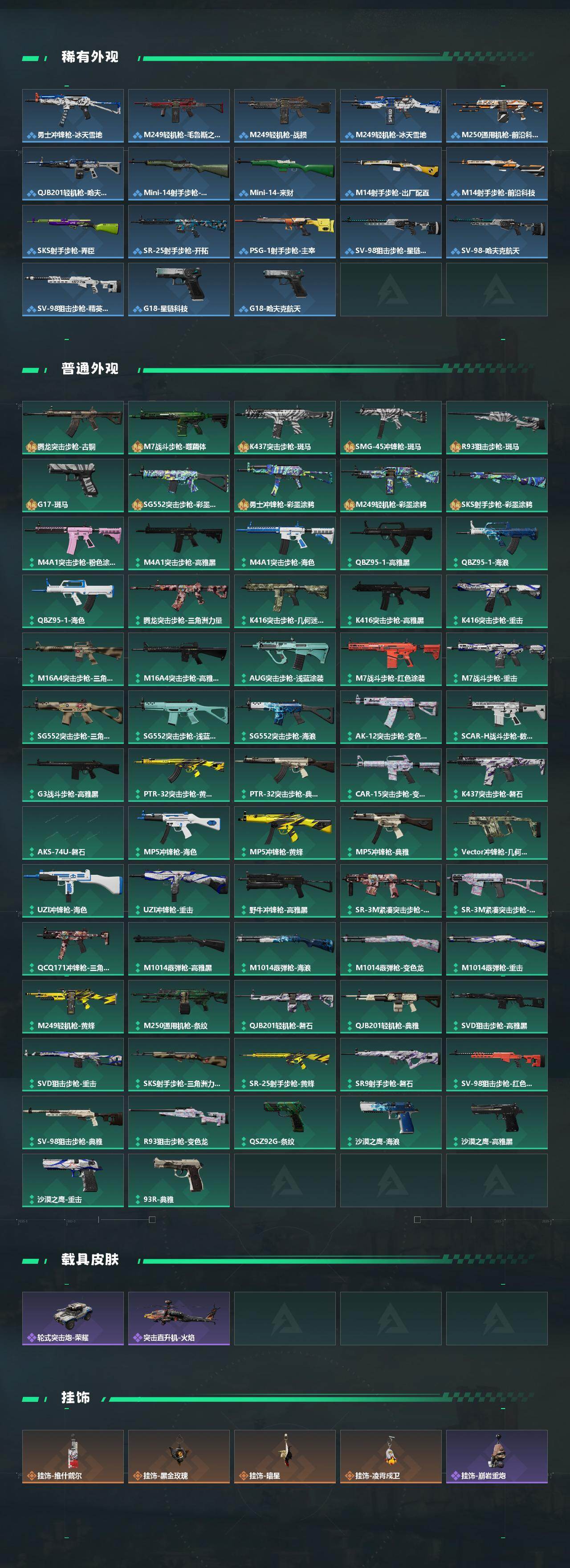 【传说外观】:QBZ95-1突击步枪-凌霄戍卫,SG552突击步枪-运动员,SCAR-H战斗步枪-启航,腾龙突击步枪-马年祥瑞,K437突击步枪-锦绣,KC17突击步枪-电锯惊魂,MK47突击步