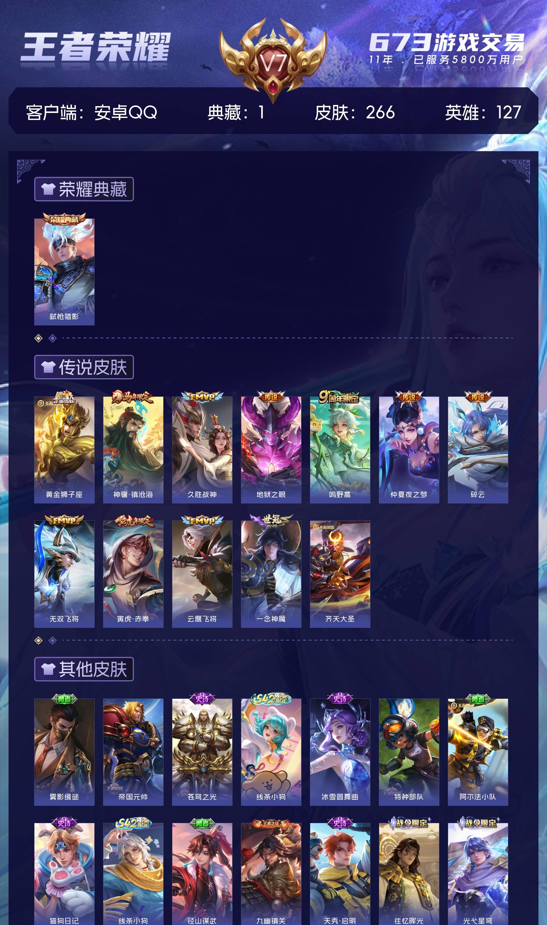 V7 皮肤266 英雄127 最强王者 荣耀典藏1 传说12 其他皮肤260