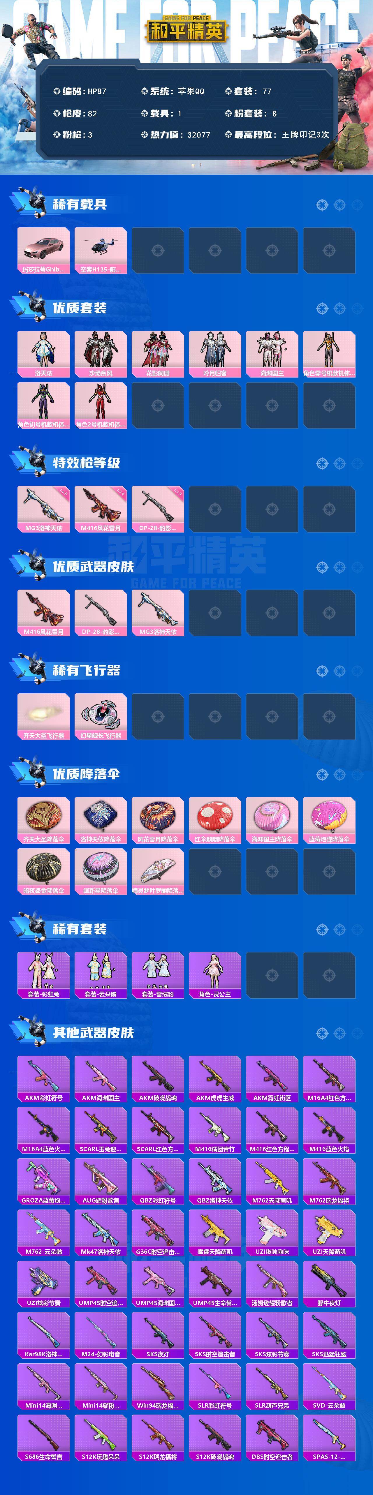 苹果 手Q-8粉装-3特效枪-1载具-2粉色飞行器-32077热力值-3王牌印记-77套装-82枪皮
