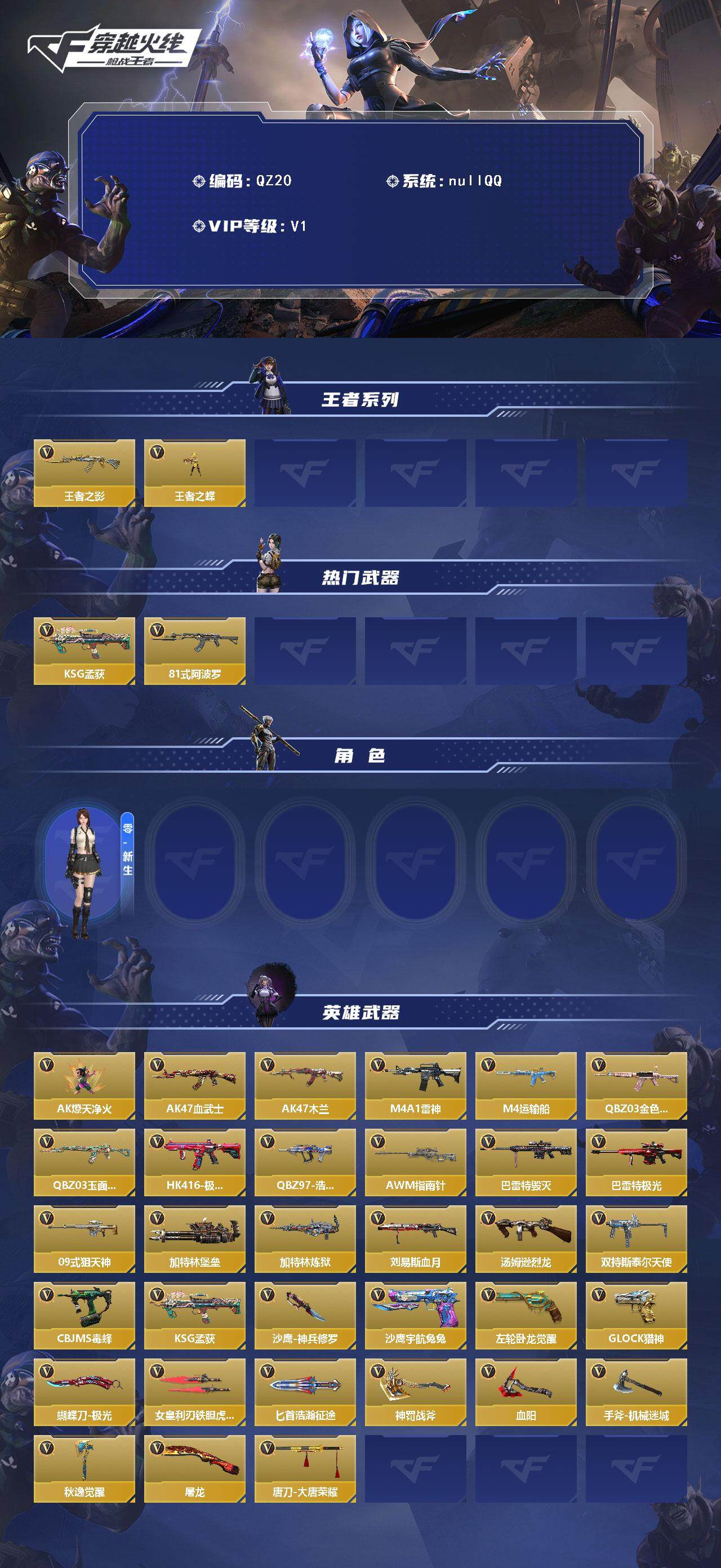 【英雄武器】:AK47-燎天净火,AK47-血武士*2,AK47-木兰,M4A1-雷神,M4A1-运输船,QBZ03-金色蔷薇*3,QBZ03-玉面羞花,HK416-极光,QBZ97-浩瀚征途,AWM-指南针,巴雷特-毁灭*2,巴雷特-极光,09式狙-天神,加