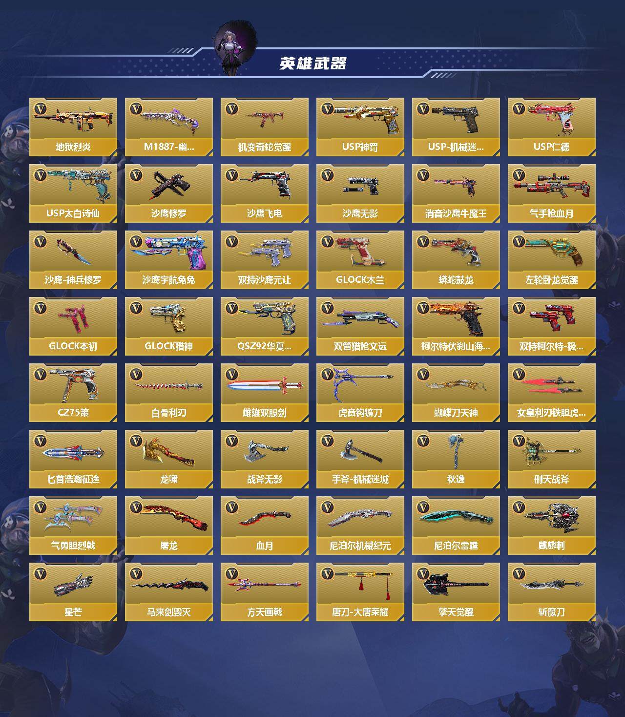 【英雄武器】:AK47-无影,AK47-火麒麟,AK47-黑武士觉醒,AK47-机械迷城,AK47-猩红传说,AK47-沙漠郡主-超觉,