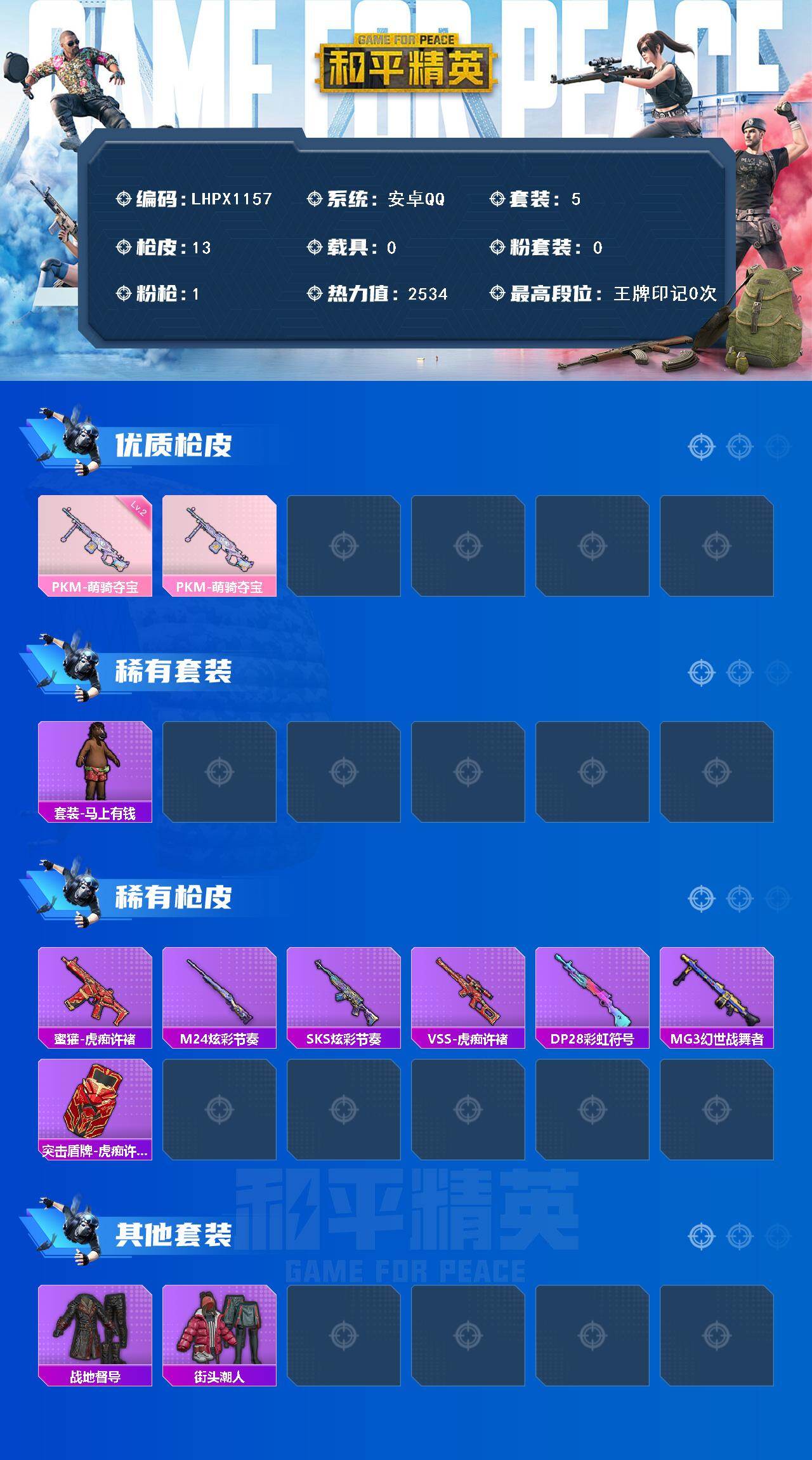 【特价出售/店主推荐】安卓 手Q-0粉装-1特效枪-0载具-0粉色飞行器-2534热力值-0王牌印记-5套装-13枪皮