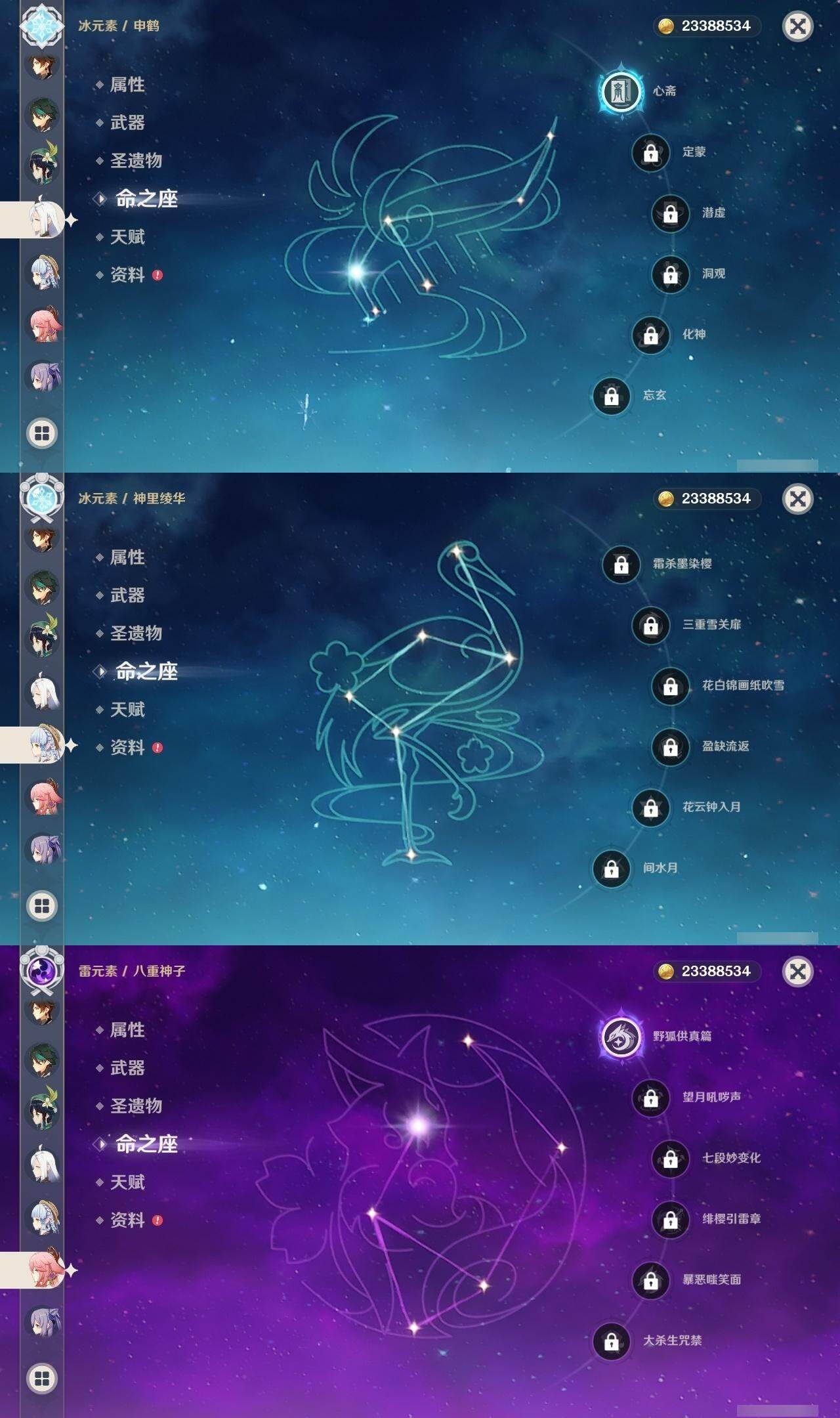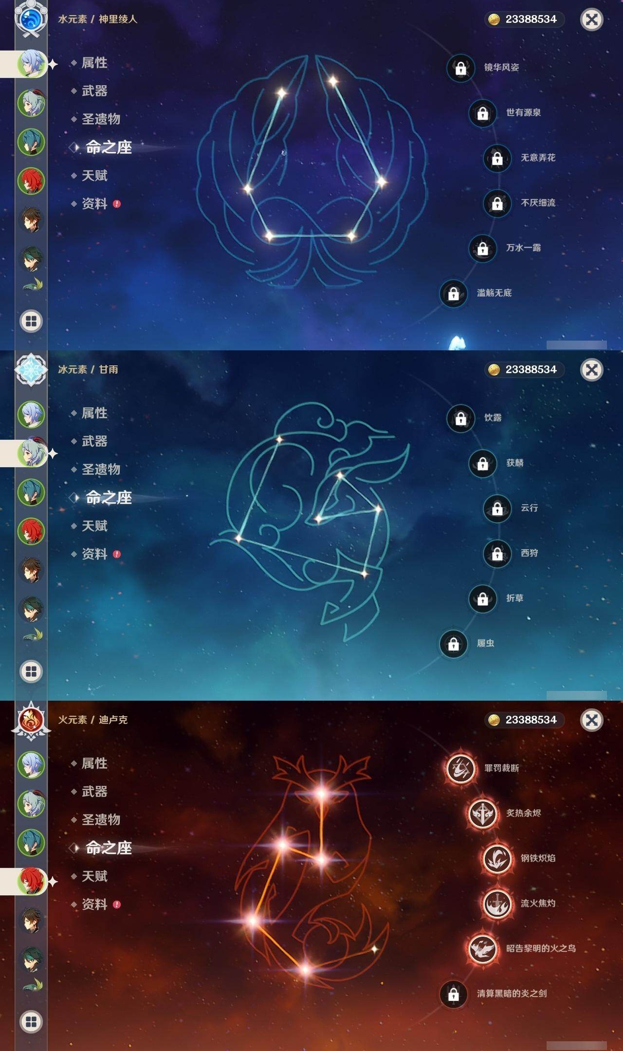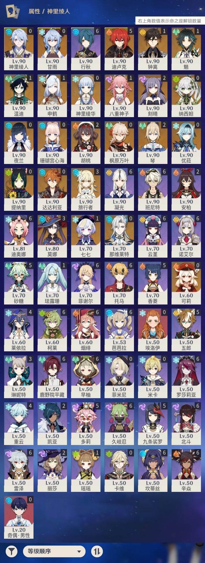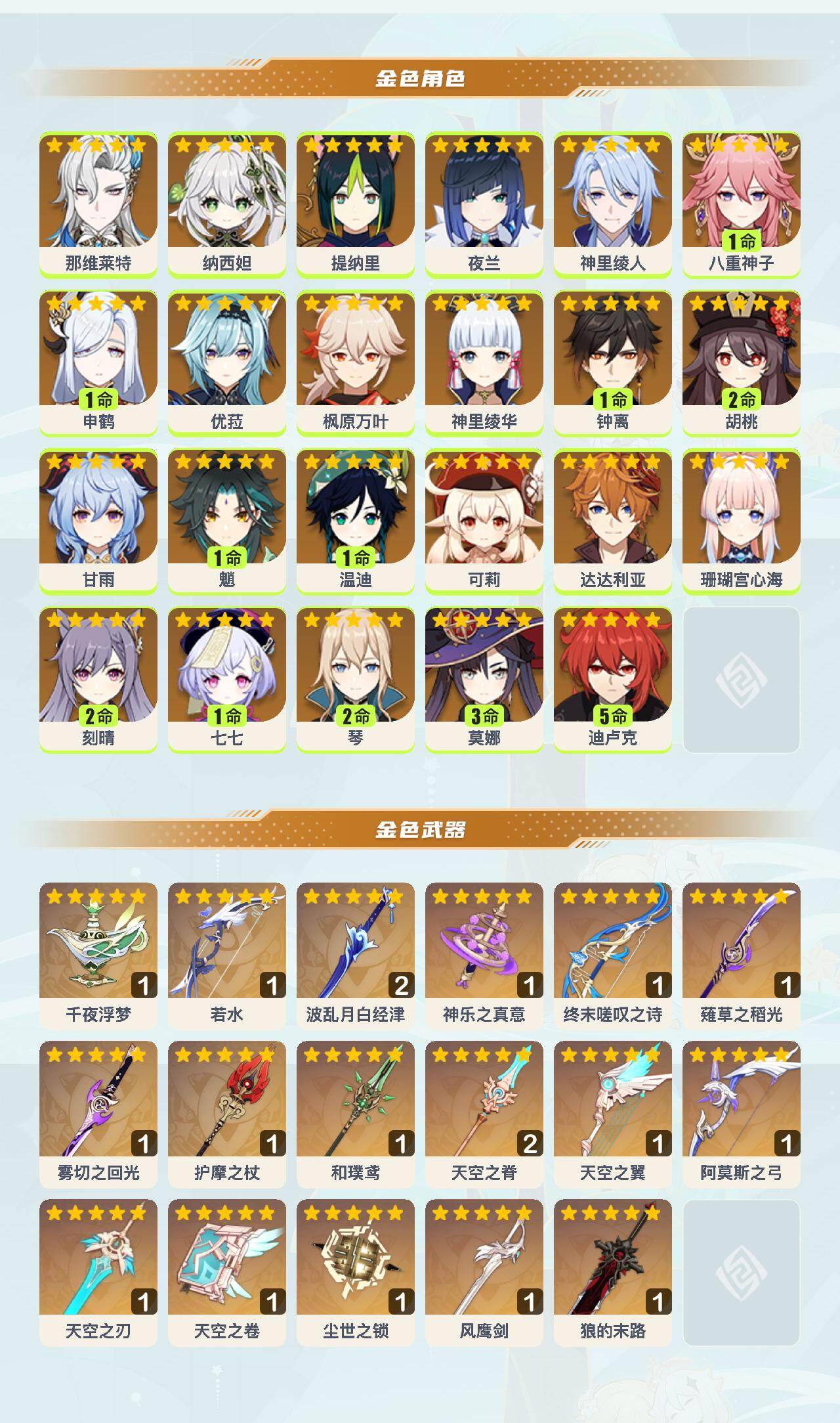 0命那维莱特,0命纳西妲,0命提纳里,0命夜兰,0命神里绫人,1命八重神子,1命申鹤,0命优菈,0命枫原万叶,0命神里绫华,1命钟离,2命胡桃,0命甘雨,1命魈,1命温迪,0命可莉,0命达达利亚,0命珊瑚宫心海,2命刻晴,1命七七,2命琴,3命莫娜,5命迪卢克,精1千夜浮梦,精1若水,精2波乱月白经津,精1神乐之真意,精1终末嗟叹之诗,精1薙草之稻光,精1雾切之回光,精1护摩之杖,精1和璞鸢,精2天空之脊,精1天空之翼,精1阿莫斯之弓,精1天