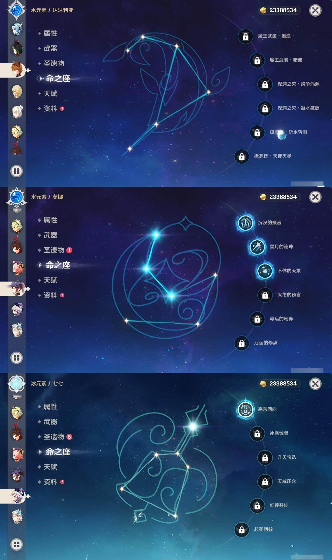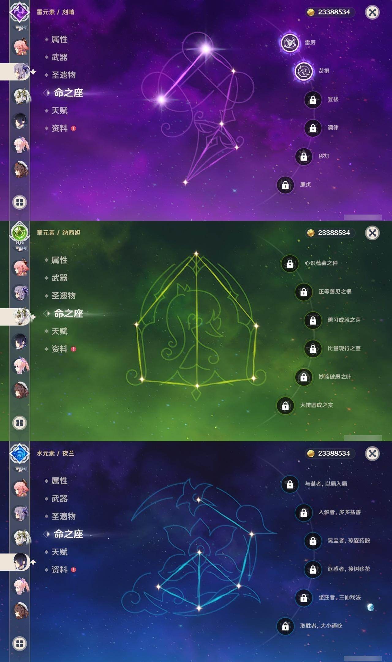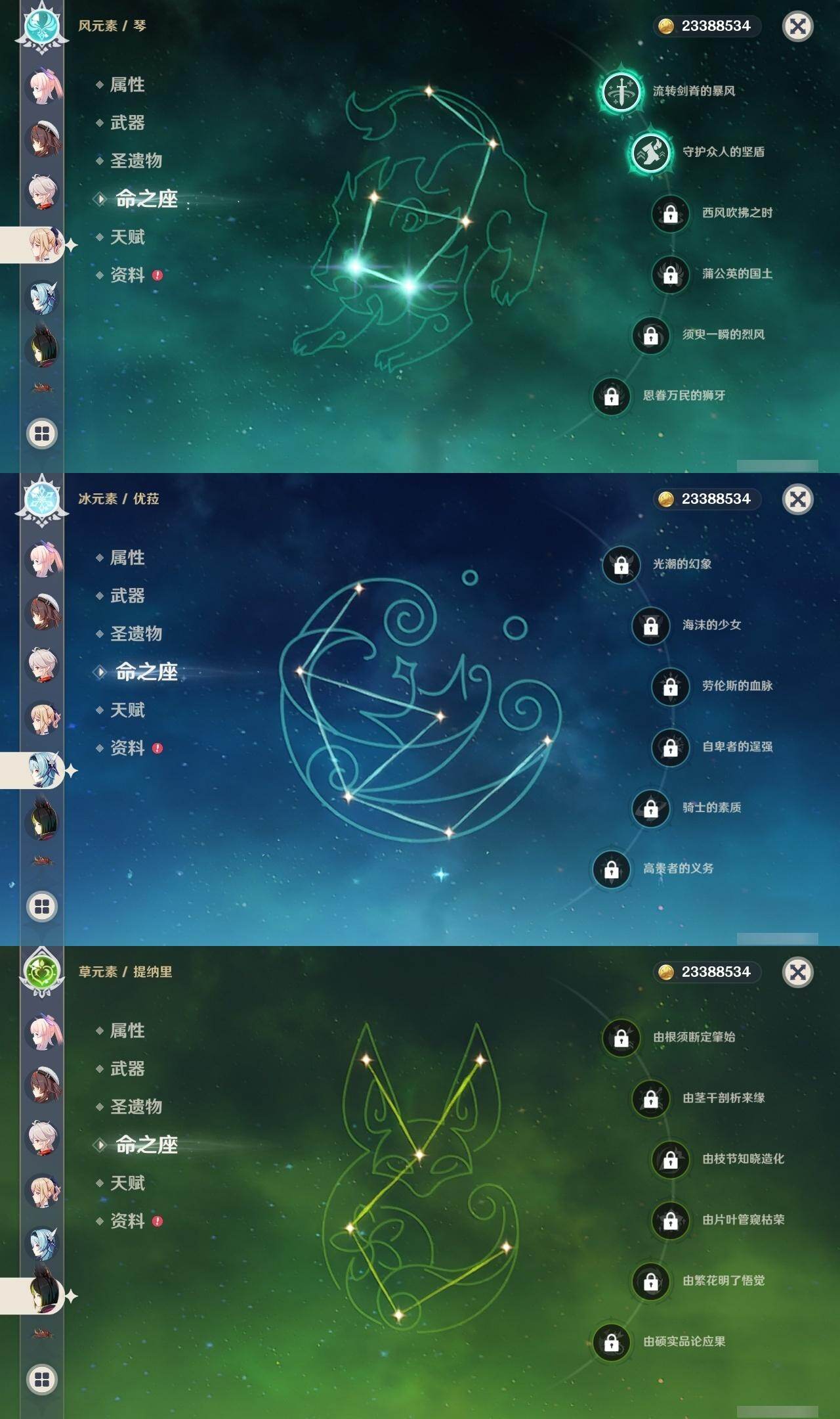 0命那维莱特,0命纳西妲,0命提纳里,0命夜兰,0命神里绫人,1命八重神子,1命申鹤,0命优菈,0命枫原万叶,0命神里绫华,1命钟离,2命胡桃,0命甘雨,1命魈,1命温迪,0命可莉,0命达达利亚,0命珊瑚宫心海,2命刻晴,1命七七,2命琴,3命莫娜,5命迪卢克,精1千夜浮梦,精1若水,精2波乱月白经津,精1神乐之真意,精1终末嗟叹之诗,精1薙草之稻光,精1雾切之回光,精1护摩之杖,精1和璞鸢,精2天空之脊,精1天空之翼,精1阿莫斯之弓,精1天