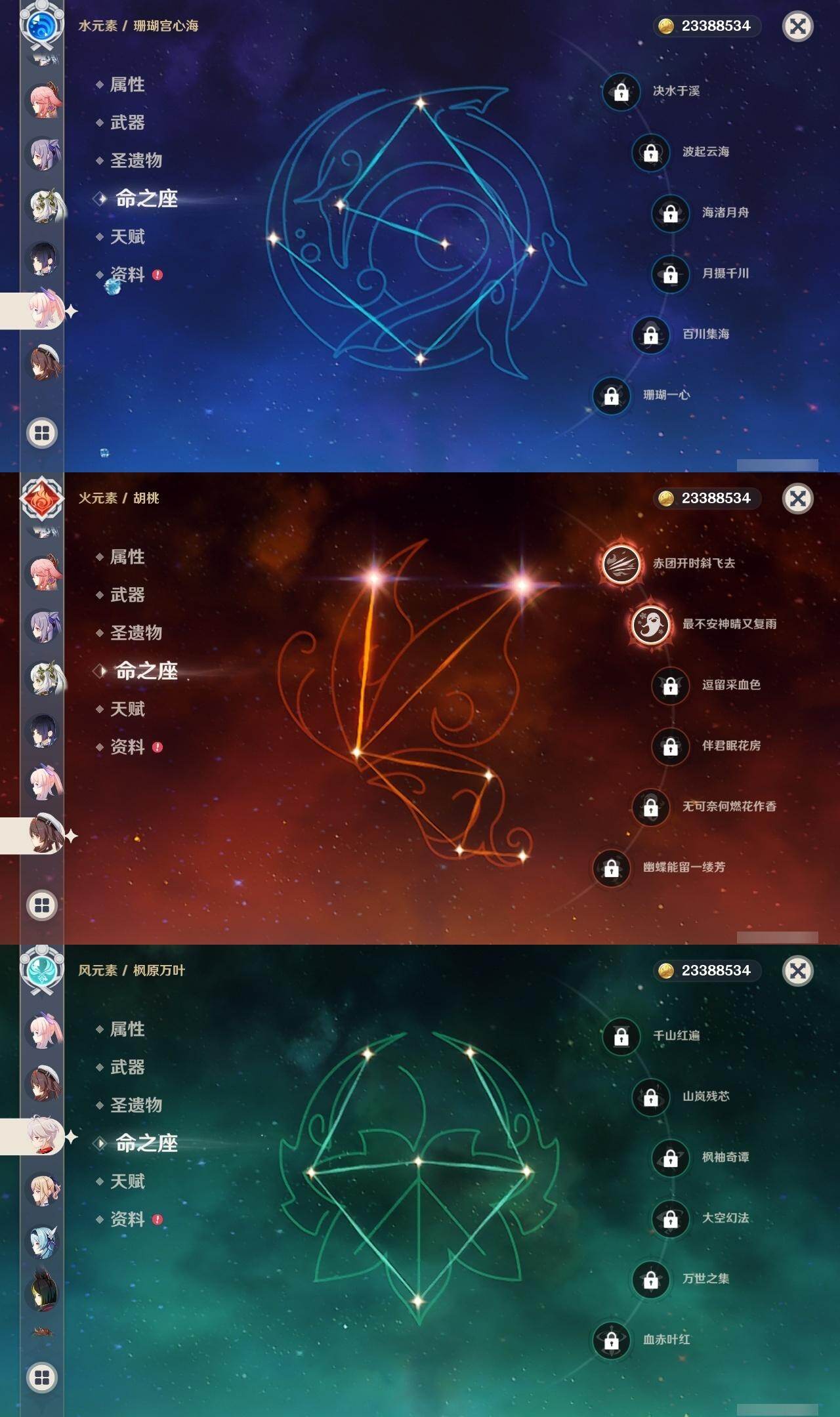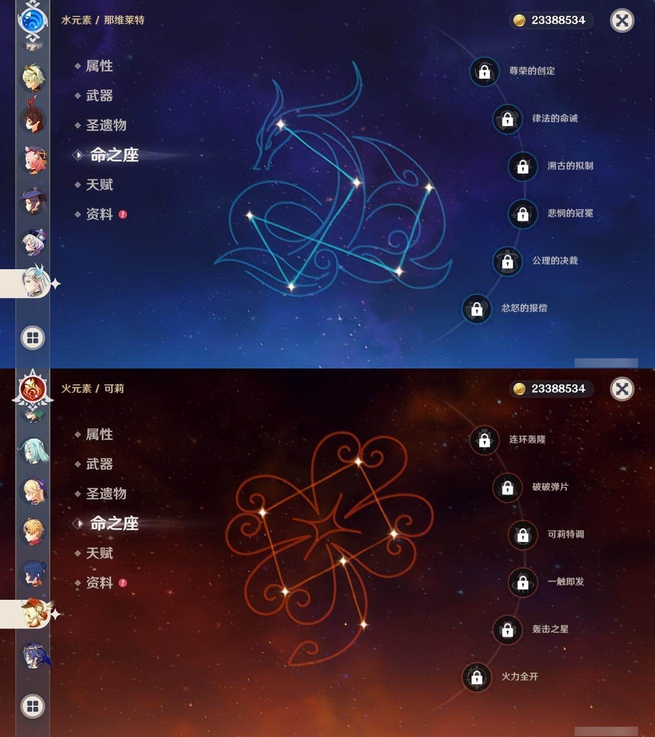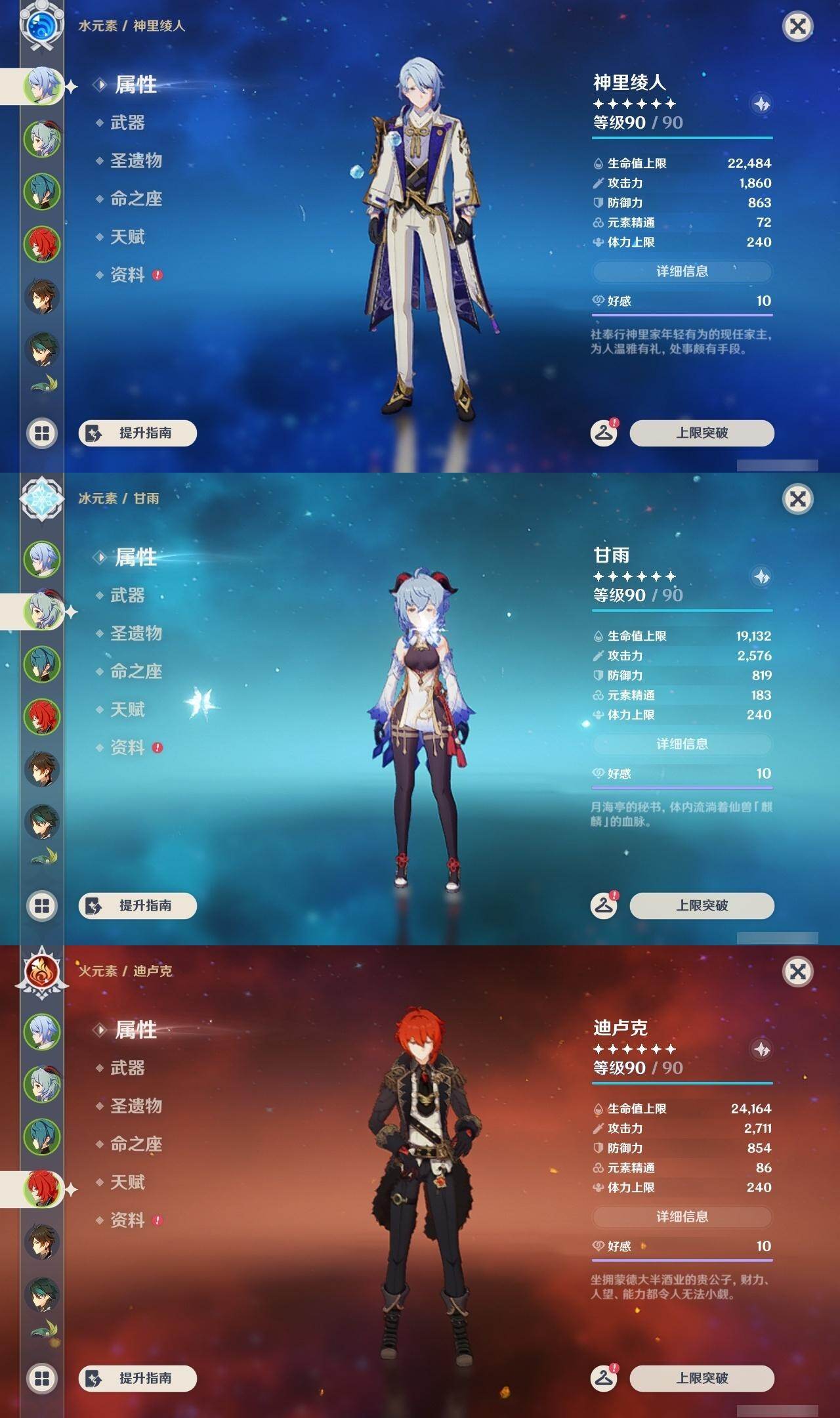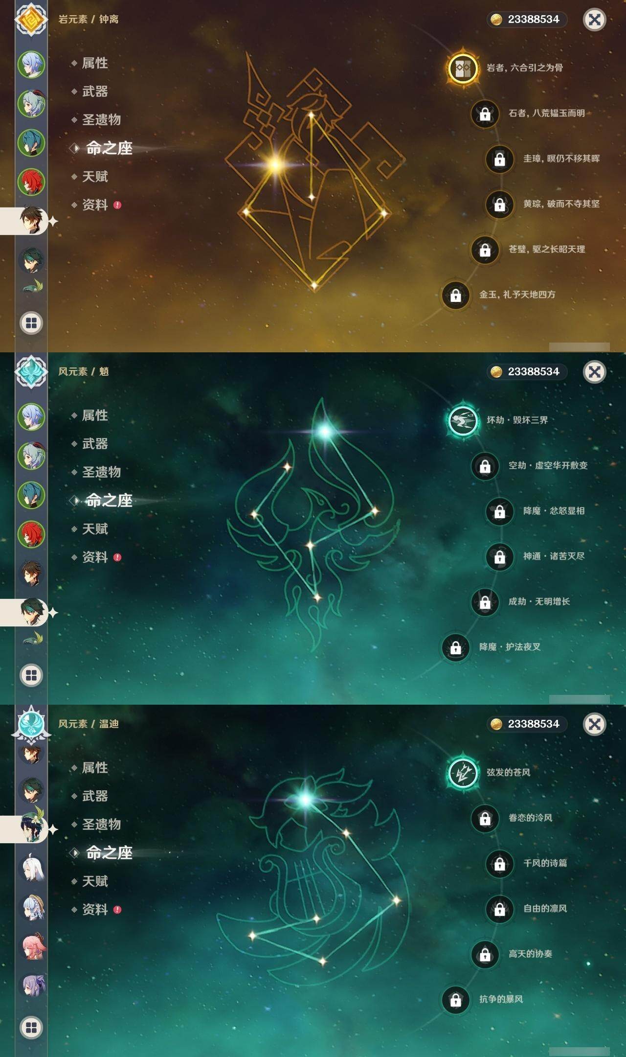 0命那维莱特,0命纳西妲,0命提纳里,0命夜兰,0命神里绫人,1命八重神子,1命申鹤,0命优菈,0命枫原万叶,0命神里绫华,1命钟离,2命胡桃,0命甘雨,1命魈,1命温迪,0命可莉,0命达达利亚,0命珊瑚宫心海,2命刻晴,1命七七,2命琴,3命莫娜,5命迪卢克,精1千夜浮梦,精1若水,精2波乱月白经津,精1神乐之真意,精1终末嗟叹之诗,精1薙草之稻光,精1雾切之回光,精1护摩之杖,精1和璞鸢,精2天空之脊,精1天空之翼,精1阿莫斯之弓,精1天