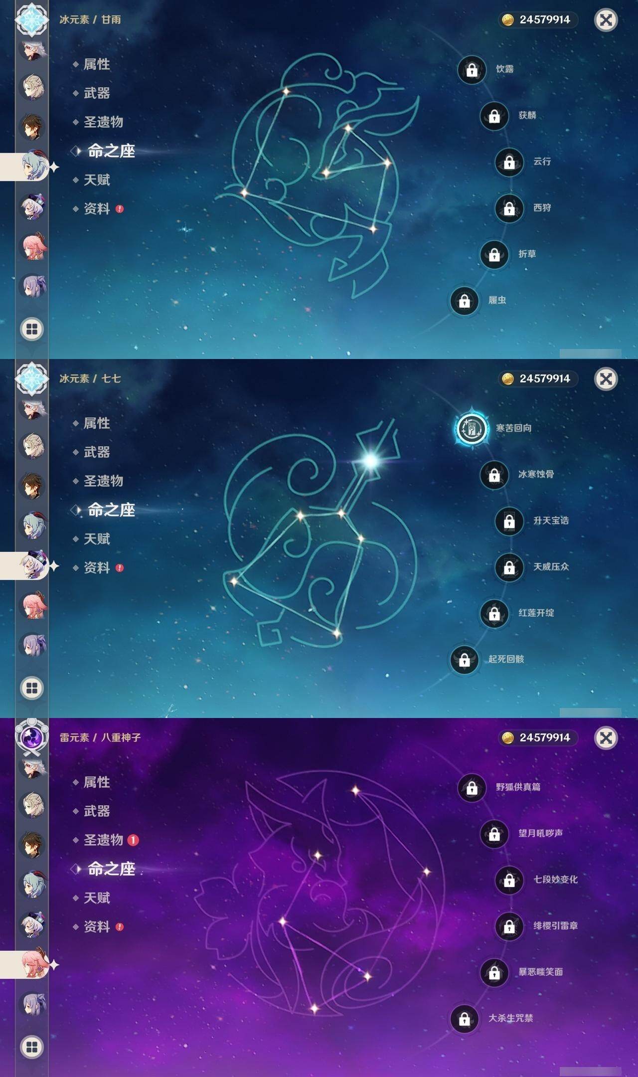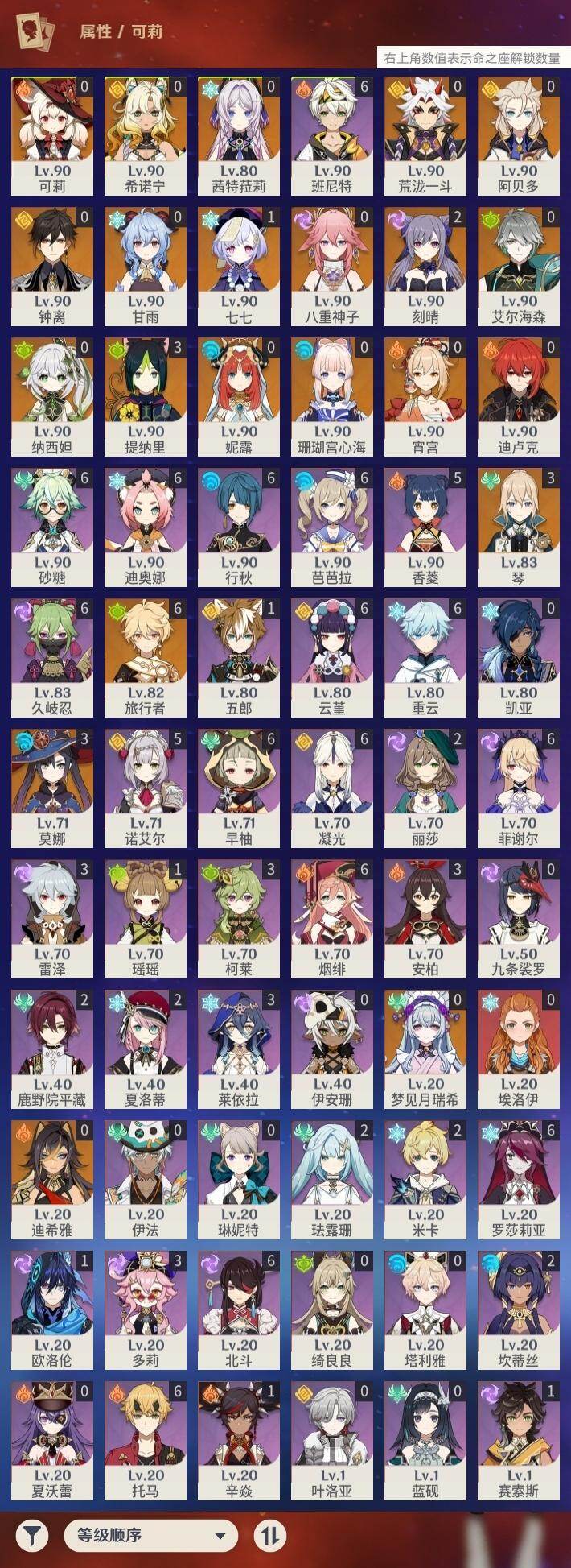0命迪希雅,0命艾尔海森,0命纳西妲,0命妮露,3命提纳里,0命八重神子,0命荒泷一斗,0命钟离,0命甘雨,0命宵宫,0命可莉,0命阿贝多,0命珊瑚宫心海,2命刻晴,1命七七,3命琴,3命莫娜,0命迪卢克,0命希诺宁,0命茜特菈莉,0命梦见月瑞希,精1静水流涌之辉,精1千夜浮梦,精1圣显之钥,精1赤角石溃杵,精1雾切之回光,精3四风原典,精1和璞鸢,精1天空之翼,精1阿莫斯之弓,精1天空之刃,精1天空之卷,精1狼的末路