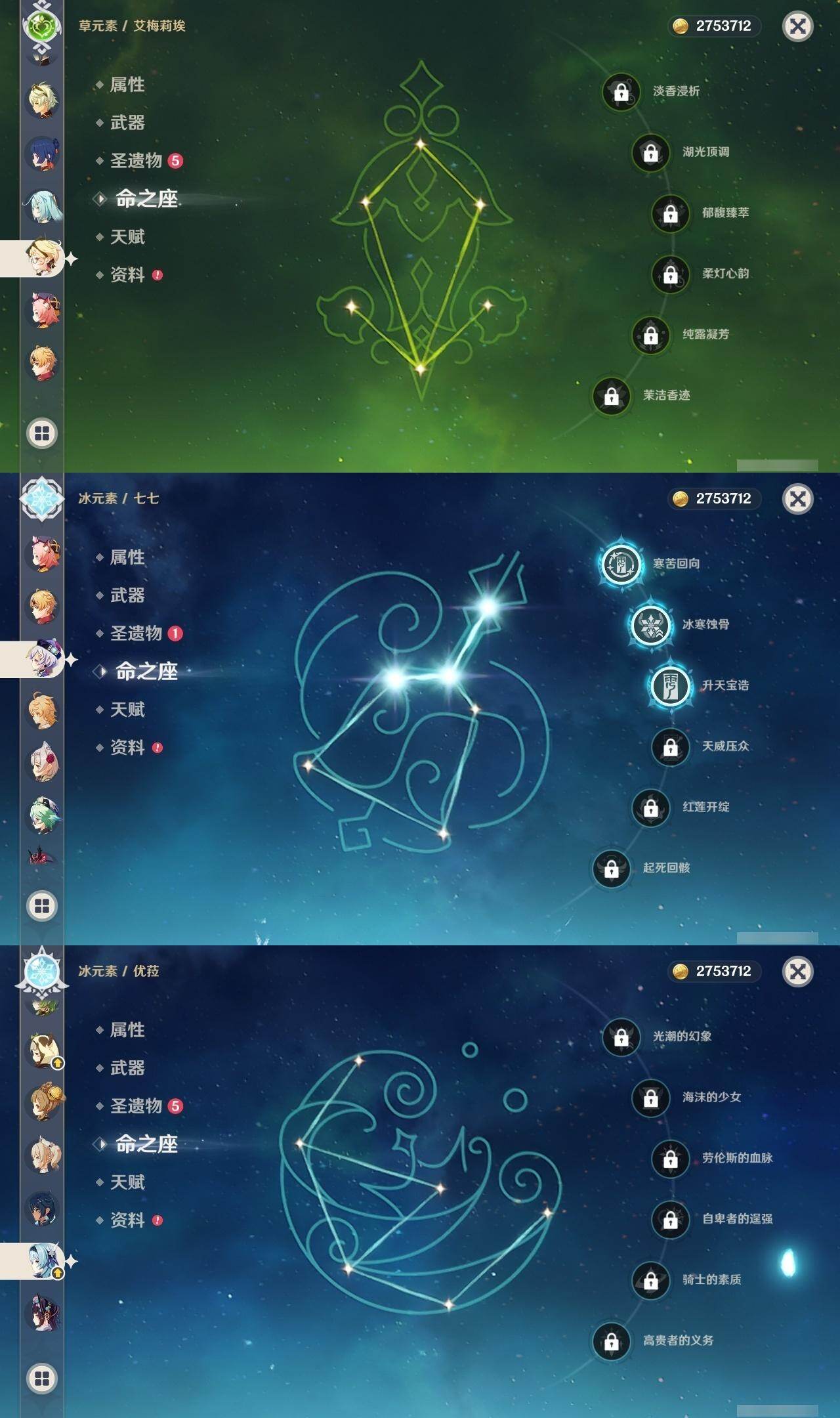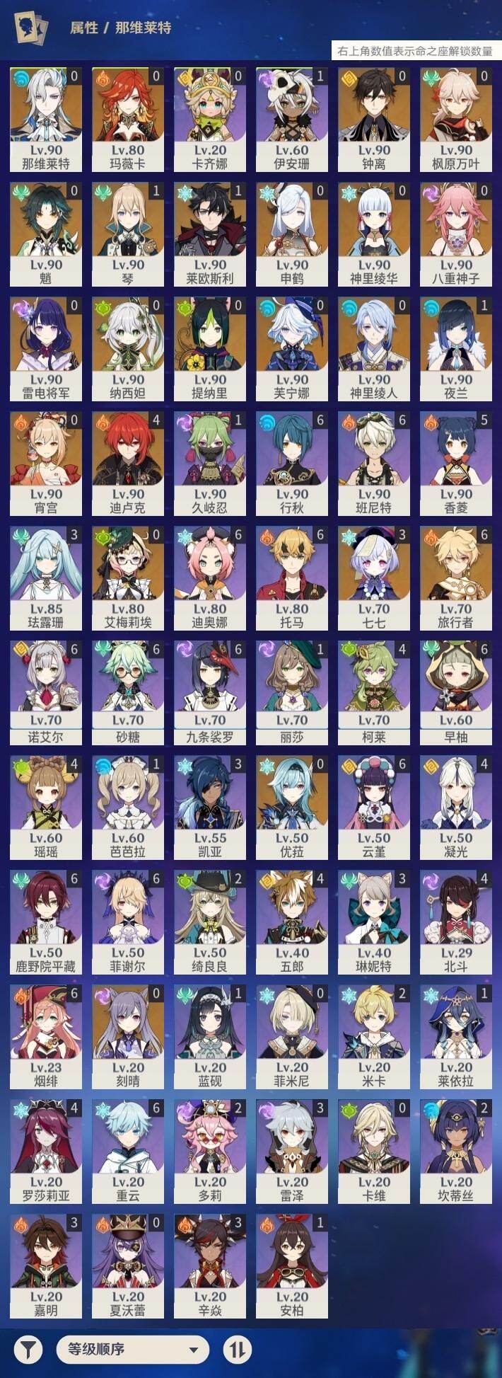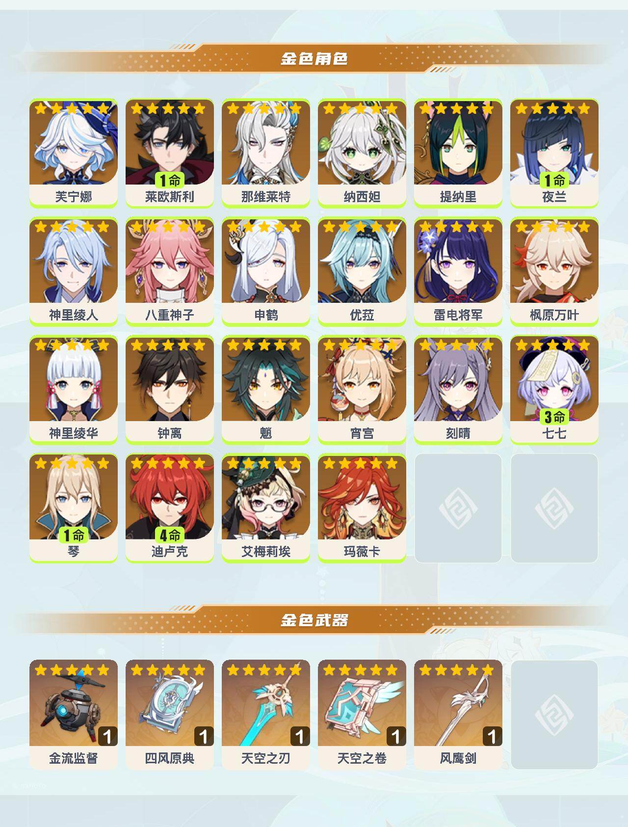 0命芙宁娜,1命莱欧斯利,0命那维莱特,0命纳西妲,0命提纳里,1命夜兰,0命神里绫人,0命八重神子,0命申鹤,0命优菈,0命雷电将军,0命枫原万叶,0命神里绫华,0命钟离,0命魈,0命宵宫,0命刻晴,3命七七,1命琴,4命迪卢克,0命艾梅莉埃,0命玛薇卡,精1金流监督,精1四风原典,精1天空之刃,精1天空之卷,精1风鹰剑
