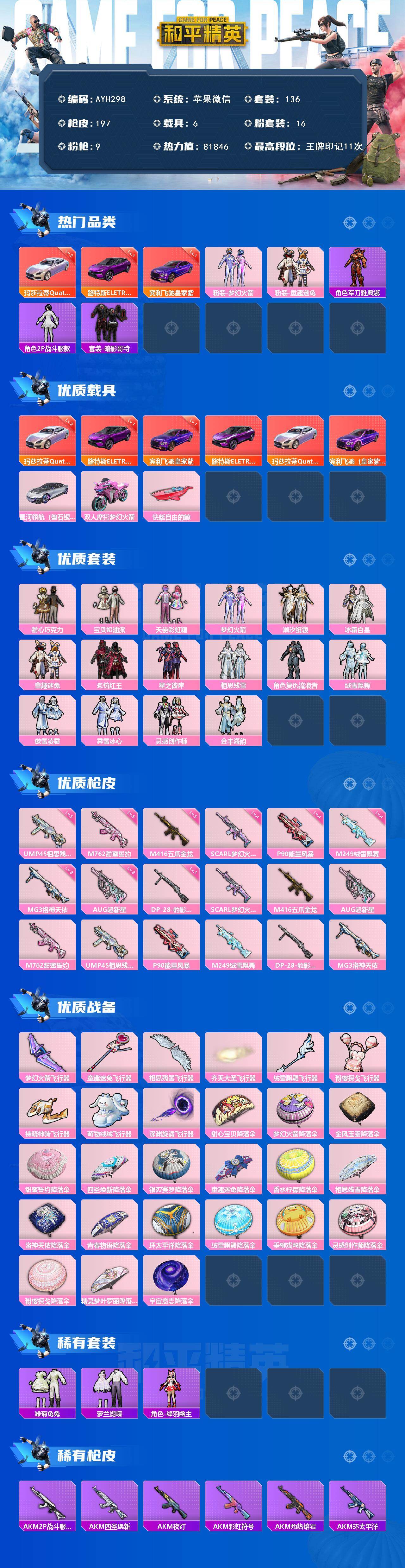 苹果 微信-16粉装-9特效枪-6载具-9粉色飞行器-81846热力值-11王牌印记-136套装-197枪皮
