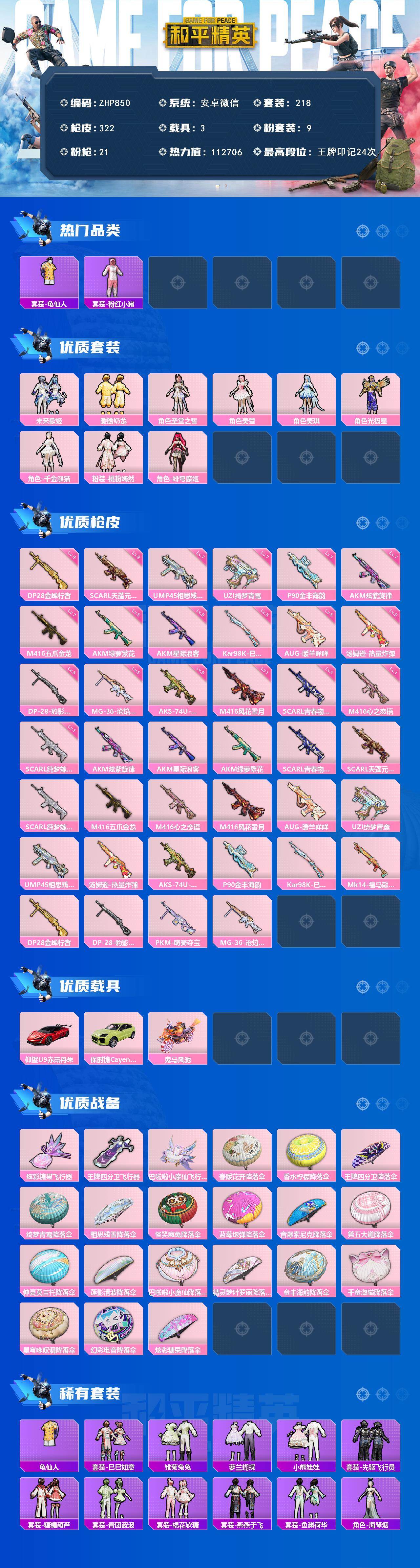 安卓 微信-9粉装-21特效枪-3载具-3粉色飞行器-112706热力值-24王牌印记-218套装-322枪皮