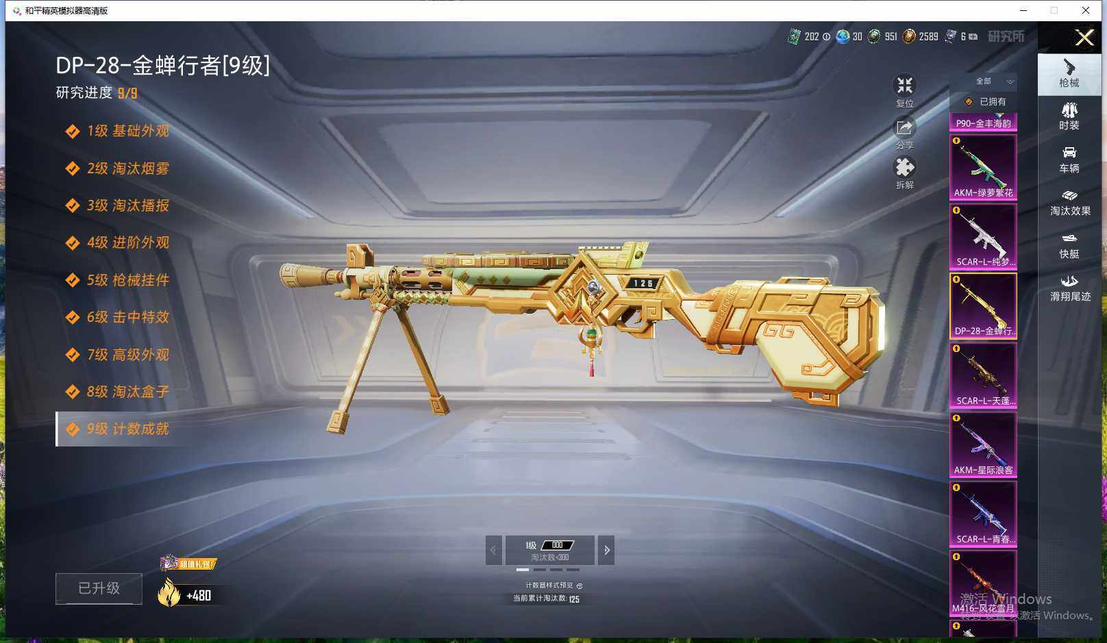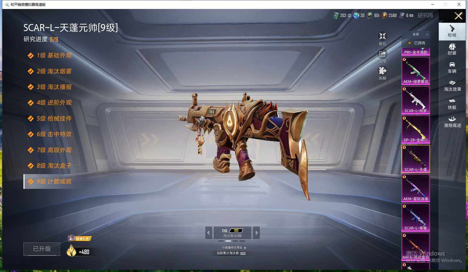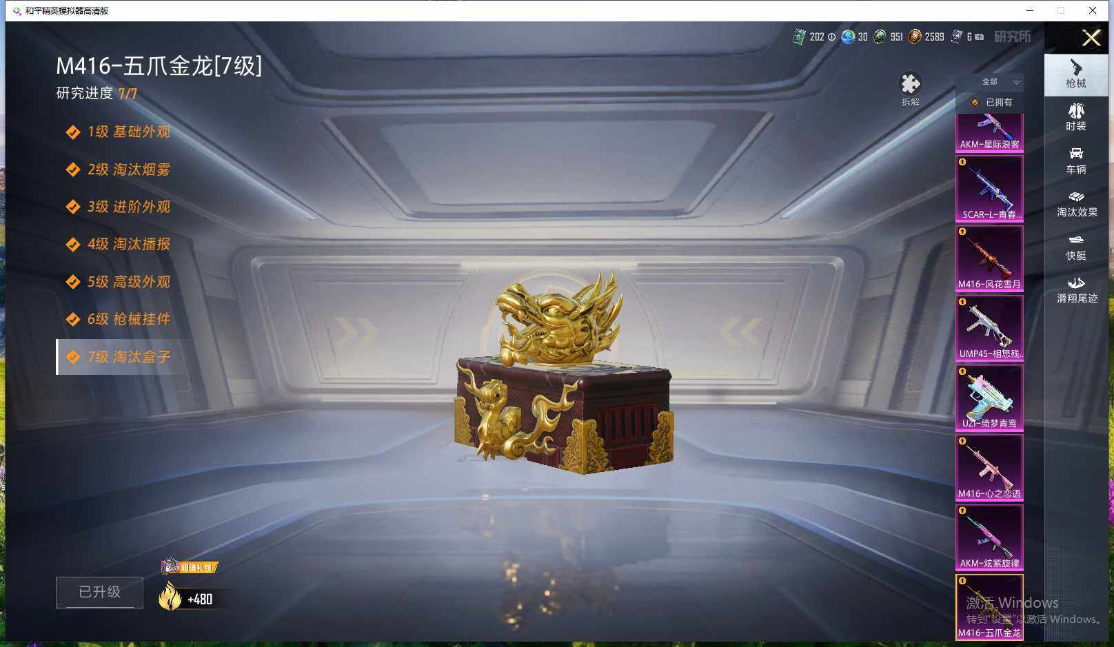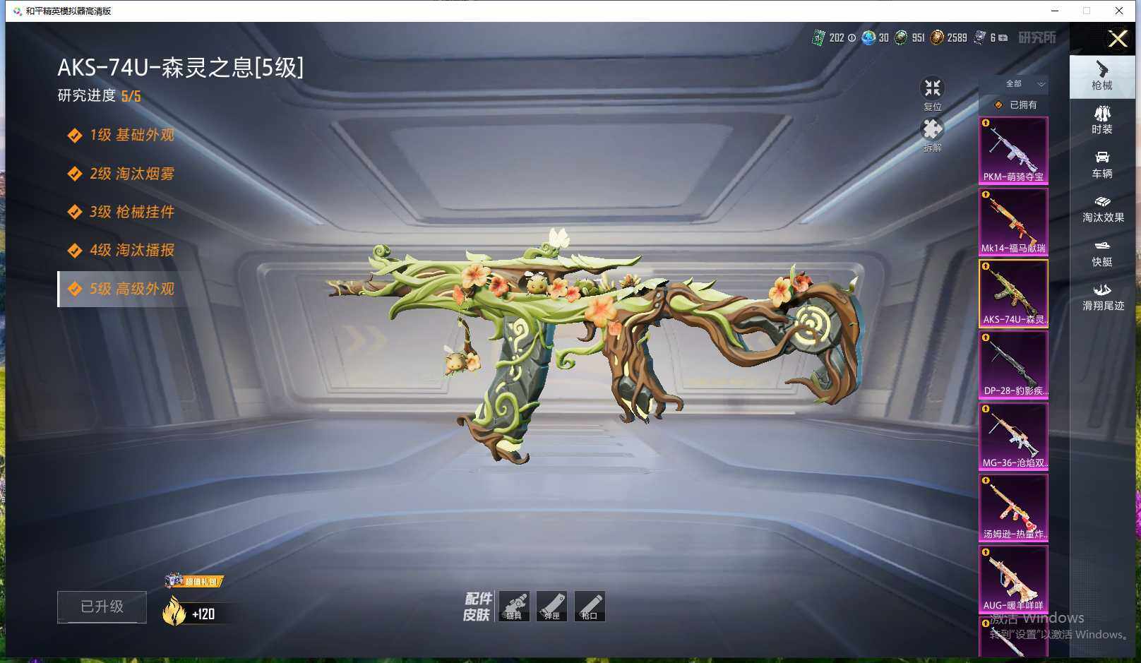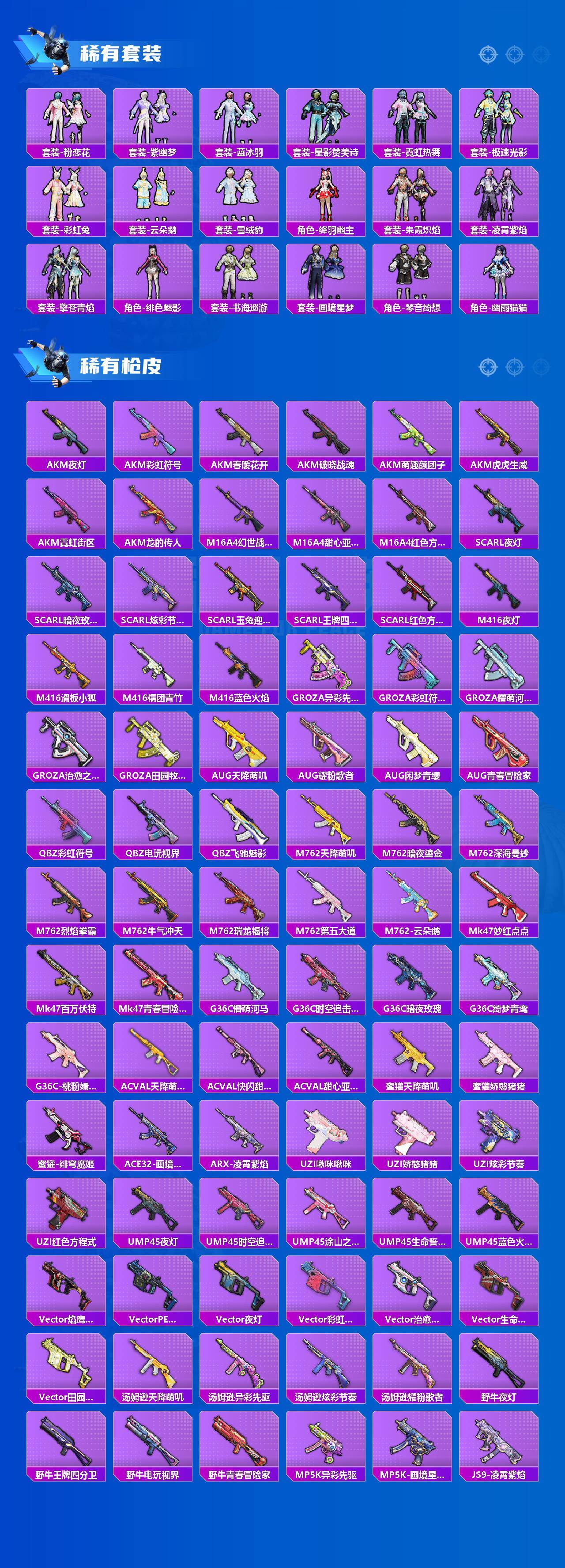 【粉色枪皮等级】:AKM-炫紫旋律(七级),AKM-星际浪客(五级),AKM-绿萝繁花(五级),SCAR-L-青春物语(一级),SCAR-L-天蓬元帅(九级),SCAR-L-纯梦嫁纱(一级),M4