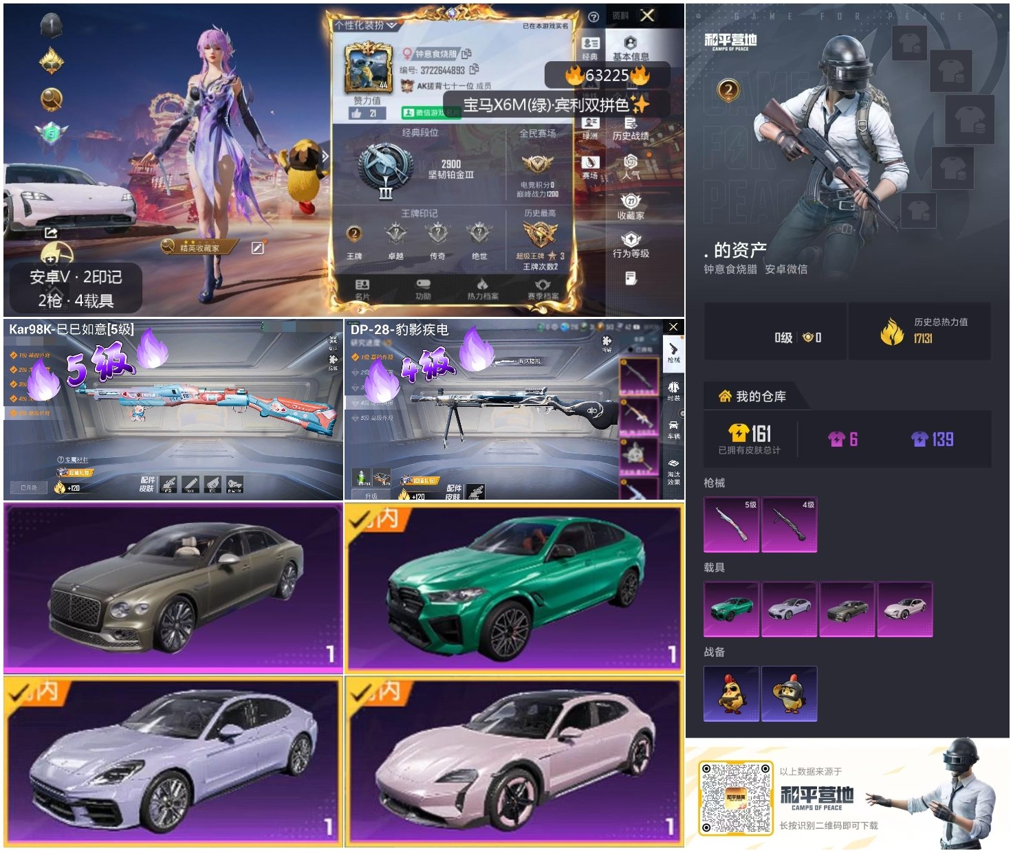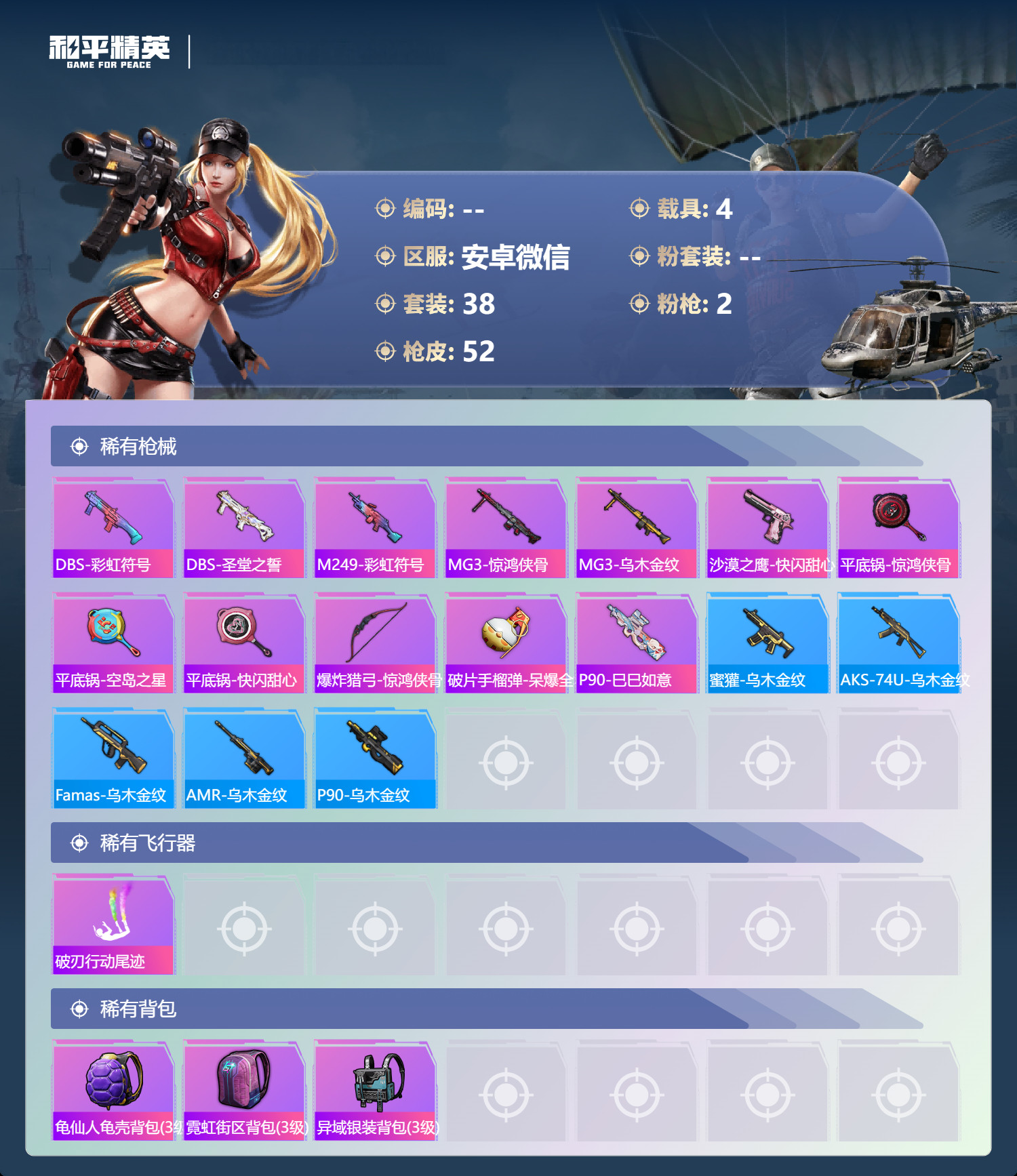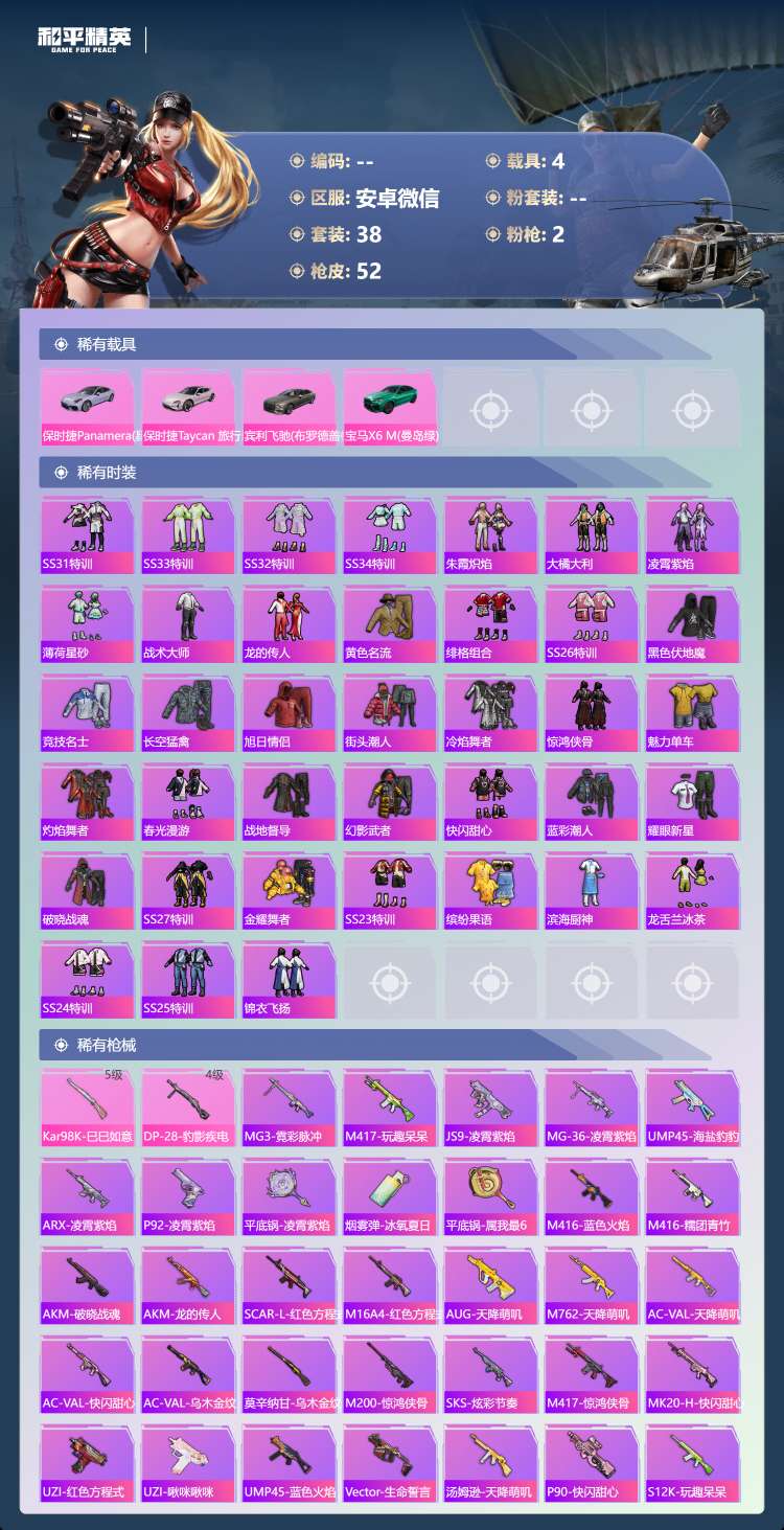 hs63225 安卓微-2王牌印记-2特效枪-4载具-17161热力值-38套装-52枪皮 【2特