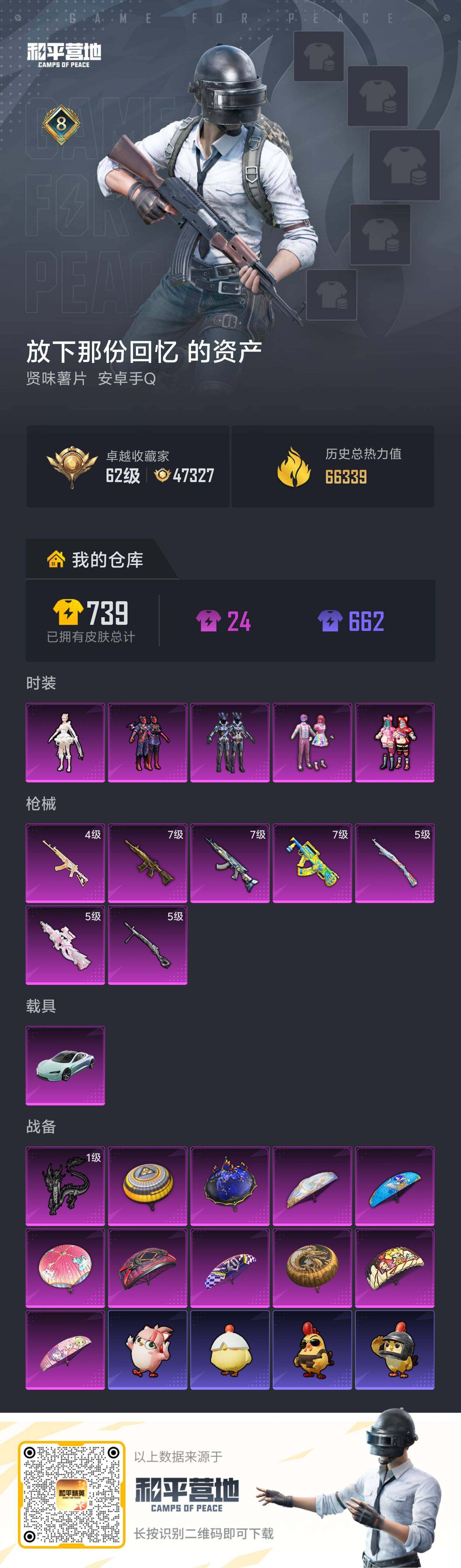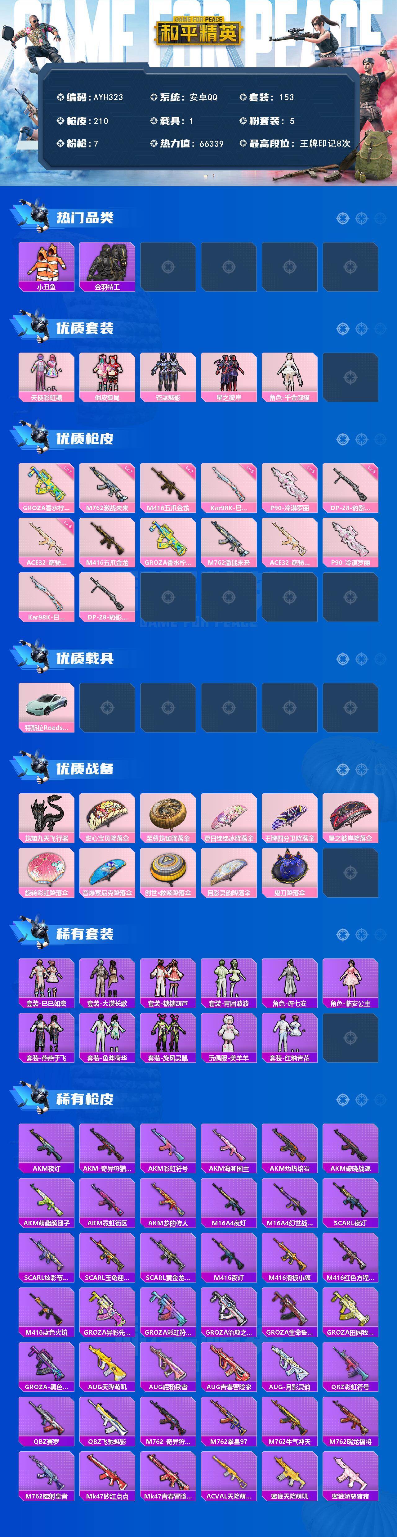 【店主推荐捡漏号】安卓 手Q-5粉装-7特效枪-1载具-1粉色飞行器-66339热力值-8王牌印记-153套装-210枪皮【热门品类】:套装-小丑鱼,套装-金羽特工【粉色套装】:粉装-天使彩虹糖,粉装-俏皮狐尾,粉装-苍蓝魅影,粉装-星之彼岸,角色-千金淑猫【粉色枪皮等级】:M416-五爪金龙(七级),GROZA-香水柠檬(七级),M762-激战未来(七级),ACE32-萌骑漫游(四级),P90-冷漠罗丽(五级),Kar98K-巳巳如意(五级),DP-28-豹影疾电(五级)【粉色载具】:特斯拉R