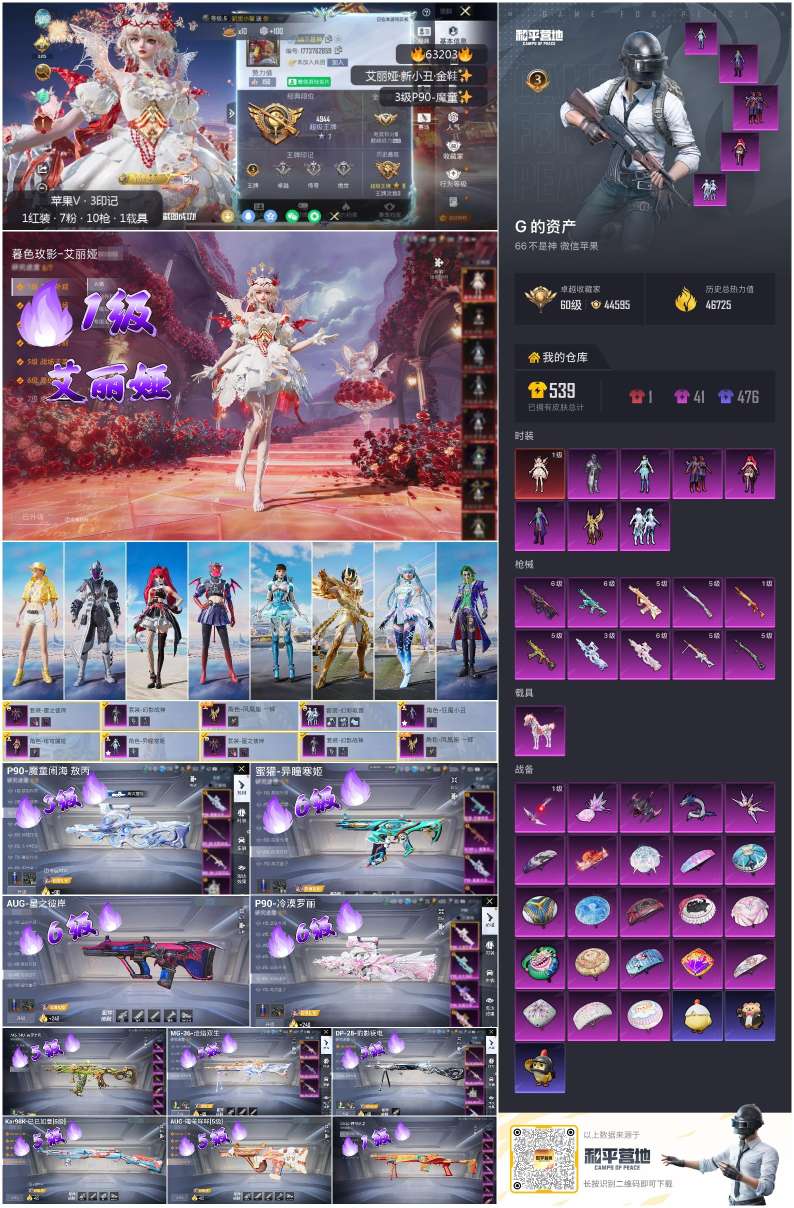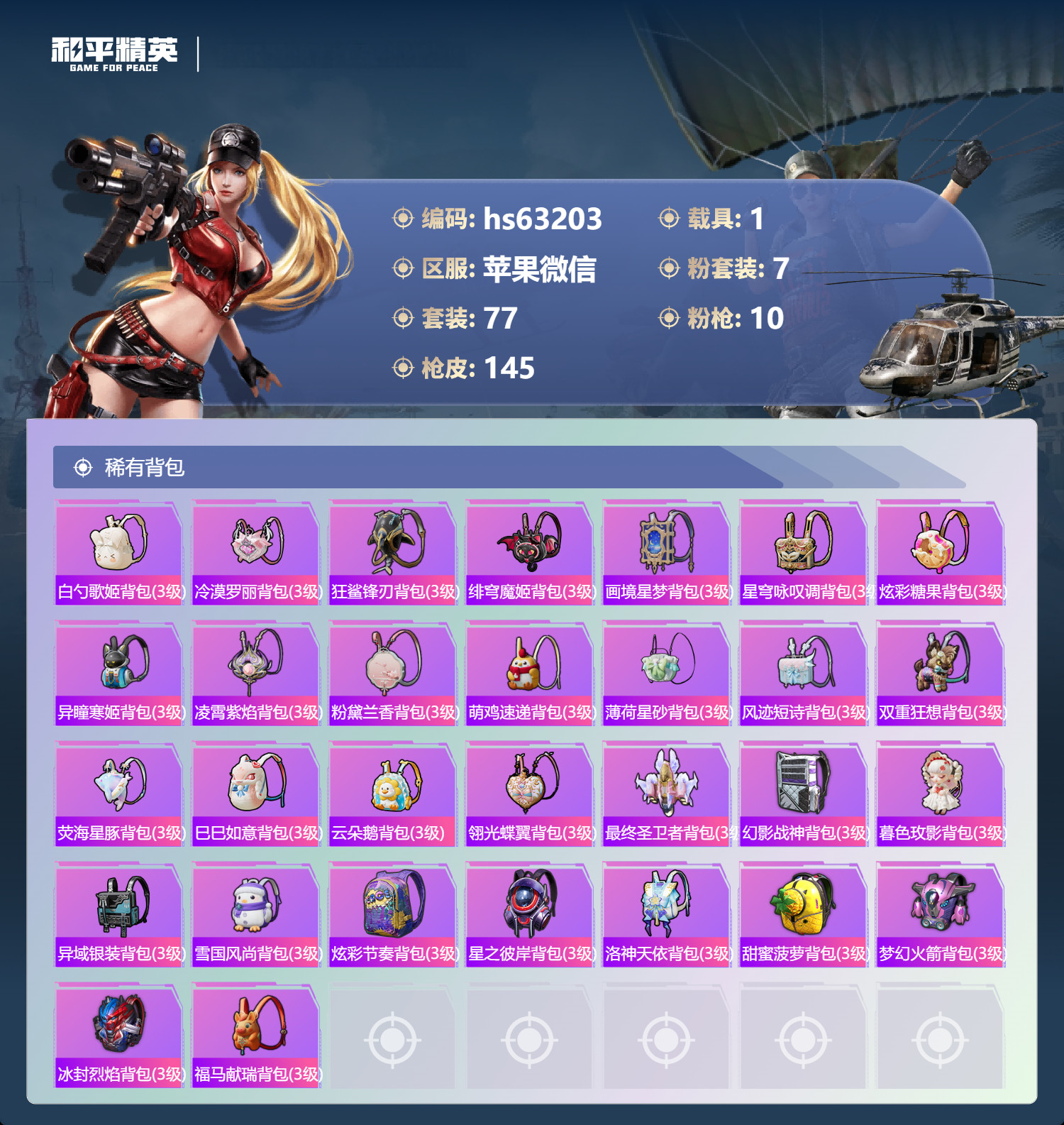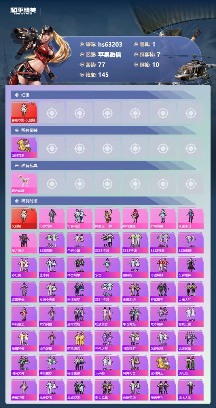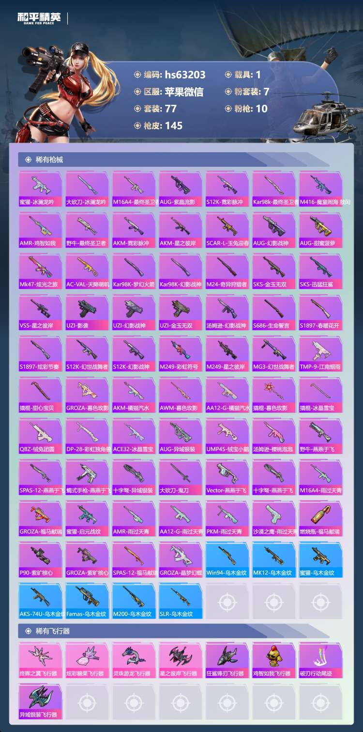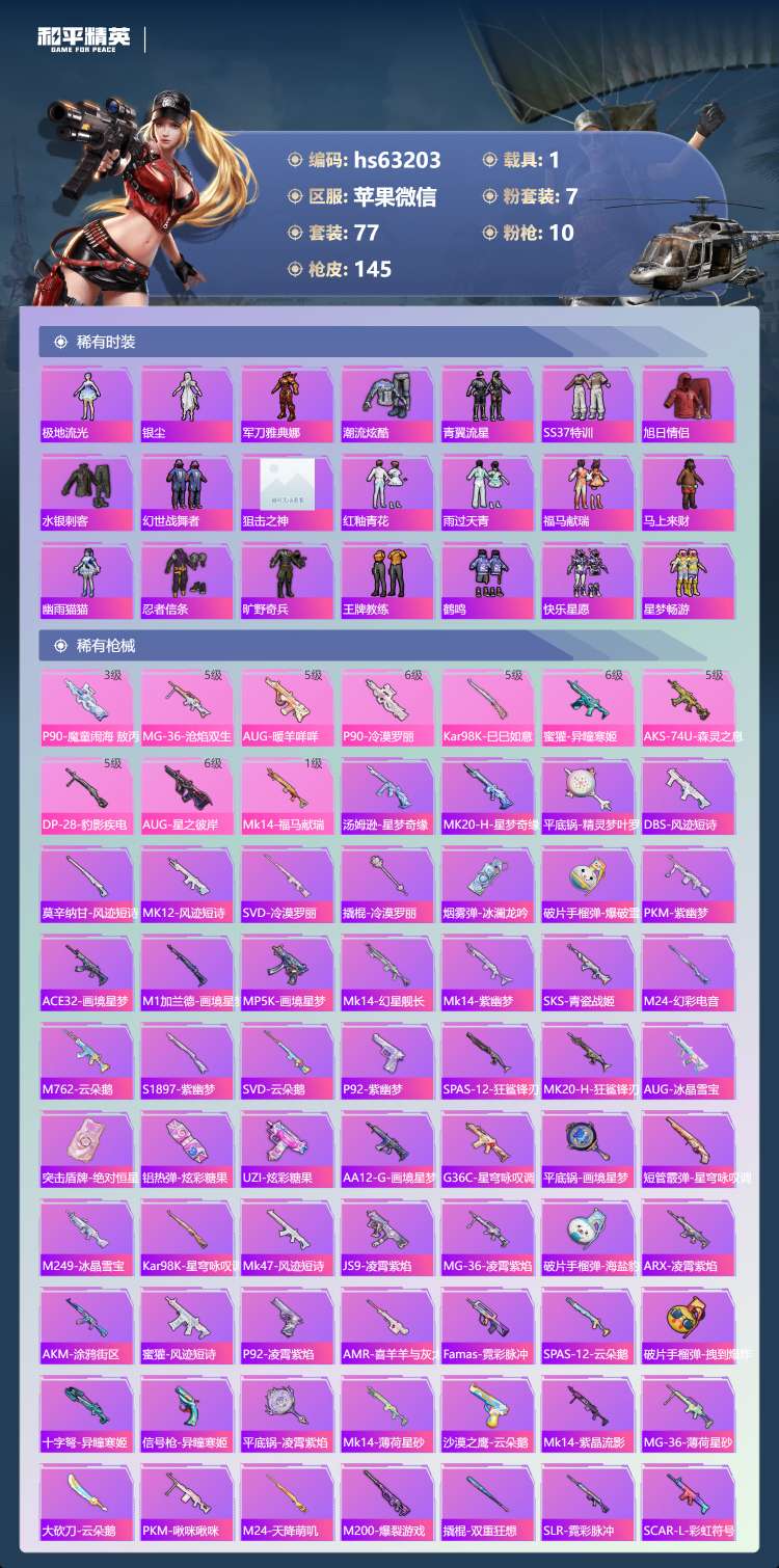 hs63203 苹果微-3王牌印记-1红装-7粉装-10特效枪-1载具-46755热力值-77套装