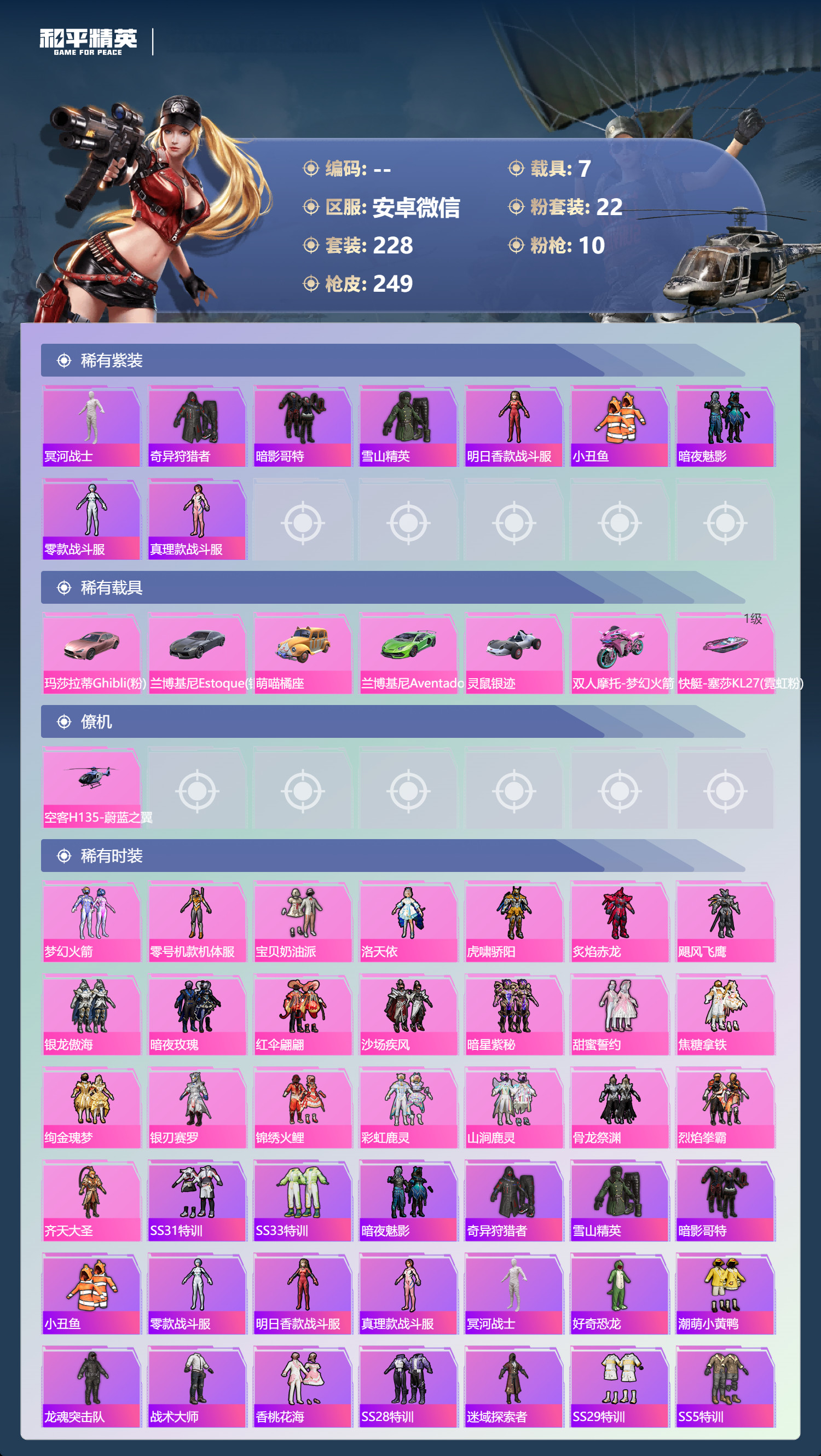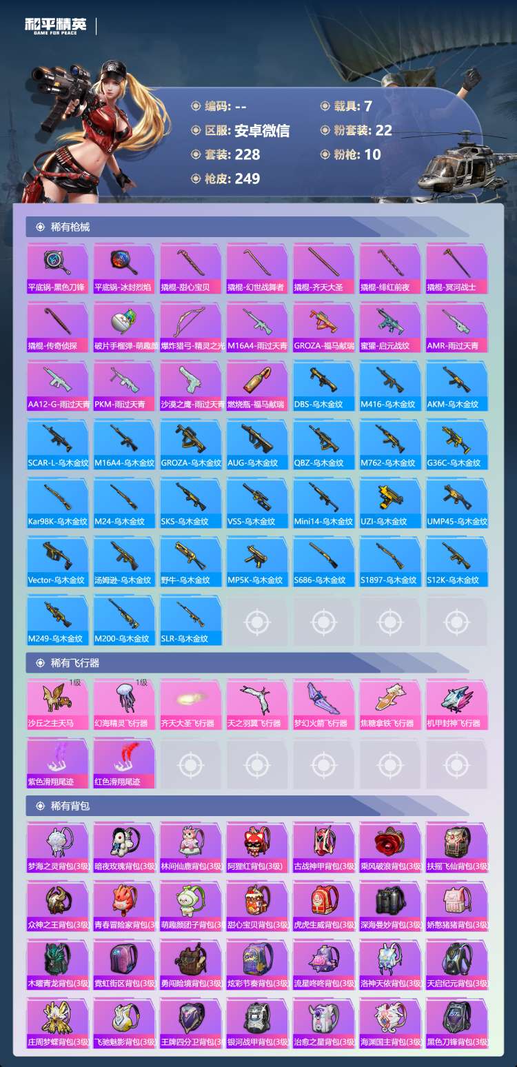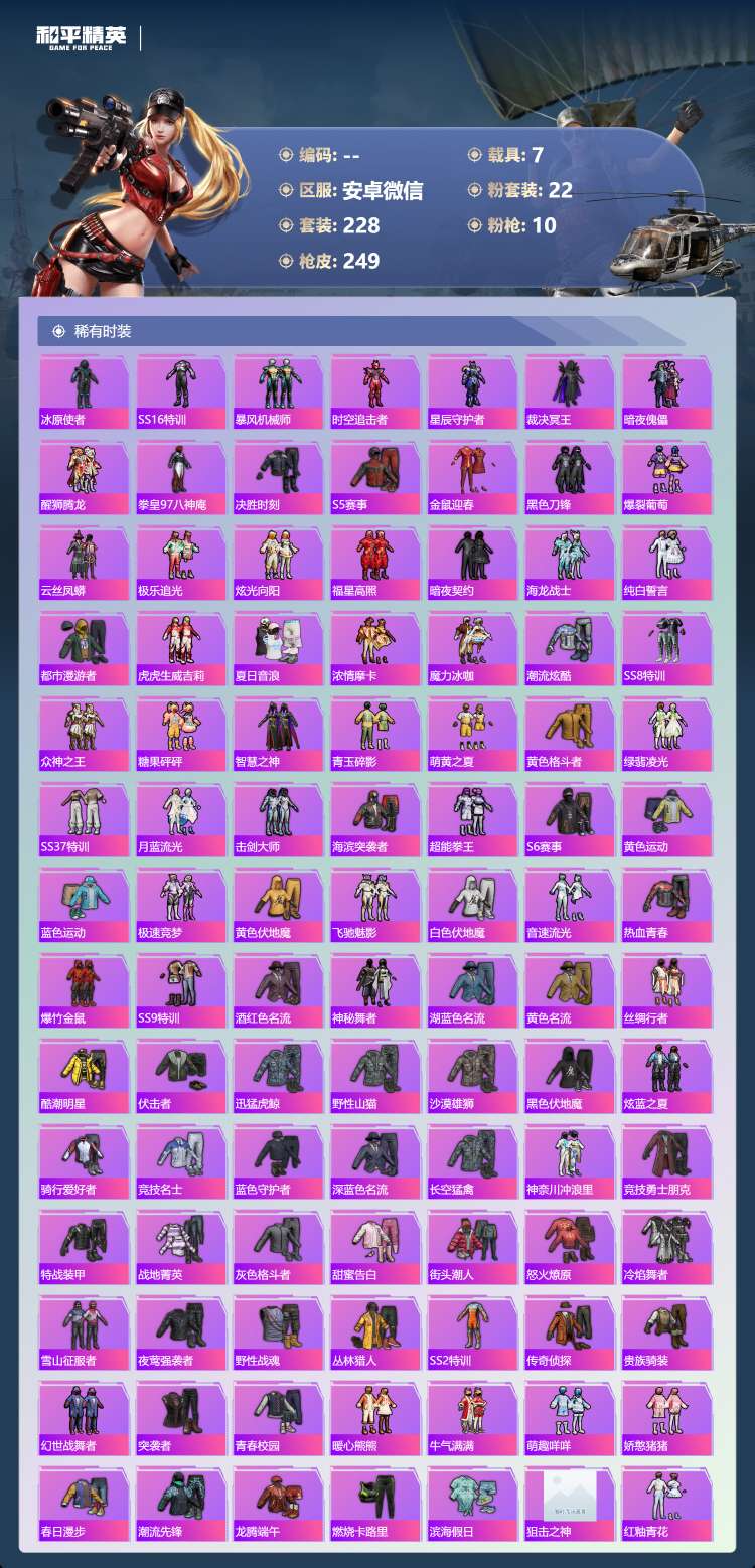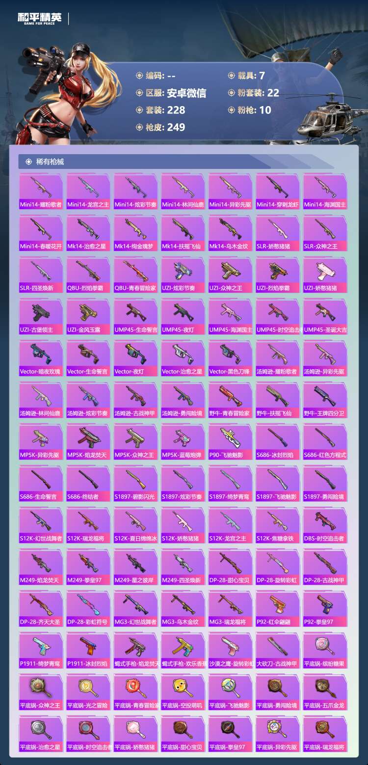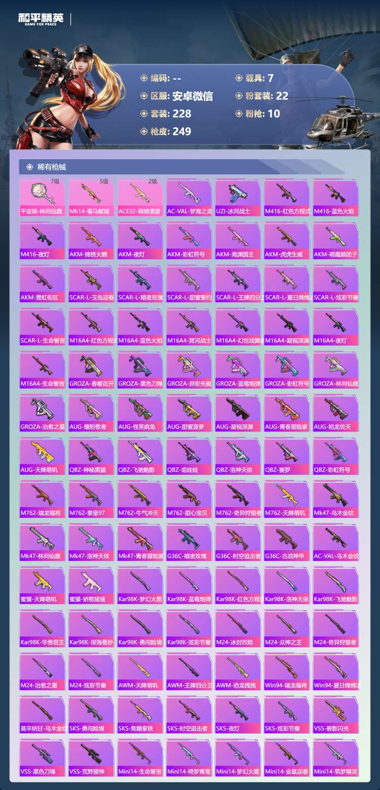 hs63188 安卓微-15王牌印记-22粉装-10特效枪-7载具-97135热力值-228套装-