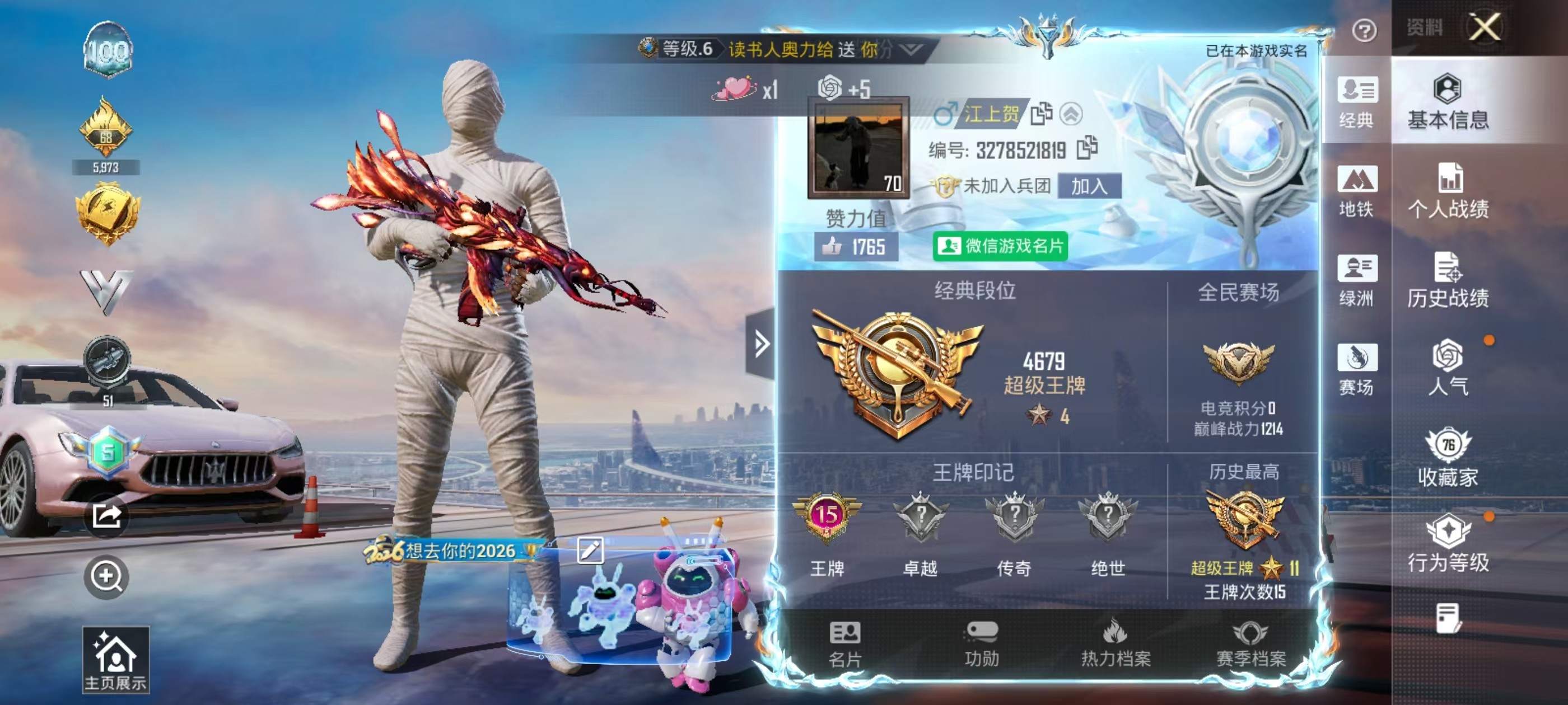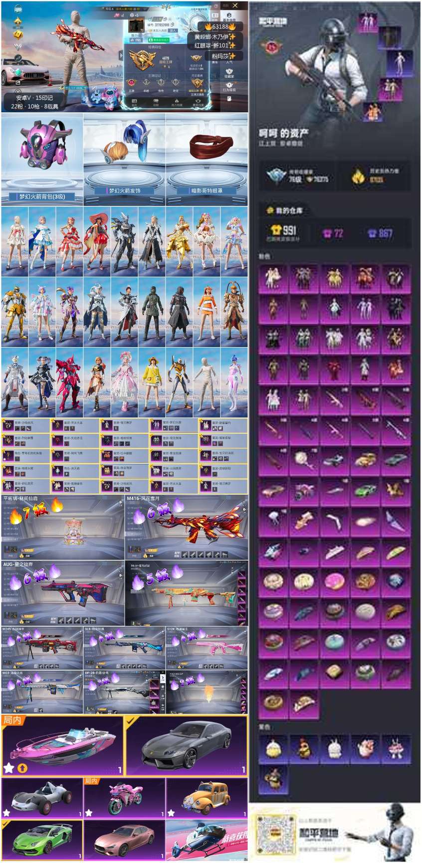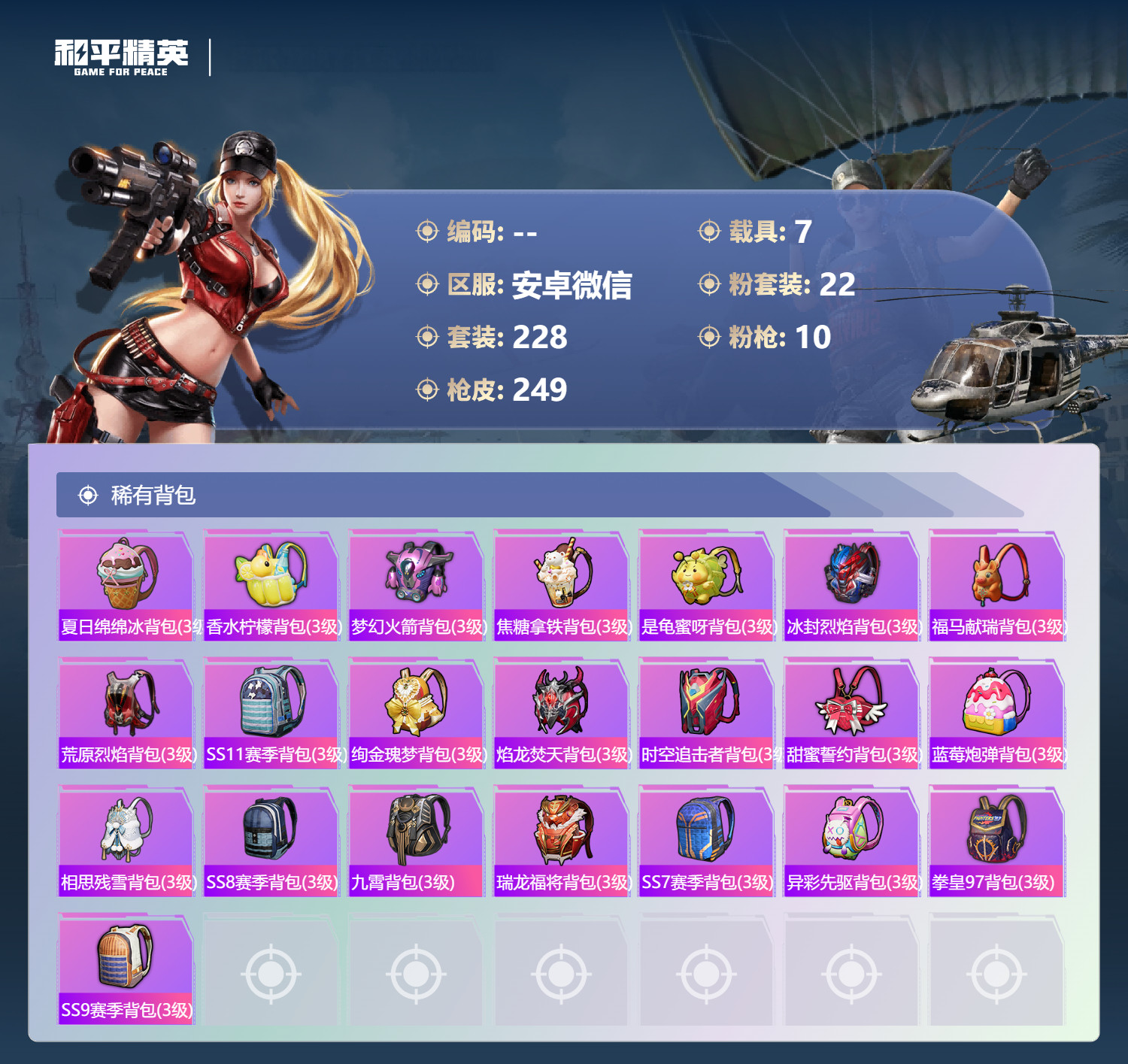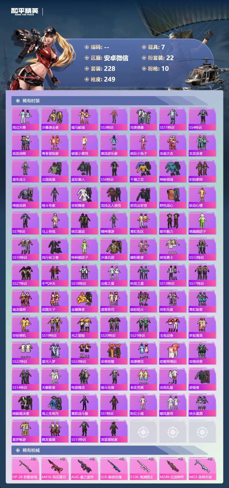 hs63188 安卓微-15王牌印记-22粉装-10特效枪-7载具-97135热力值-228套装-