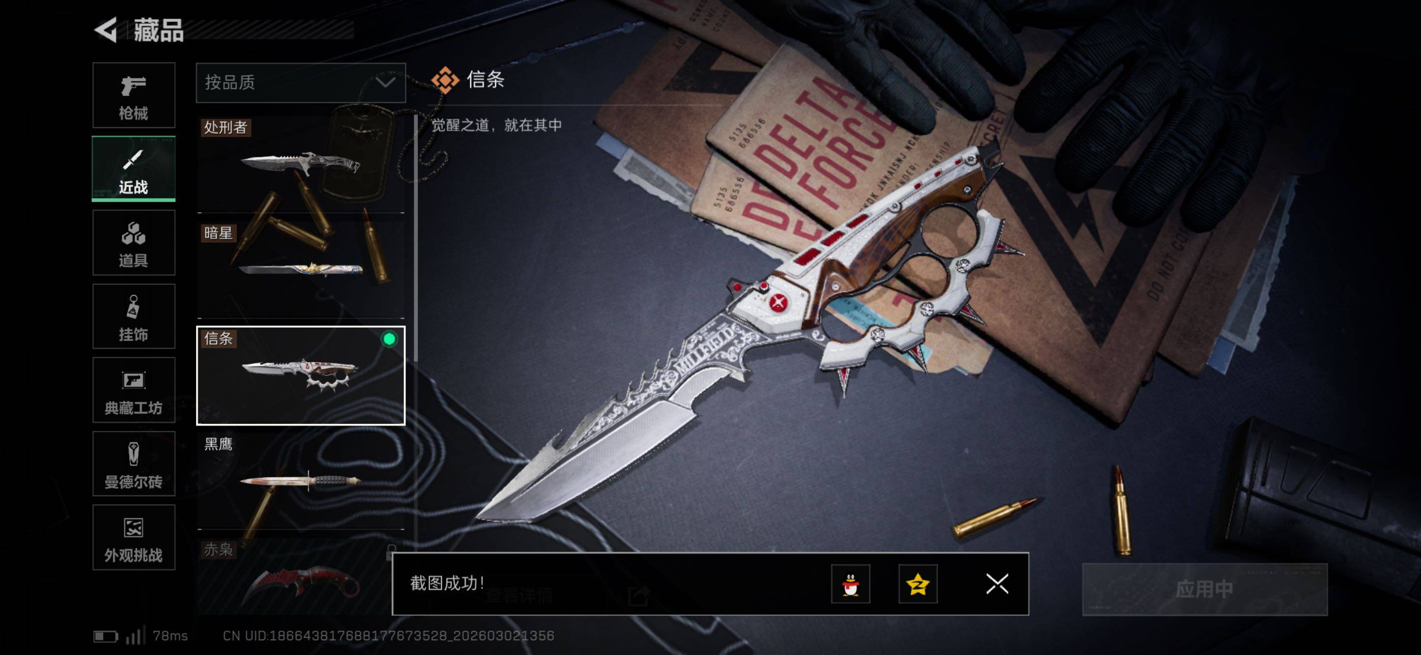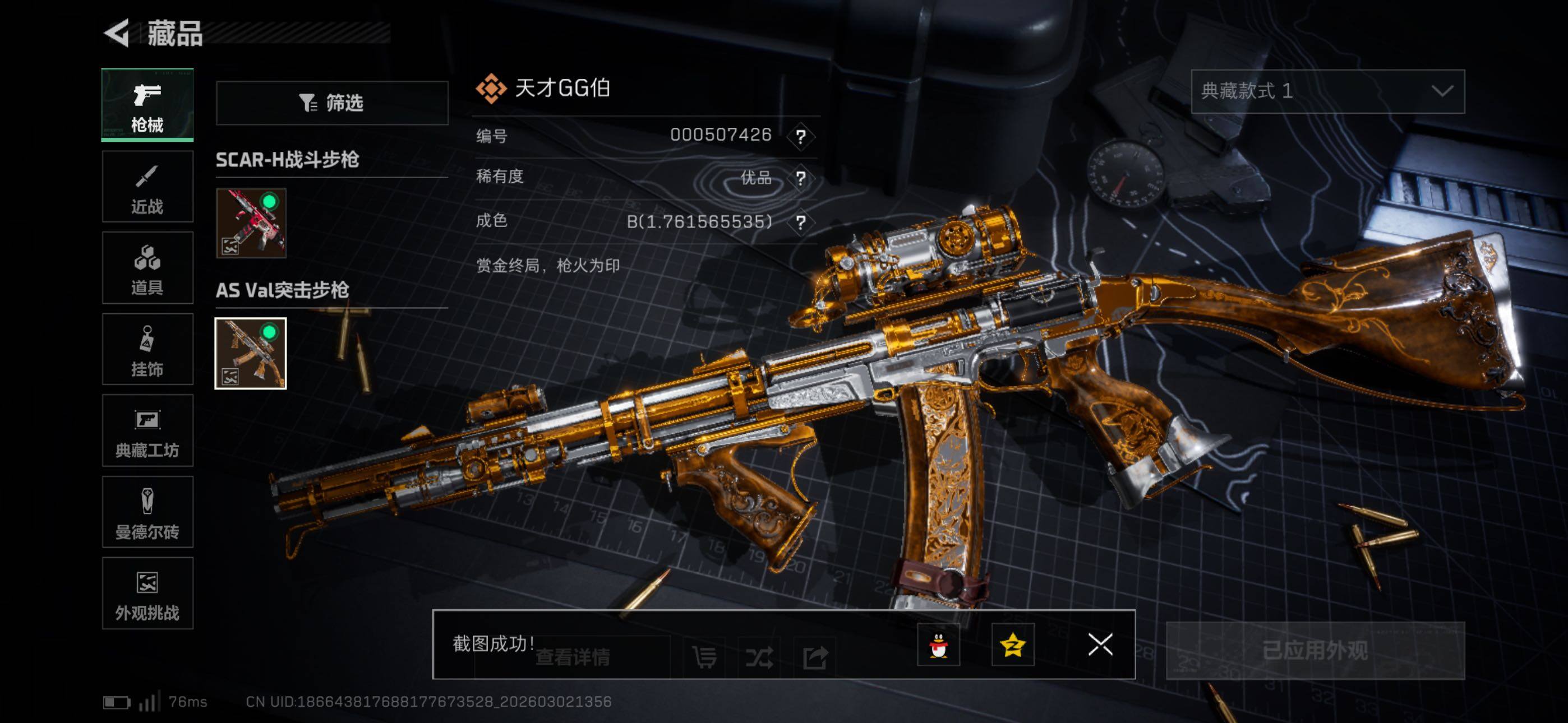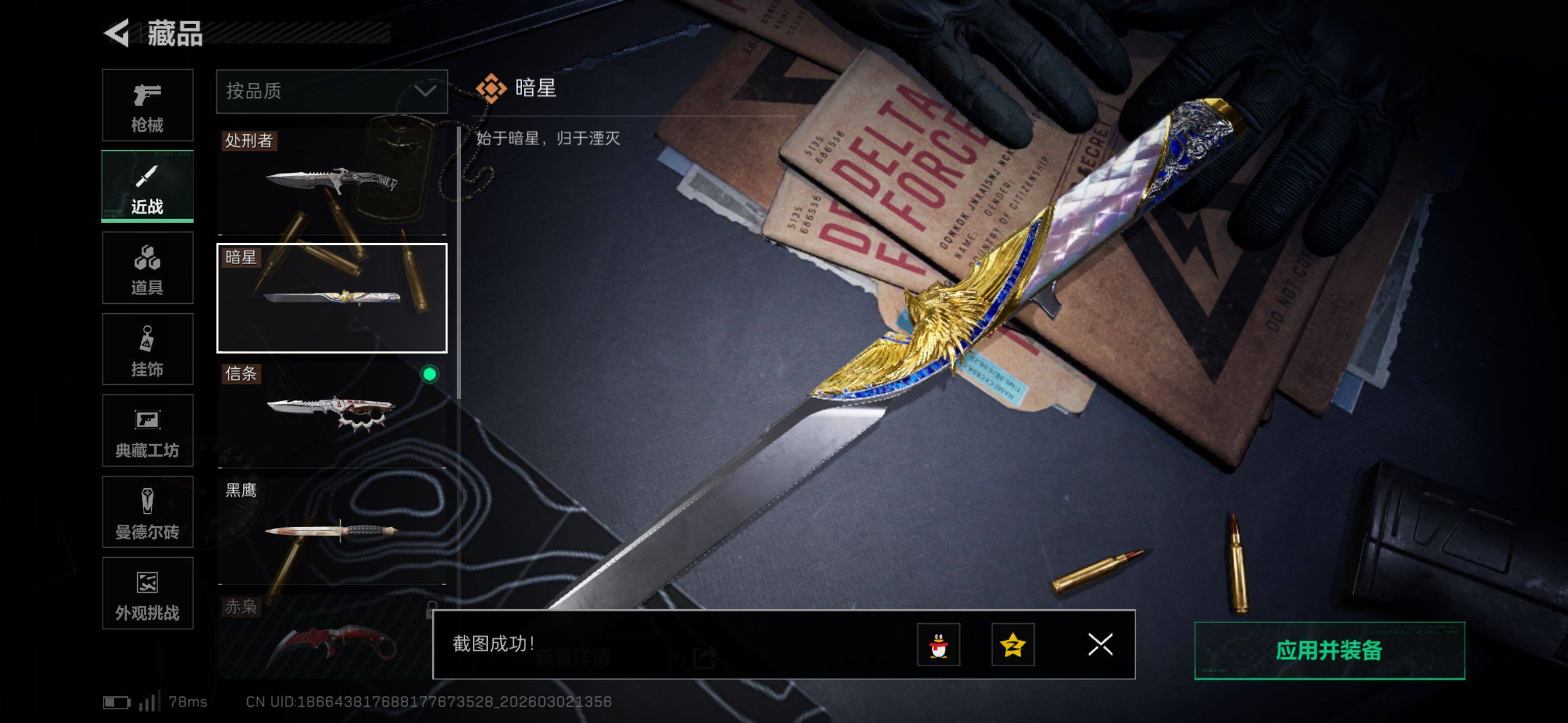 {特价出售}等级:60总资产:60.2M 纯币15761K 隐藏挂饰:1S财神到 刀皮:近战-暗星/近战-处刑者/近战-信条 砖皮: SCAR-H战斗步枪-电玩高手(优品A)/AS Val突击步枪-悬赏令(优品B) 特勤处:仓库7,训练7,靶场6,潜水2 部门23323 深蓝-不破誓约,露娜-金牌射手
