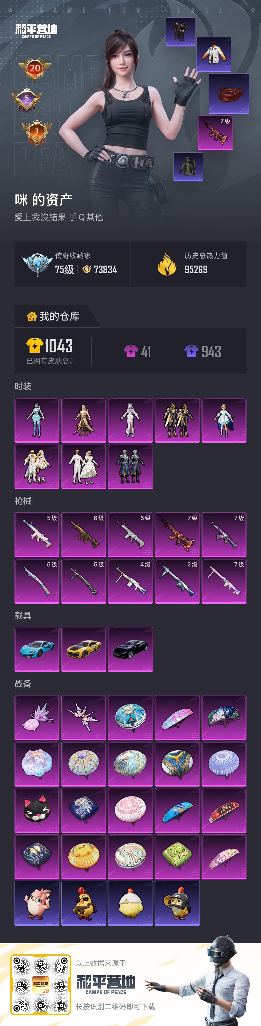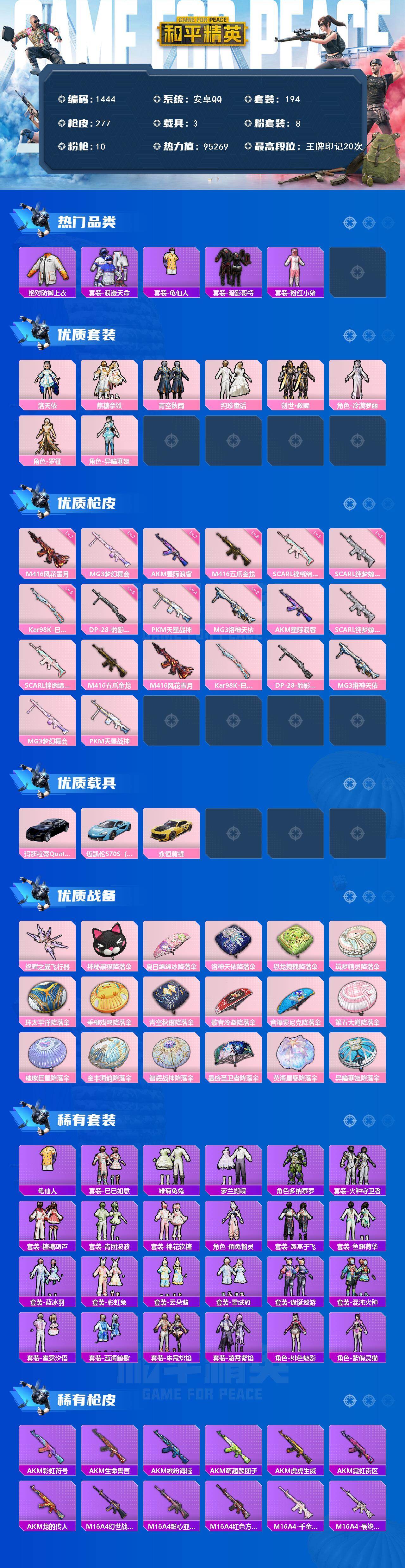 wj【秒换绑,可二次】安卓 手Q-8粉装-10特效枪-3载具-2粉色飞行器-95269热力值-20王牌印记-194套装-277枪皮