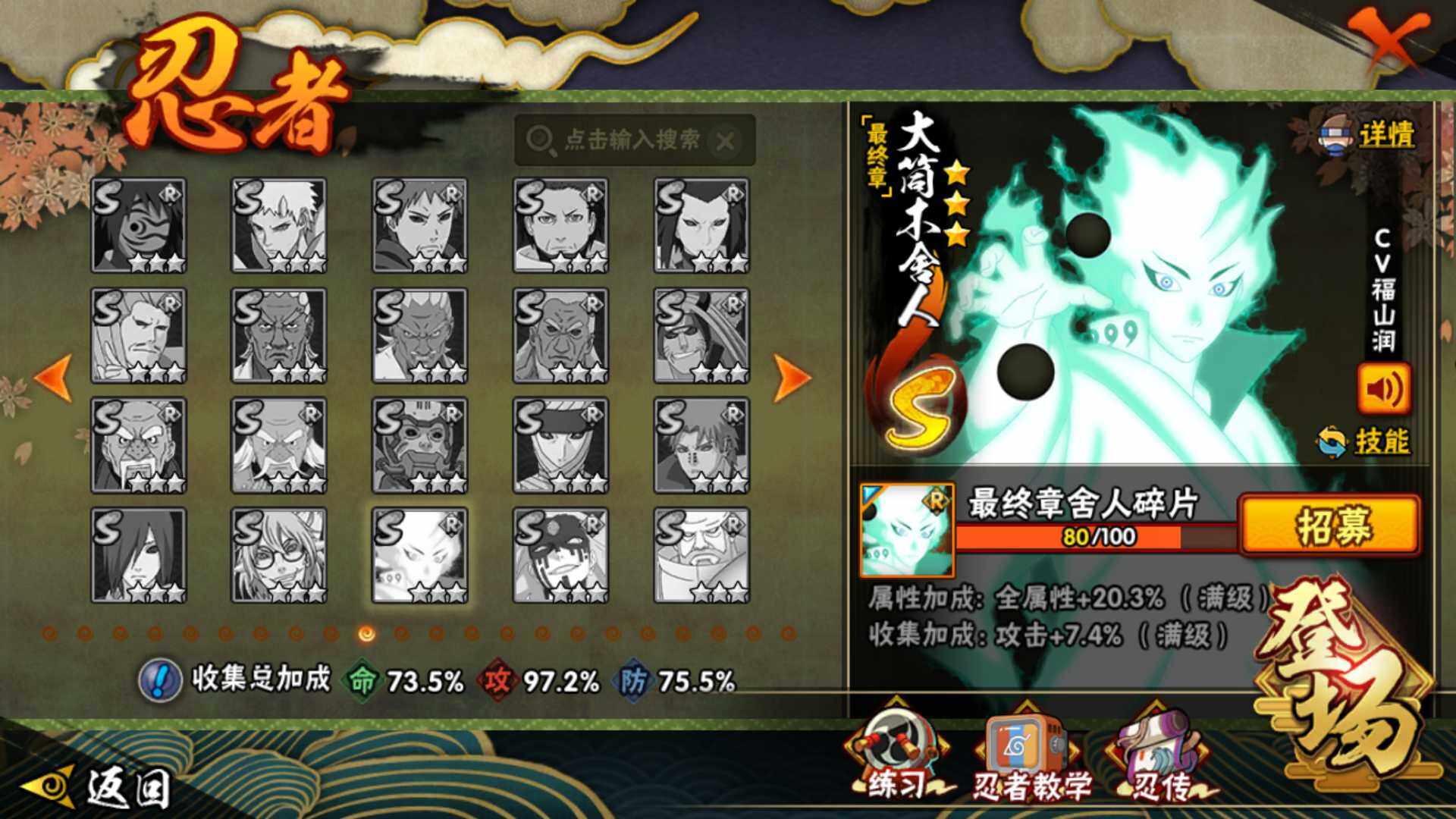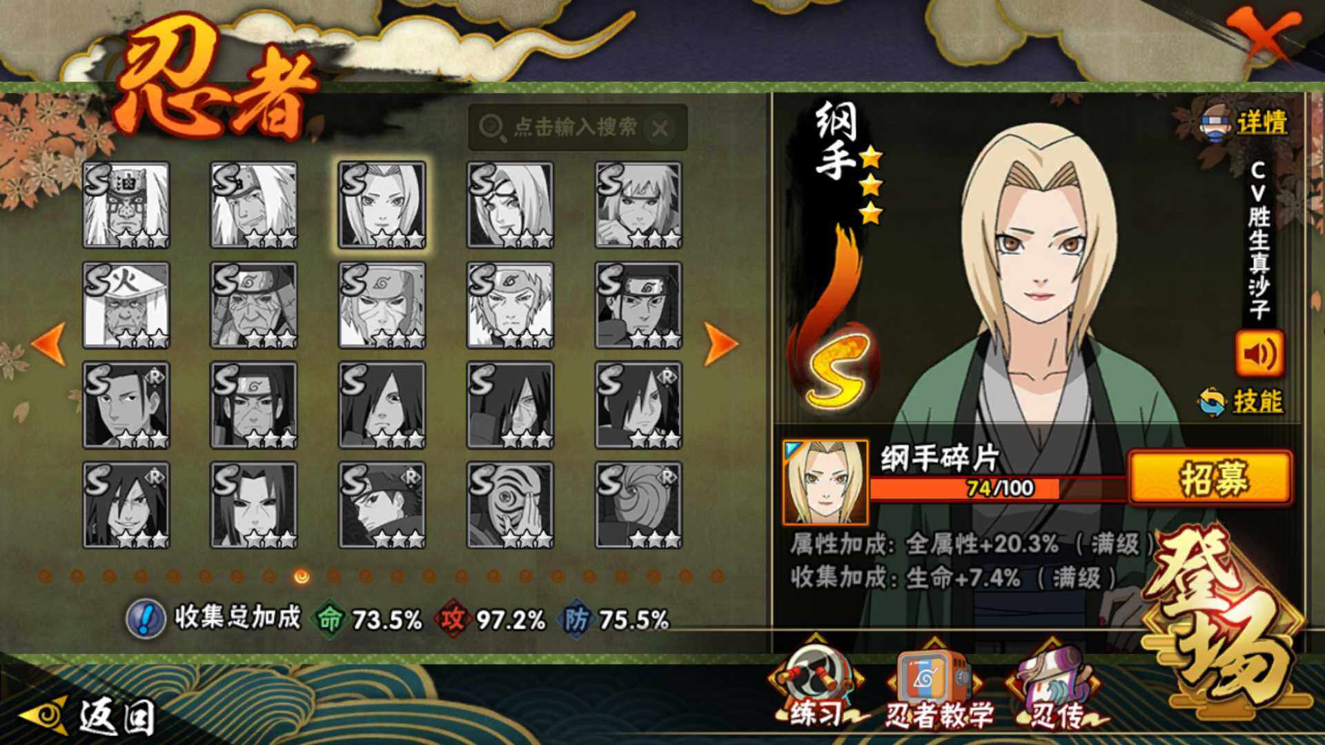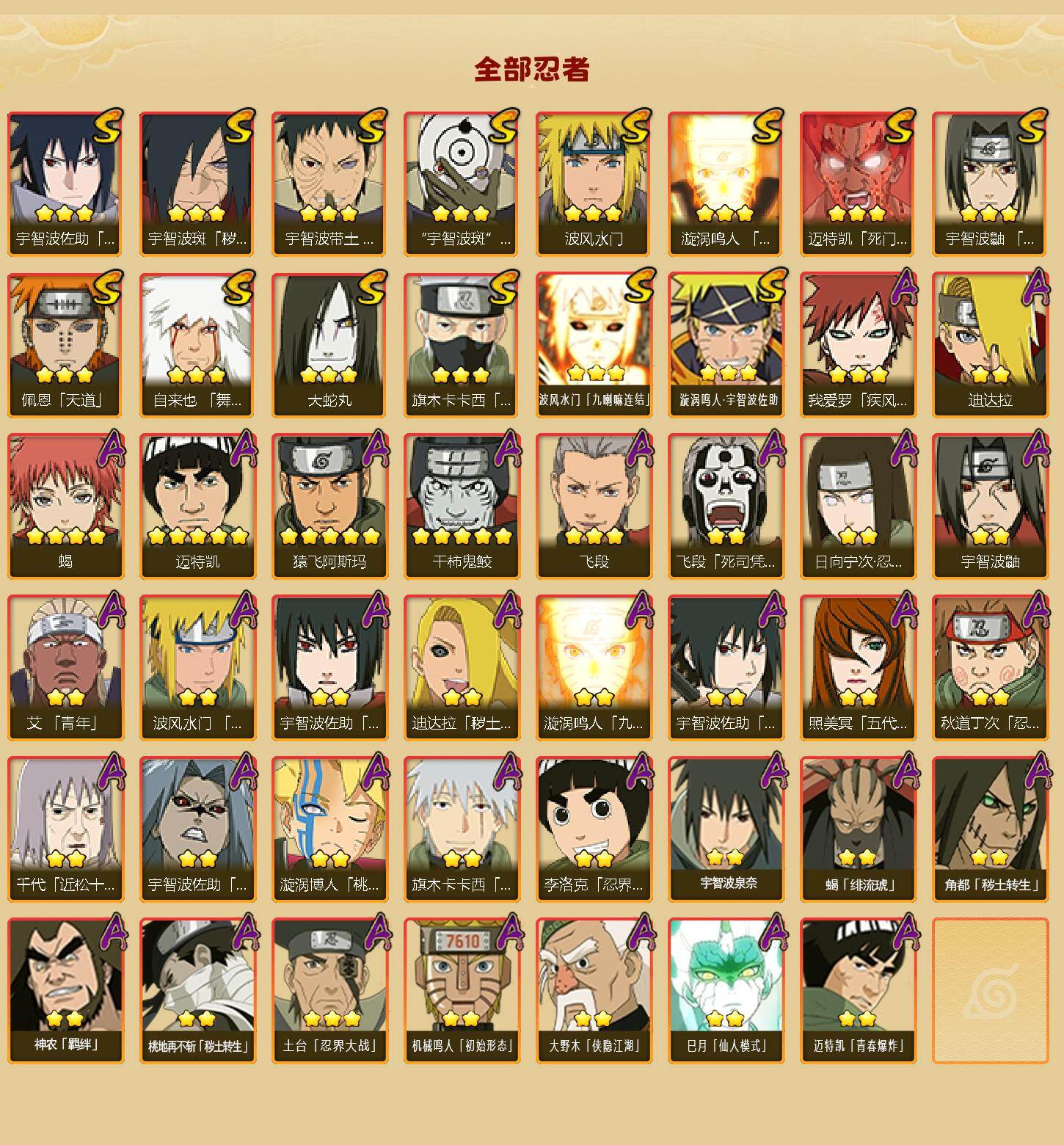 【S级忍者】:宇智波斑「秽土转生·解」(3星),宇智波带土「忍界大战」(3星),宇智波鼬「须佐能乎」(3星),旗木卡卡西「须佐能乎」(3星),自来也「舞之豪杰」(3星),大蛇丸(3星),波风水门(3星),漩涡鸣人「九喇嘛连结」(3星),迈特凯「死门」(3星