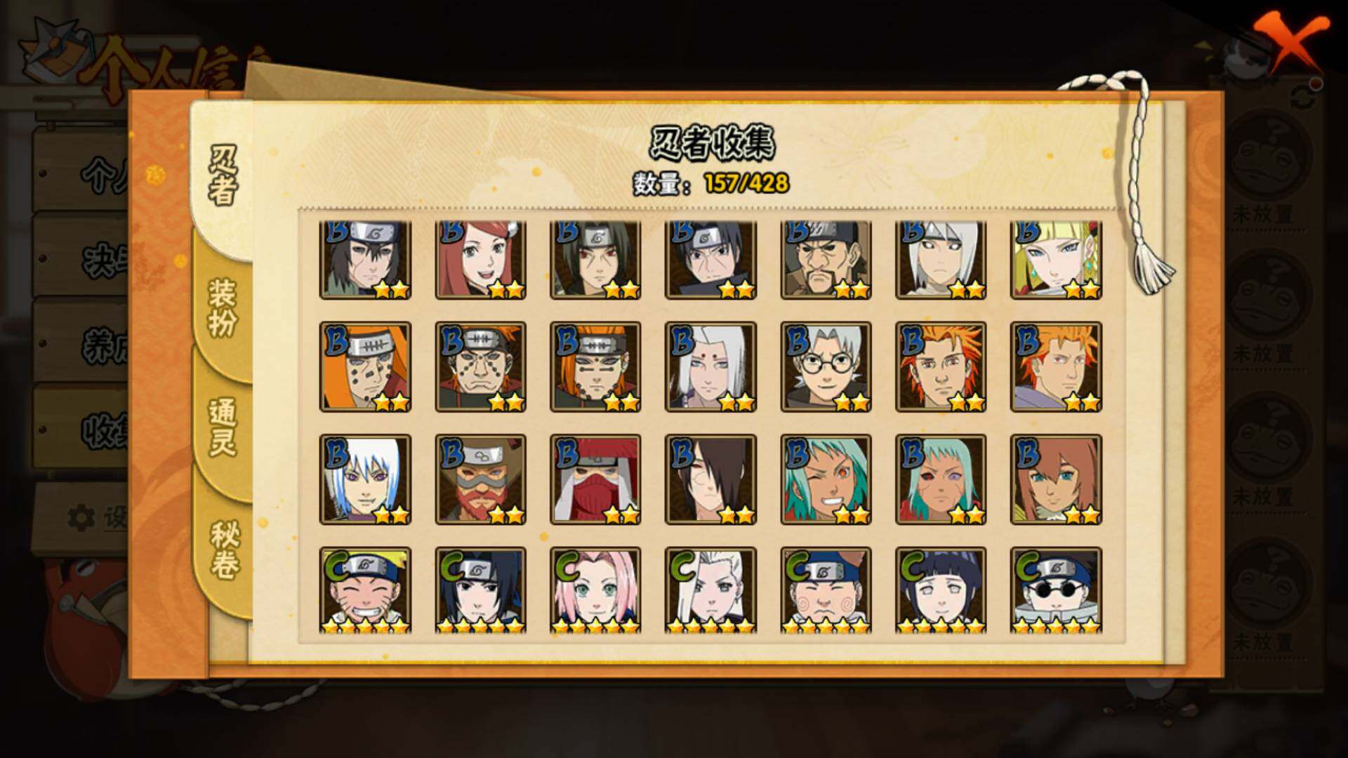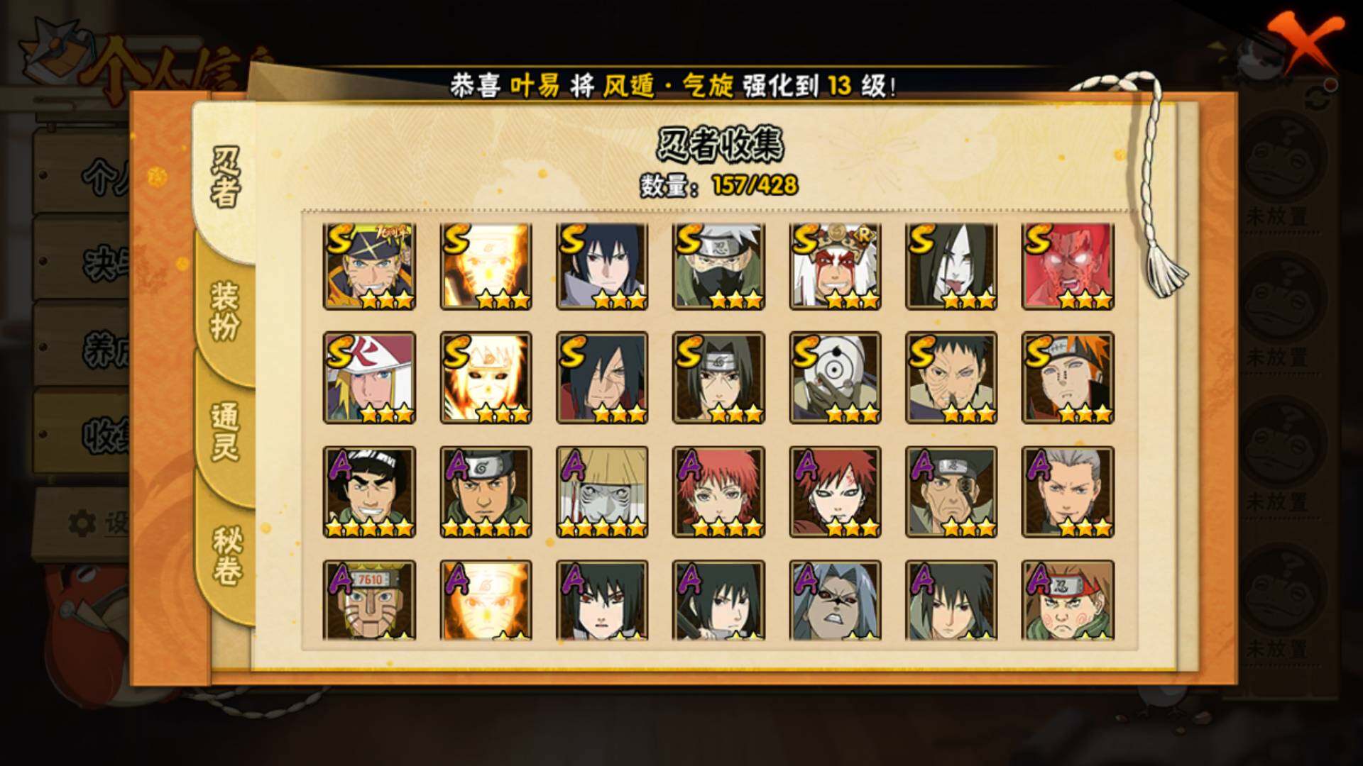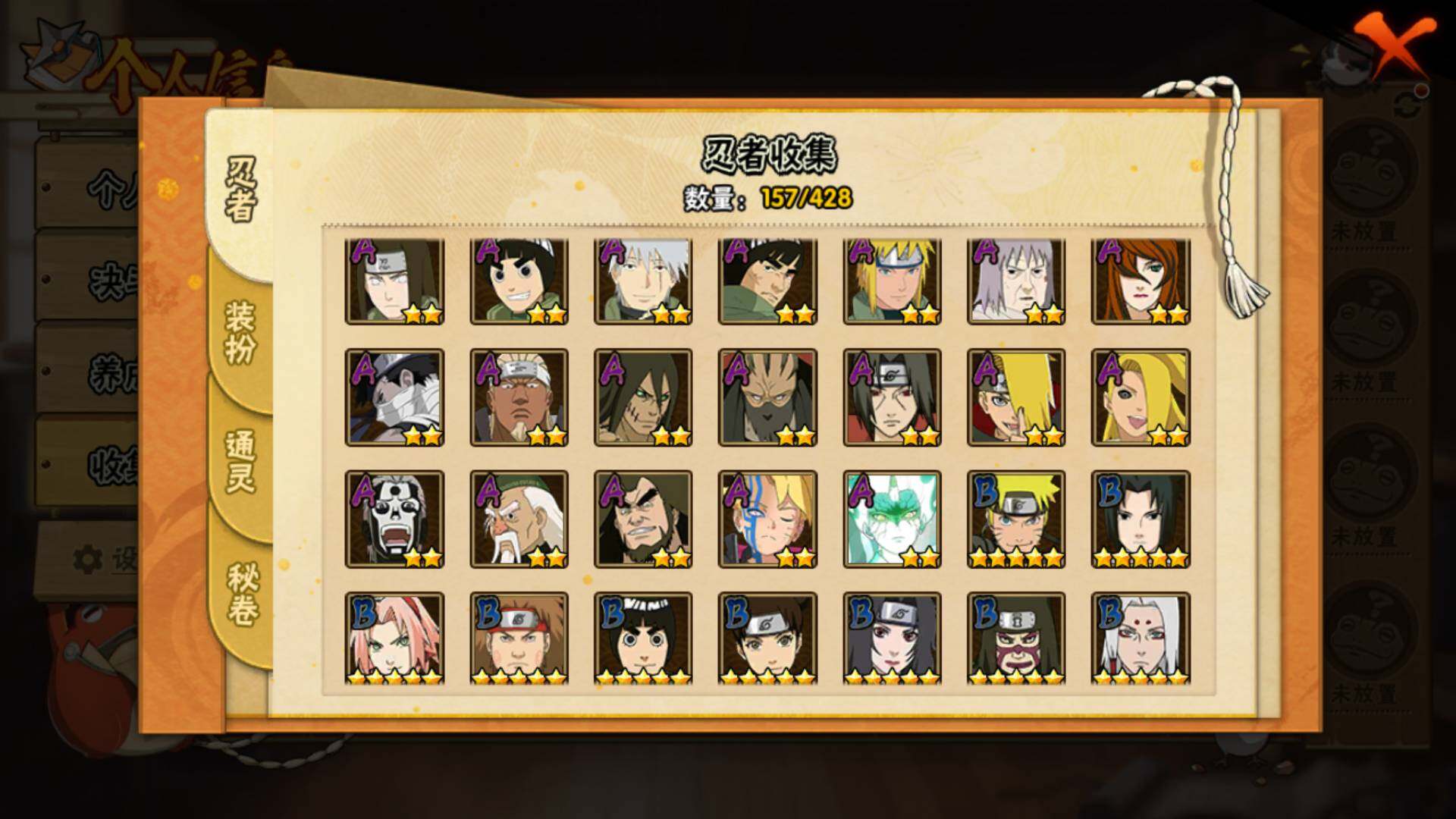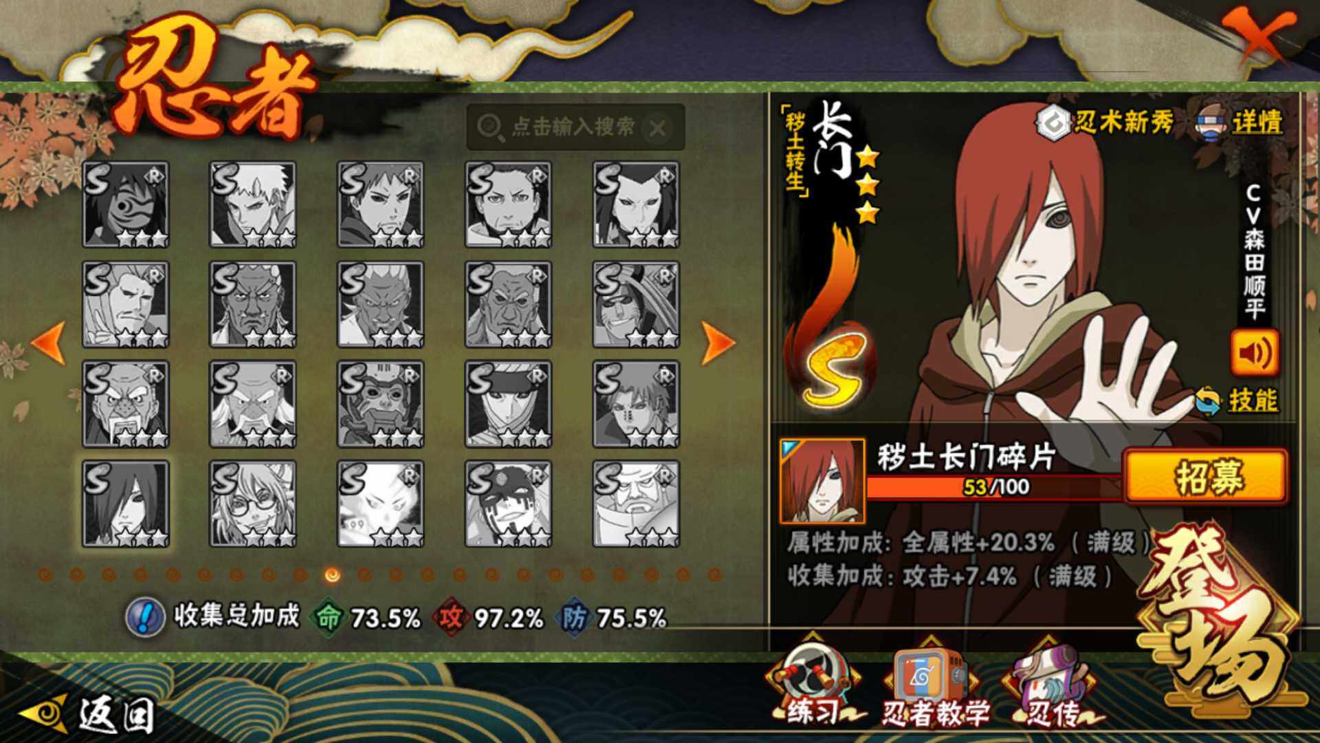 【S级忍者】:宇智波斑「秽土转生·解」(3星),宇智波带土「忍界大战」(3星),宇智波鼬「须佐能乎」(3星),旗木卡卡西「须佐能乎」(3星),自来也「舞之豪杰」(3星),大蛇丸(3星),波风水门(3星),漩涡鸣人「九喇嘛连结」(3星),迈特凯「死门」(3星