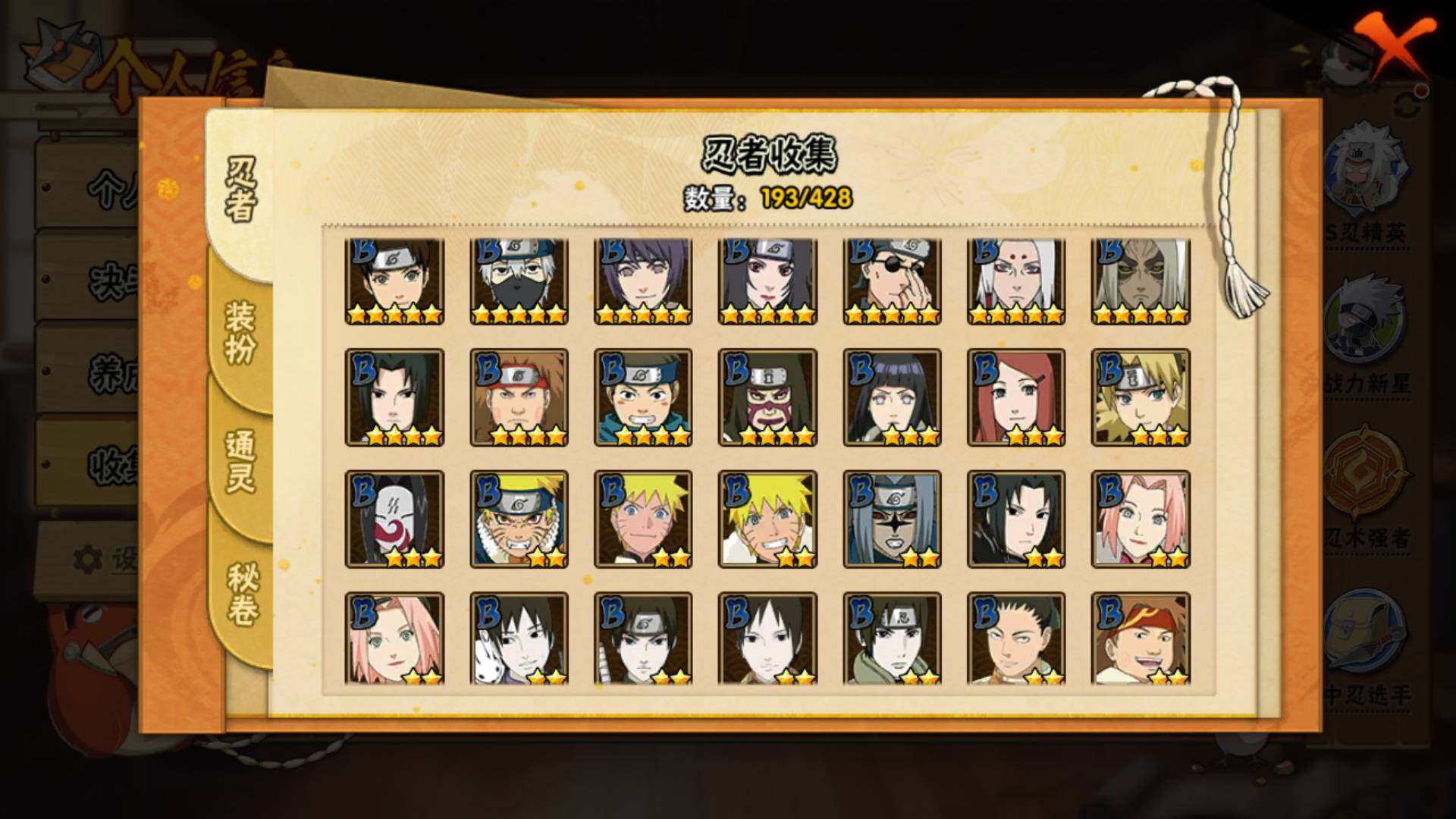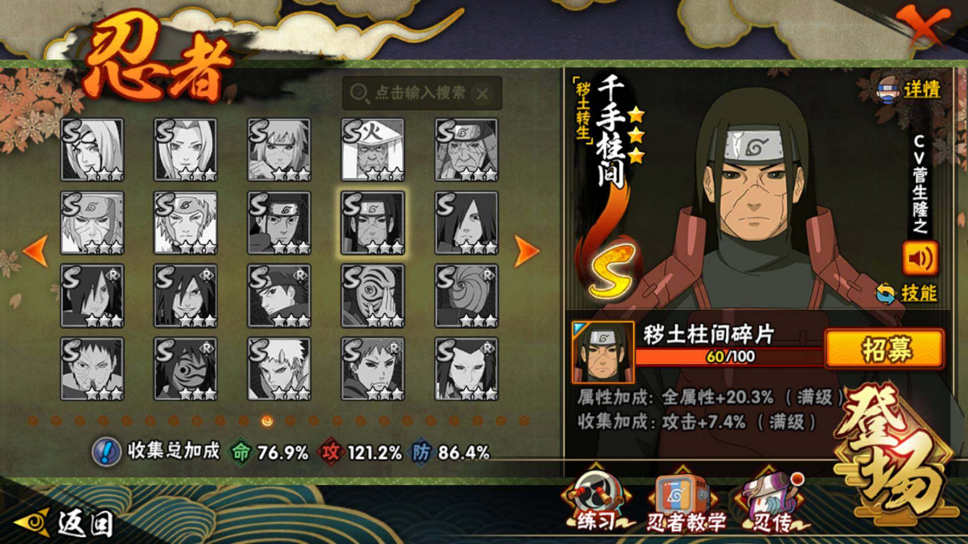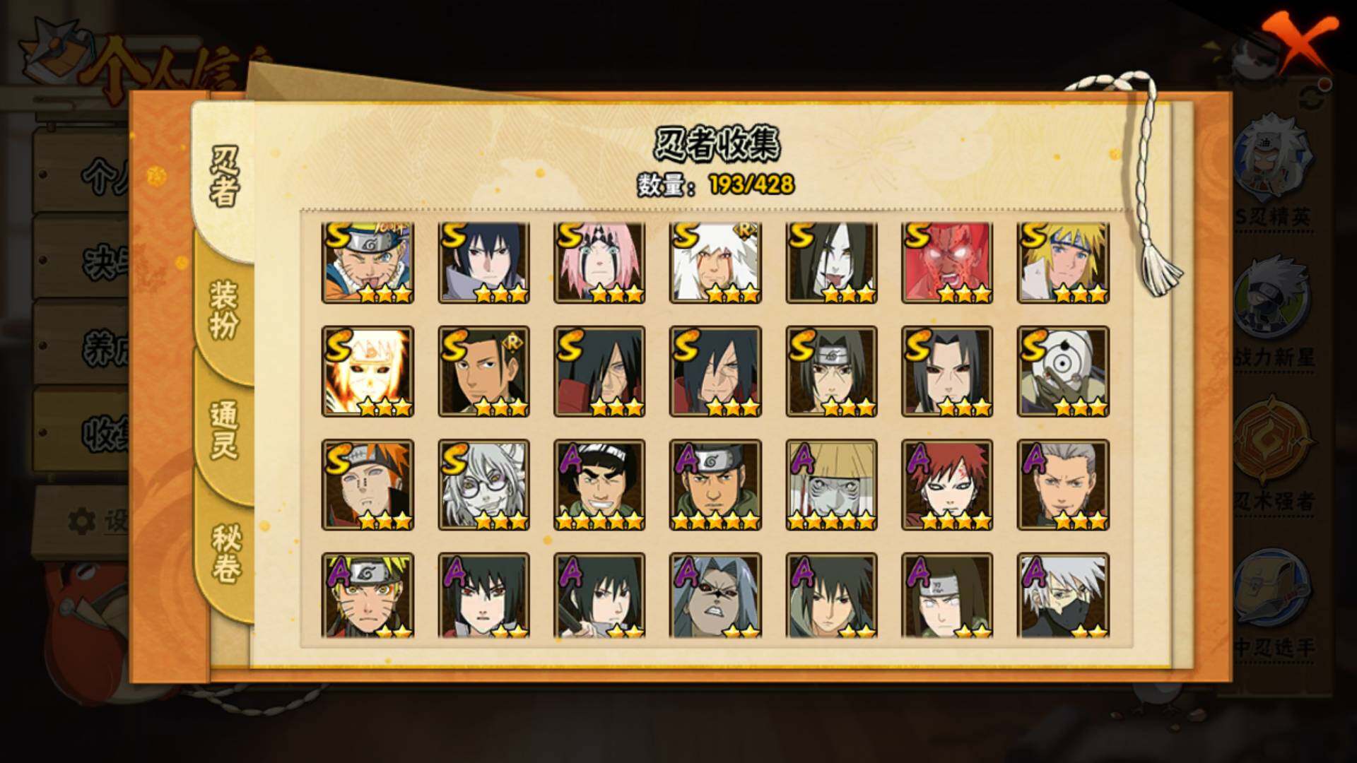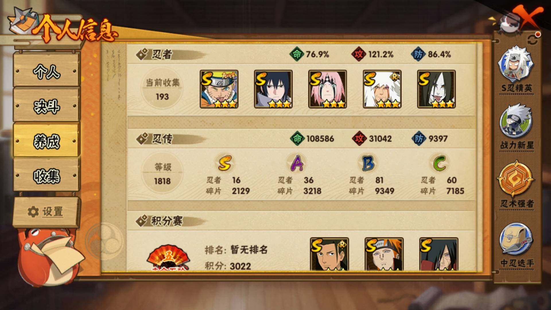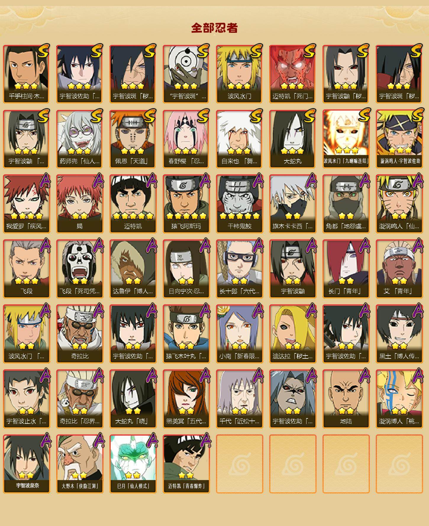 【S级忍者】:宇智波鼬「秽土转生」(3星),宇智波斑「秽土转生」(3星),宇智波斑「秽土转生·解」(3星),春野樱「忍界大战」(3星),宇智波鼬「须佐能乎」(3星),千手柱间「木叶创立」(3星),自来也「舞之豪杰」(3星)