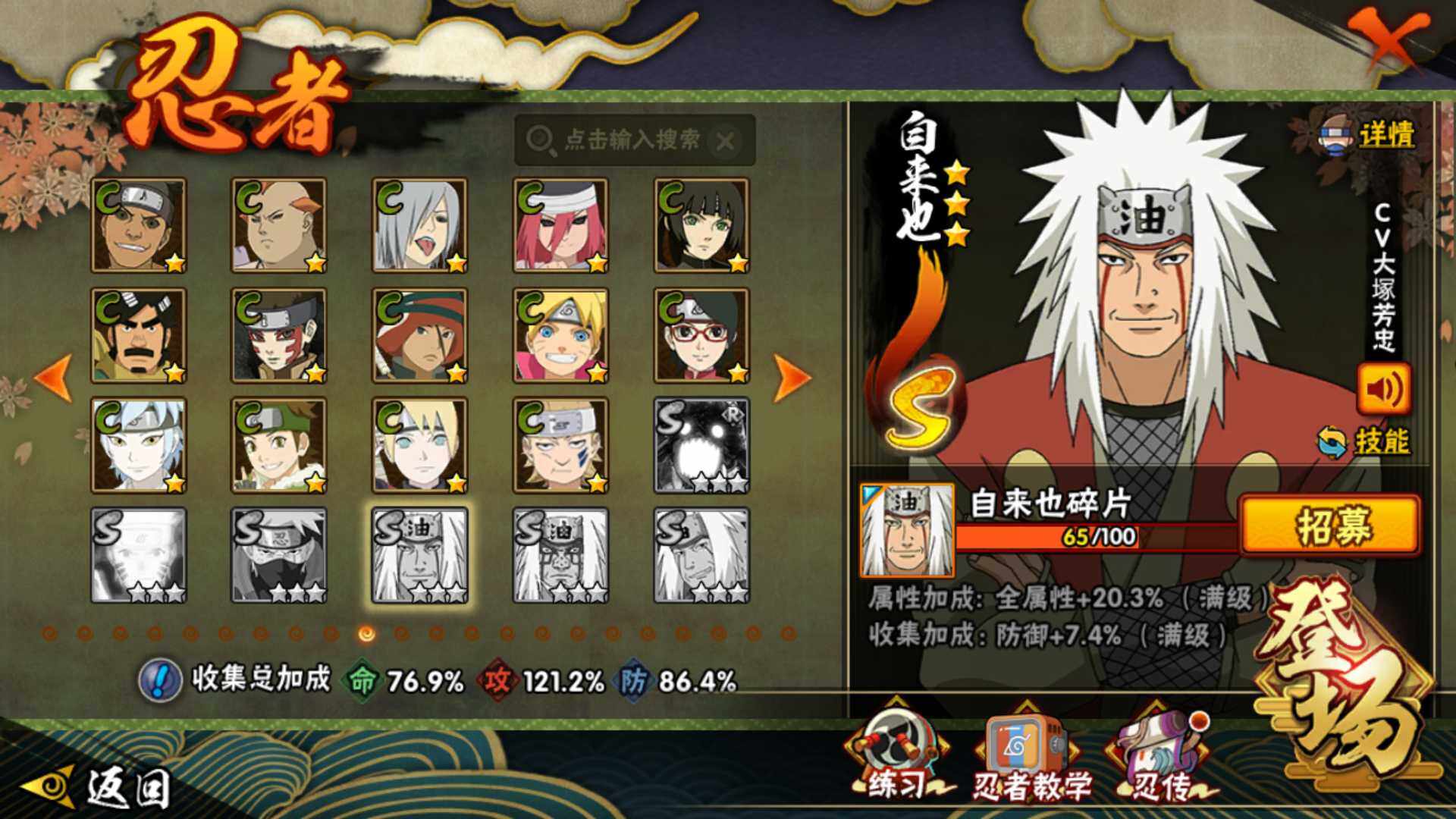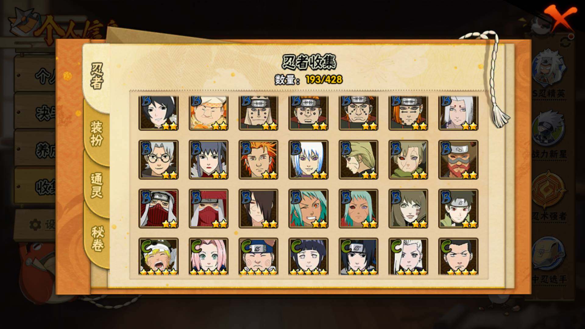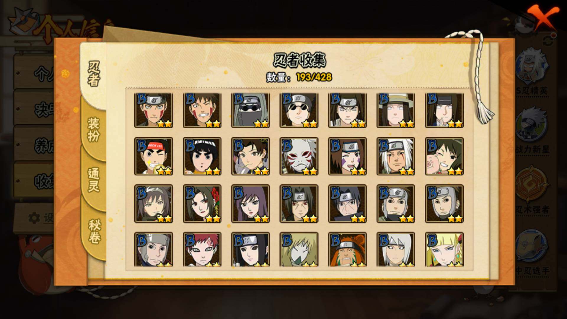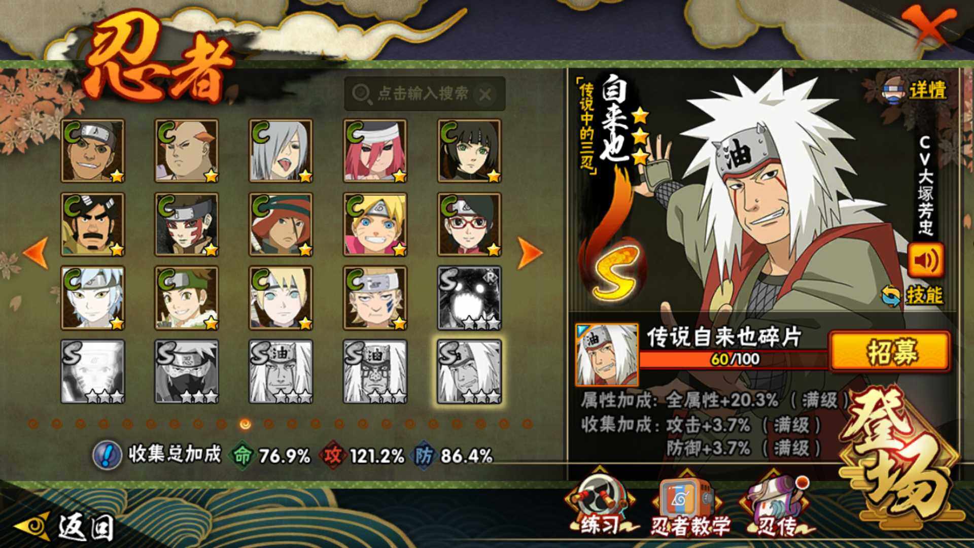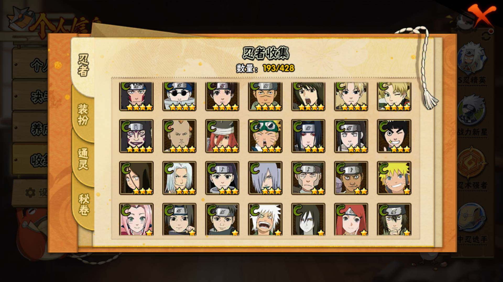 【S级忍者】:宇智波鼬「秽土转生」(3星),宇智波斑「秽土转生」(3星),宇智波斑「秽土转生·解」(3星),春野樱「忍界大战」(3星),宇智波鼬「须佐能乎」(3星),千手柱间「木叶创立」(3星),自来也「舞之豪杰」(3星)