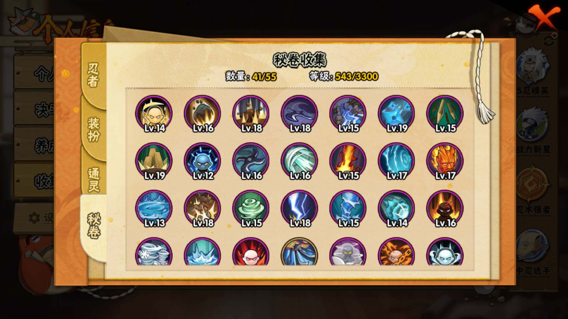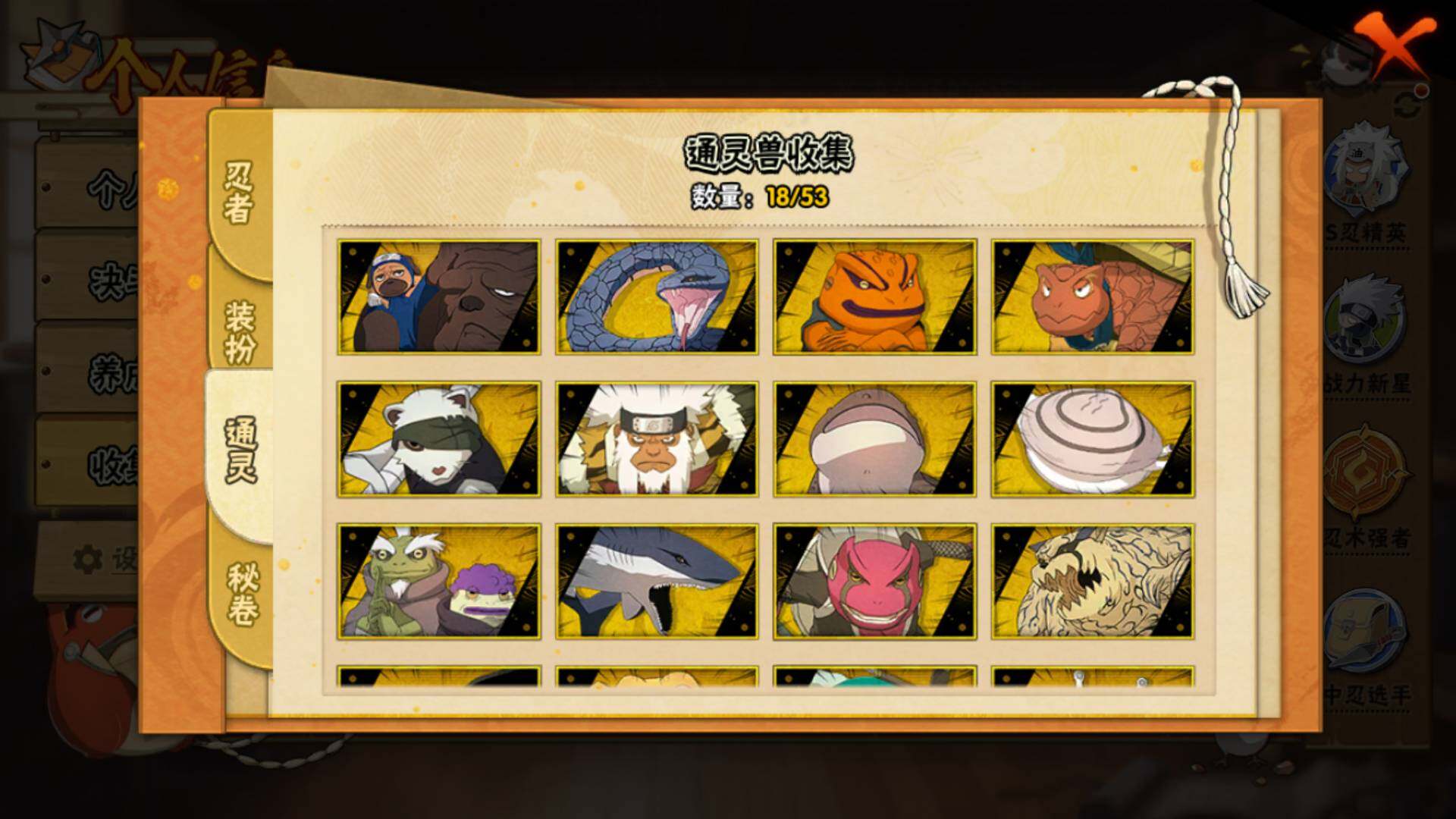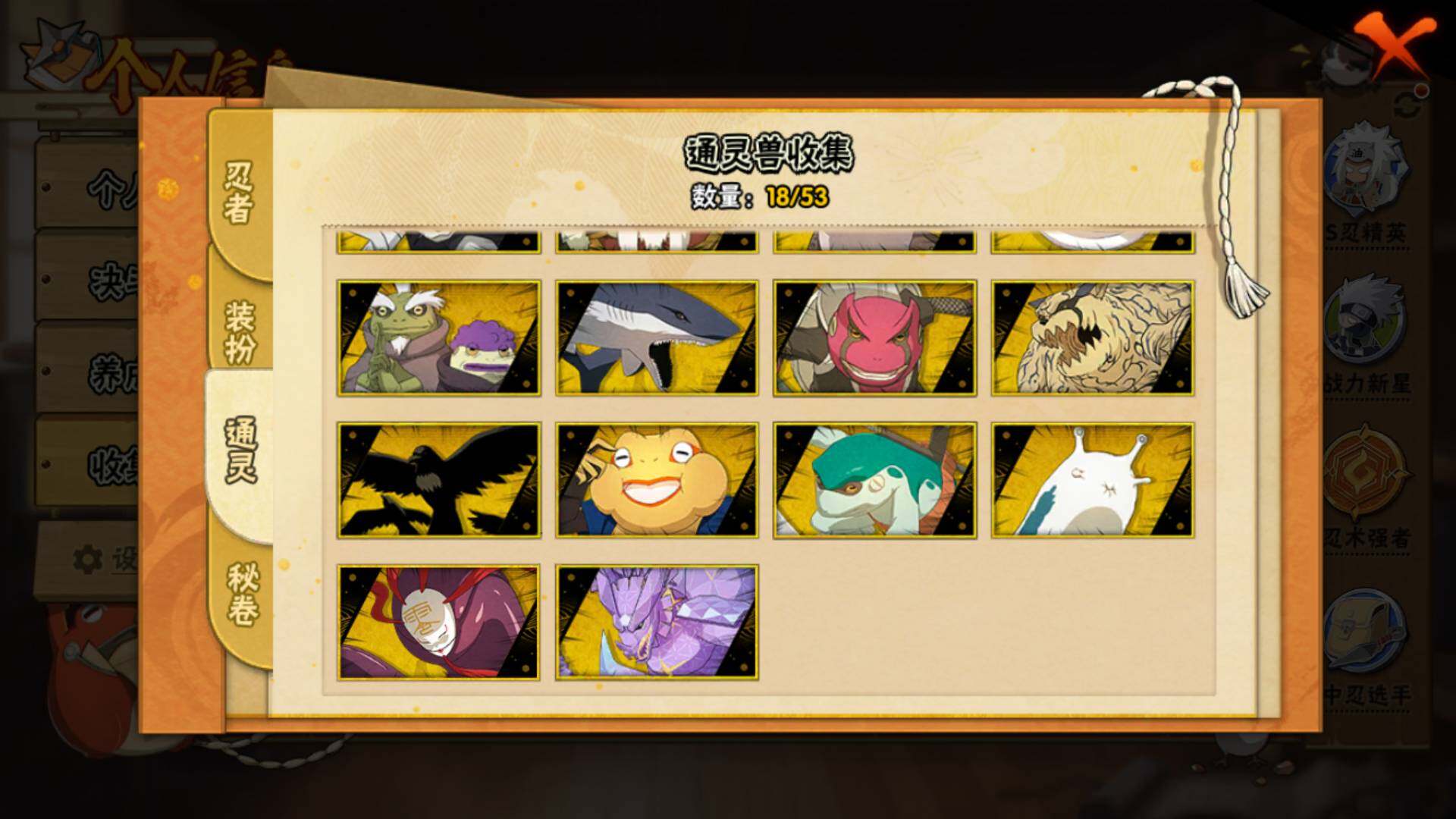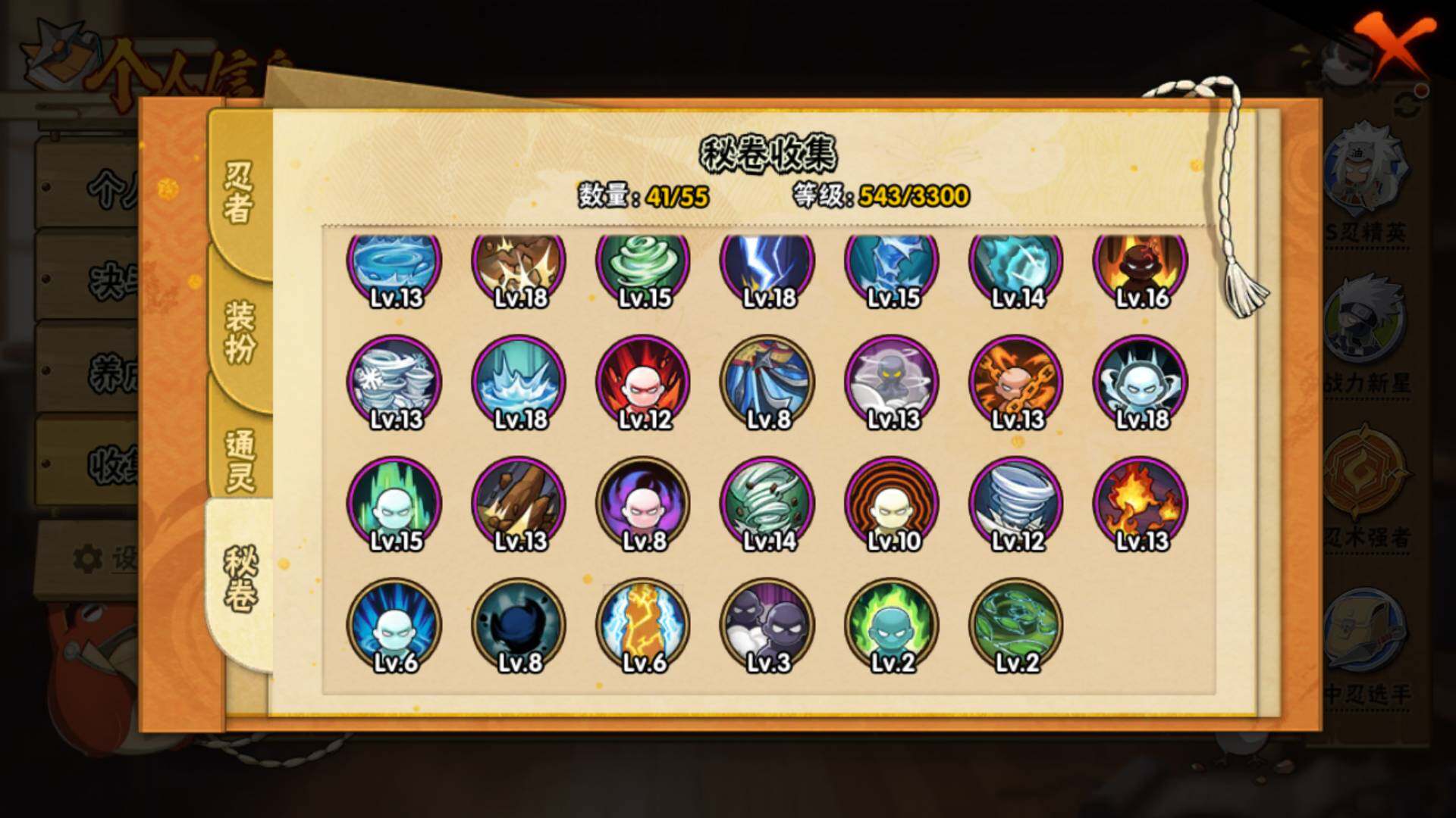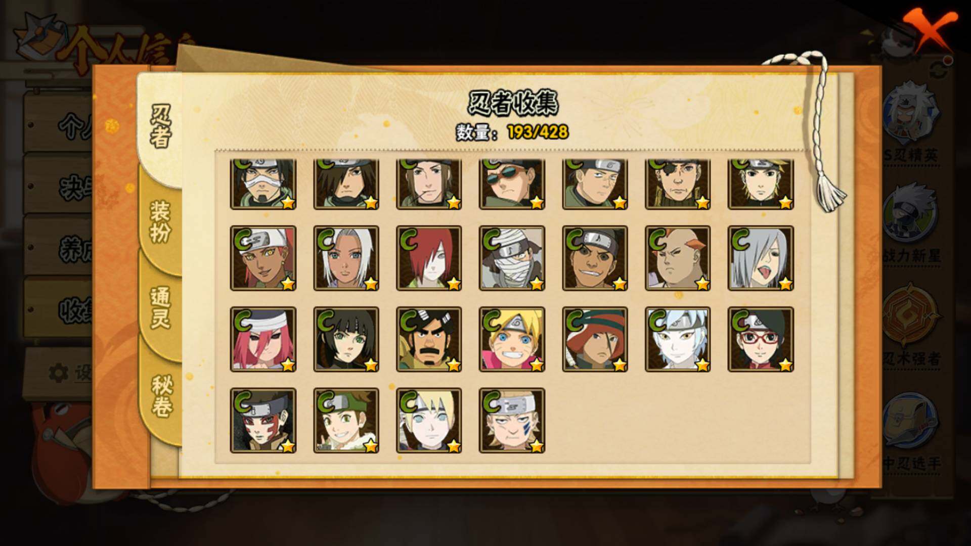 【S级忍者】:宇智波鼬「秽土转生」(3星),宇智波斑「秽土转生」(3星),宇智波斑「秽土转生·解」(3星),春野樱「忍界大战」(3星),宇智波鼬「须佐能乎」(3星),千手柱间「木叶创立」(3星),自来也「舞之豪杰」(3星)