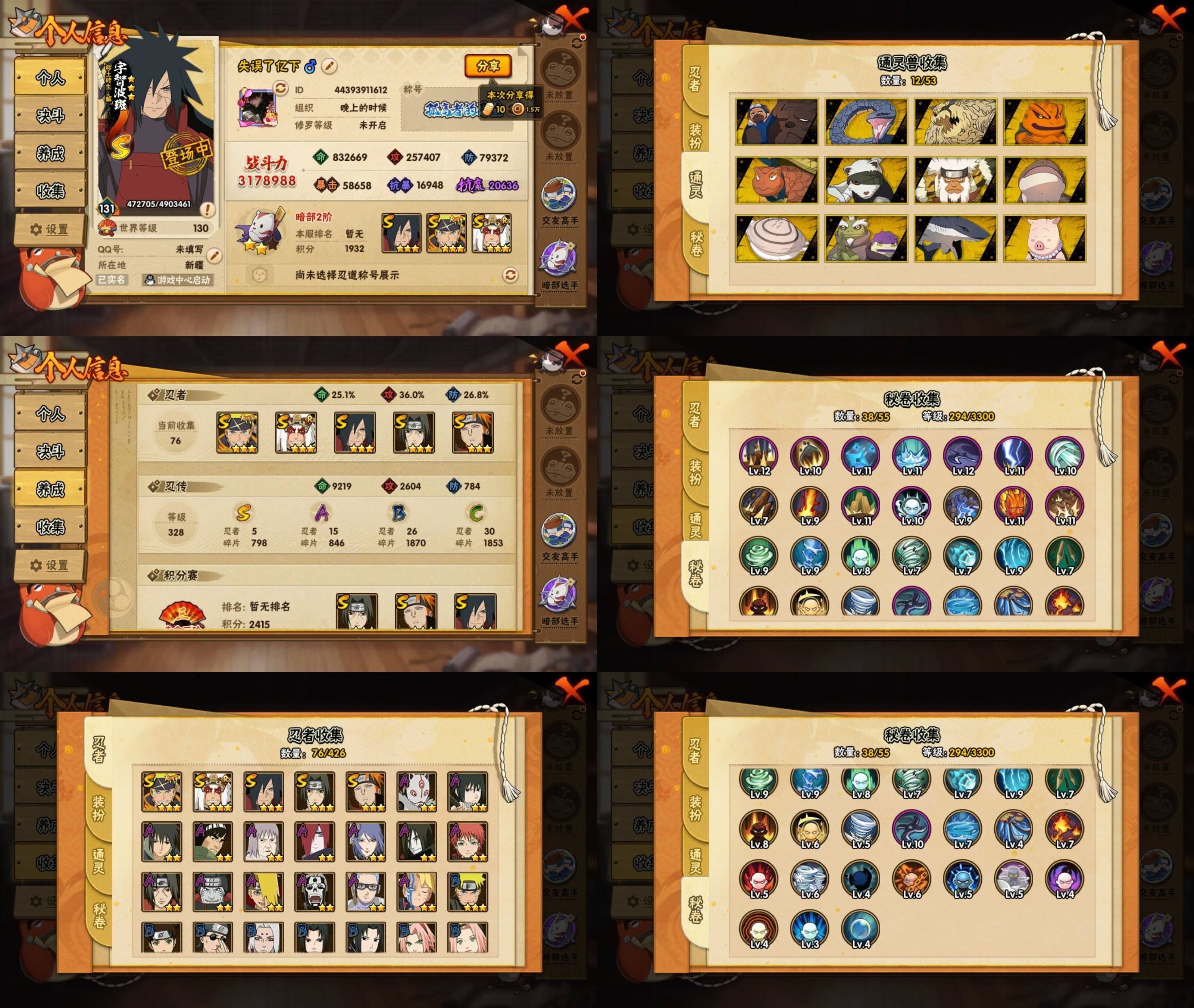 5S忍/15A忍/战力317W/V4/区服3939 【S忍者】宇智波佐助「漩涡鸣人」,宇智波斑「秽土转生·解」,自来也「舞之豪杰」,宇智波鼬「须佐能乎」,佩恩「天道」, 【 大蛇丸「晓」,飞段「S