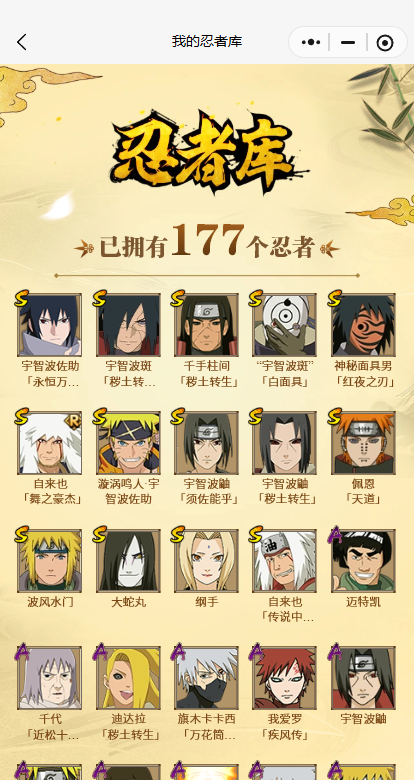 【S忍者】宇智波佐助「漩涡鸣人」,宇智波斑「秽土转生·解」,宇智波佐助「永恒万花筒」,神秘面具男「红夜之刃」,千手柱间「秽土转生」,自来也「舞之豪杰」,自来也「传说中的三忍」,宇智波鼬「秽土转生」,宇智波斑「白面具」,宇智波鼬「须佐能乎」,佩恩「天道」,波风水门,大蛇丸,纲手,