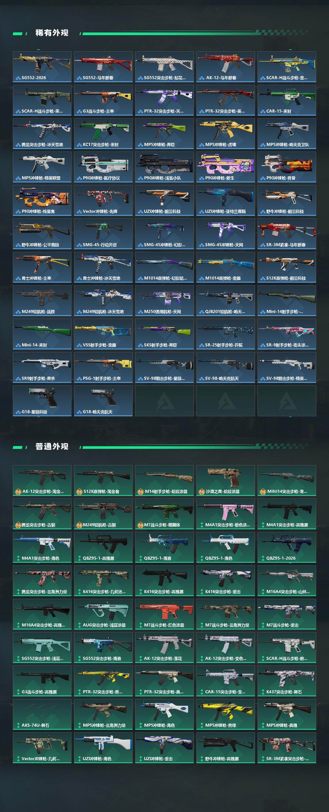 【传说外观】:M4A1突击步枪-阿米娅,AKM突击步枪-锦绣,ASh-12战斗步枪-鹅鸭杀,SG552突击步枪-运动员,AK-12突击步枪-特斯拉线圈,SCAR-H战斗步