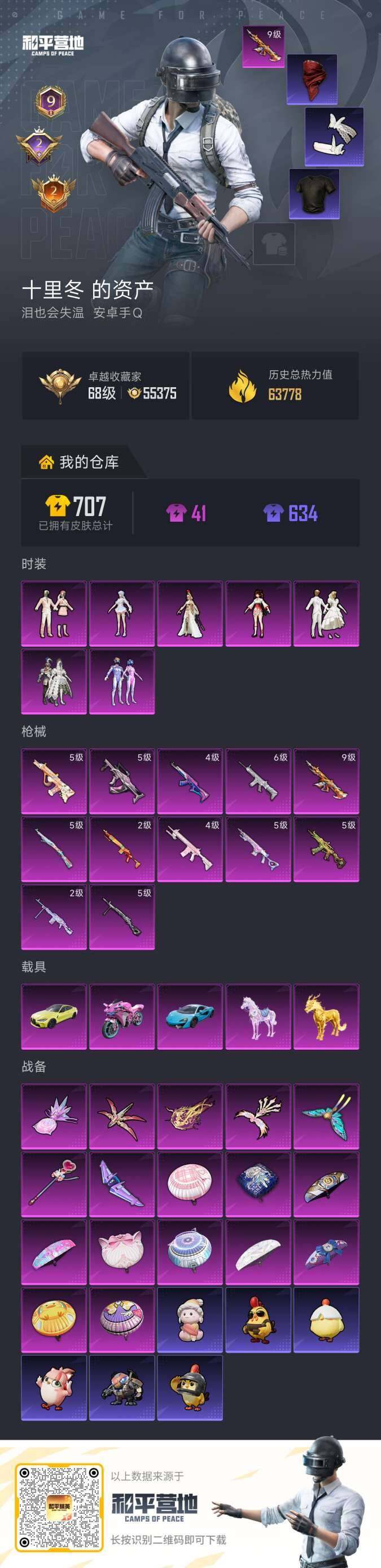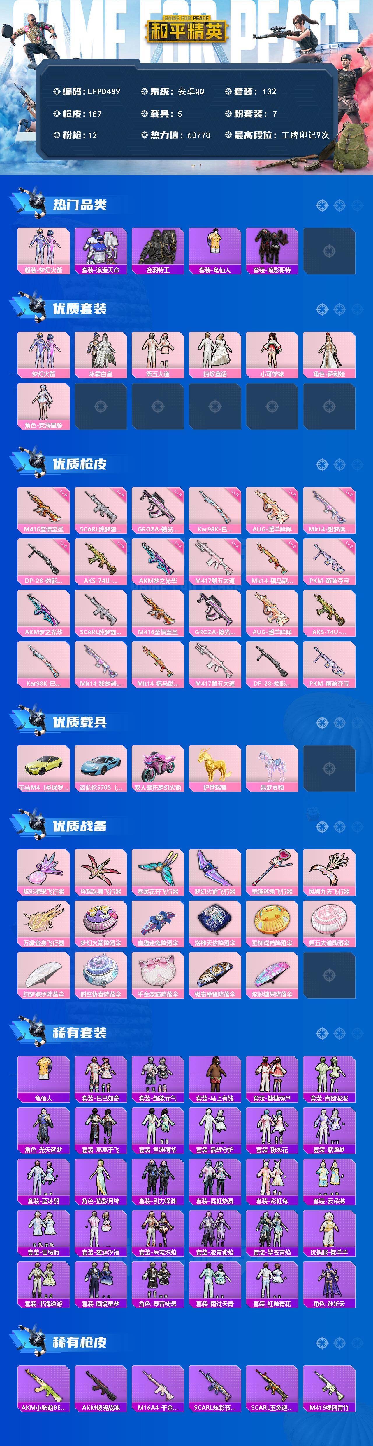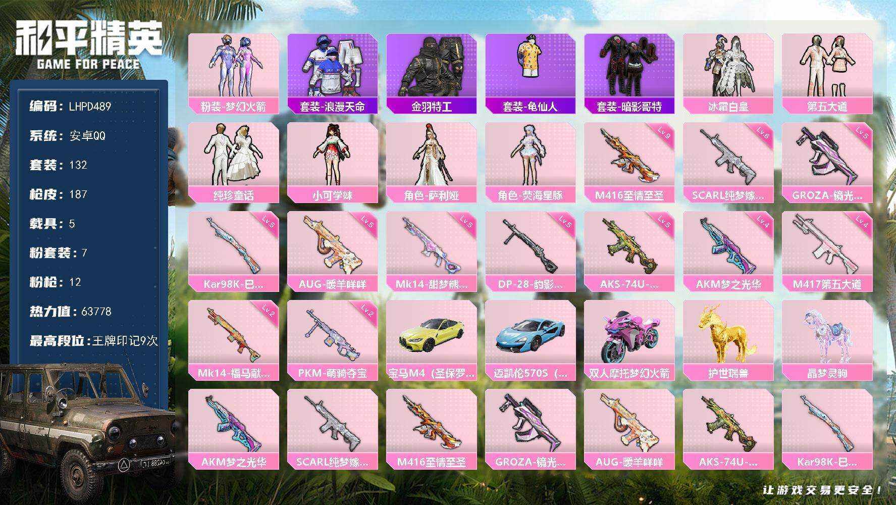 【店主推荐捡漏号!可直接换绑】安卓 手Q-7粉装-12特效枪-5载具-7粉色飞行器-63778热力值-9王牌印记-132套装-187枪皮【热门品类】:粉装-梦幻火箭,套装-浪漫天命,套装-金羽特工,套装-龟仙人,套装-暗影哥特【粉色套装】:粉装-梦幻火箭,粉装-冰霜白皇,粉装-第五大道,粉装-纯珍童话,角色-小可学妹,角色-萨利娅,角色-荧海星豚【粉色枪皮等级】:AKM-梦之光华(四级),SCA