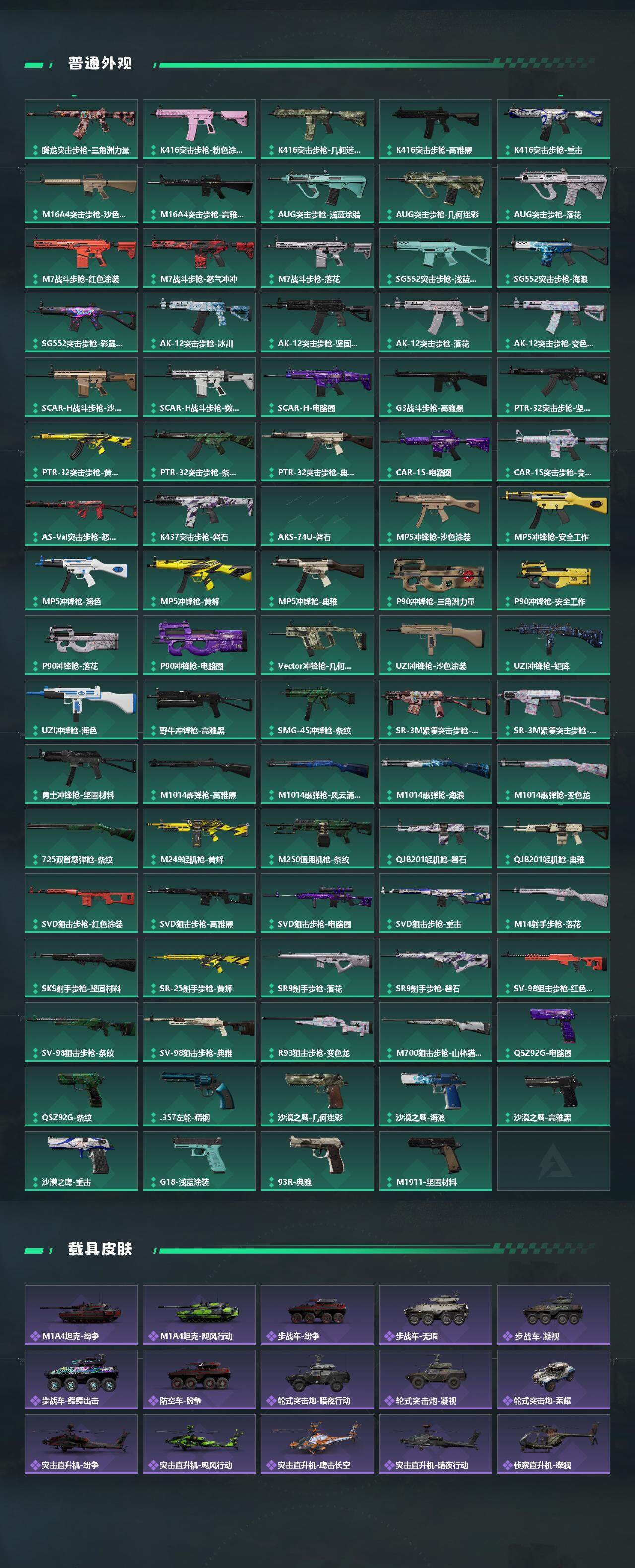 【传说外观】:M4A1突击步枪-蚀金玫瑰,M4A1突击步枪-阿米娅,AKM突击步枪-锦绣,QBZ95-1突击步枪-破军,ASh-12战斗步枪-鹅鸭杀,SG552突击步枪-运动员,AK-12突击步枪-夜鹰,S