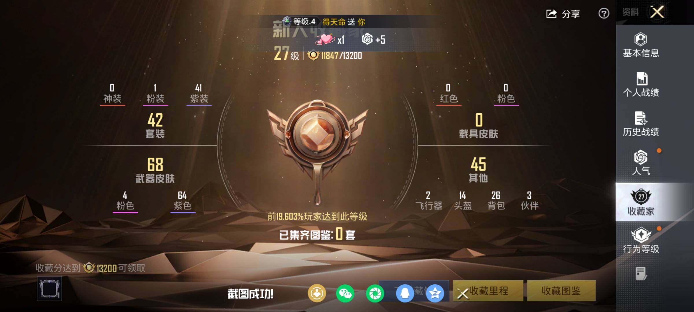 1粉装-4特效枪-0载具-0粉色飞行器-18493热力值-3王牌印记-42套装-72枪皮