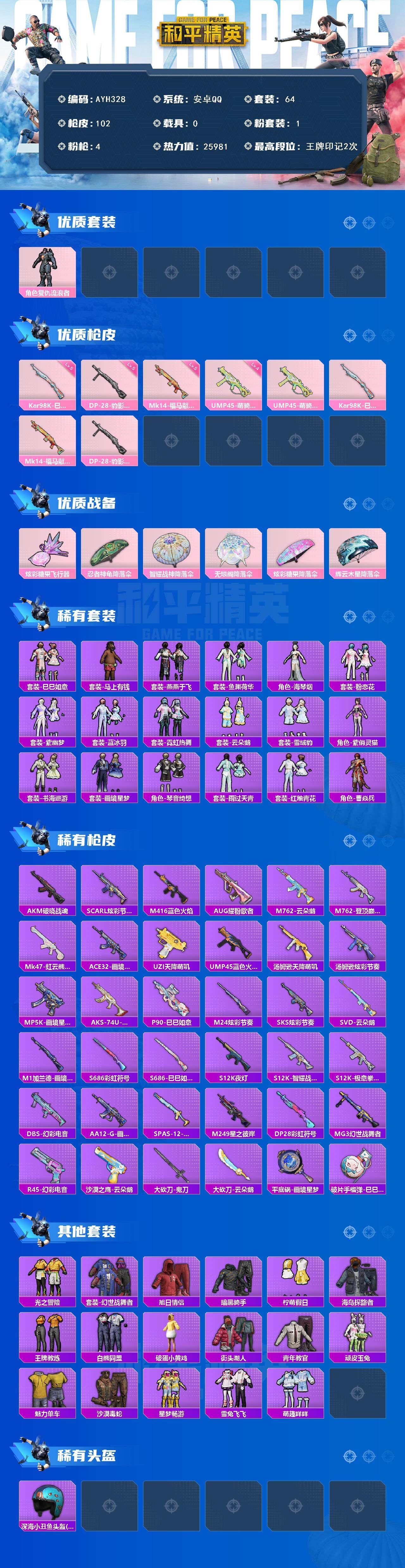 【店主推荐捡漏号】安卓 手Q-1粉装-4特效枪-0载具-1粉色飞行器-25981热力值-2王牌印记-64套装-102枪皮【粉色套装】:角色-复仇流浪者【粉色枪皮等级】:UMP45-萌骑冒险(四级),Kar98K-巳巳如意(五级),Mk14-福马献瑞(五级),DP-28-豹影疾电(五级)【粉色枪皮】:UMP45-萌骑冒险,Kar98K-巳巳如意,Mk14-福马献瑞,DP-28-豹影疾电